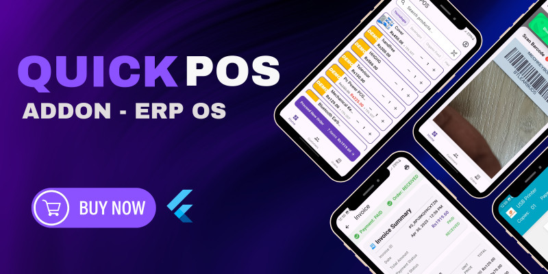 ERP OS - Quick POS Flutter Application. Quick POS is a powerful Android add-on for ERP OS that turns your mobile device into a complete Point of Sale system. Scan barcode
