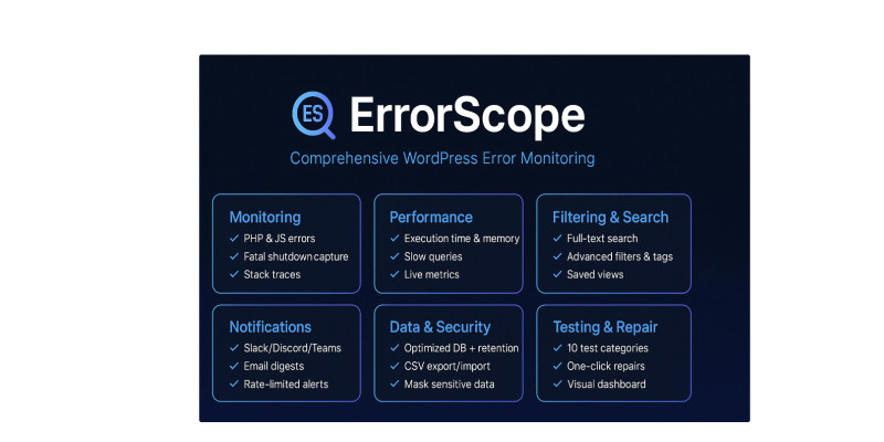 ErrorScope - WordPress Error Monitoring. Comprehensive error tracking, performance monitoring, and debugging solution for WordPress sites.