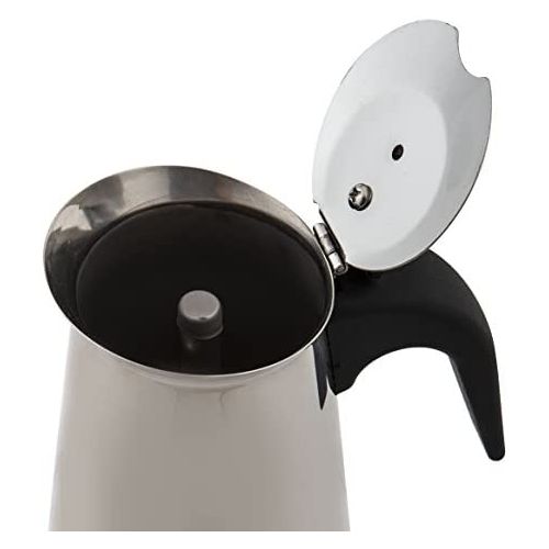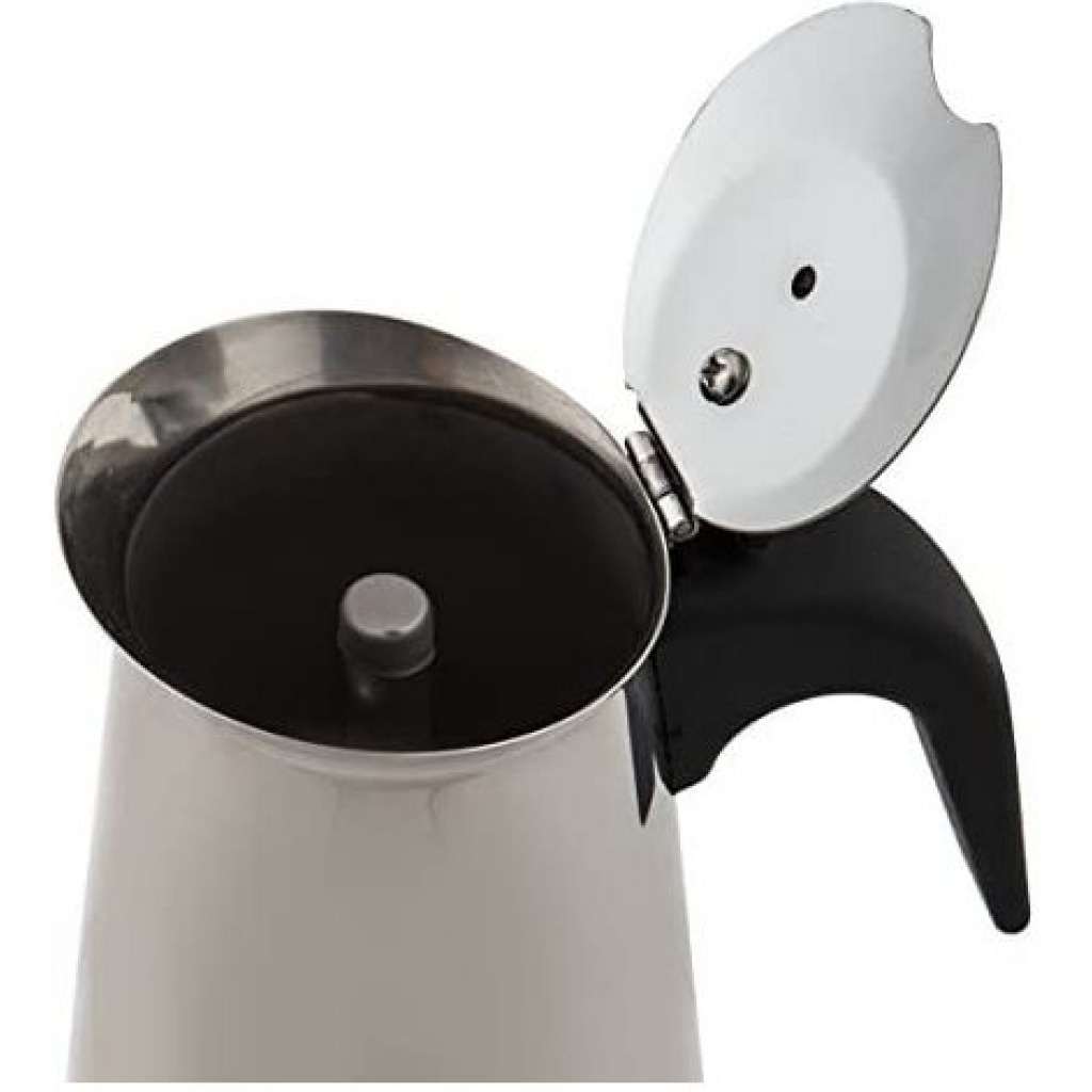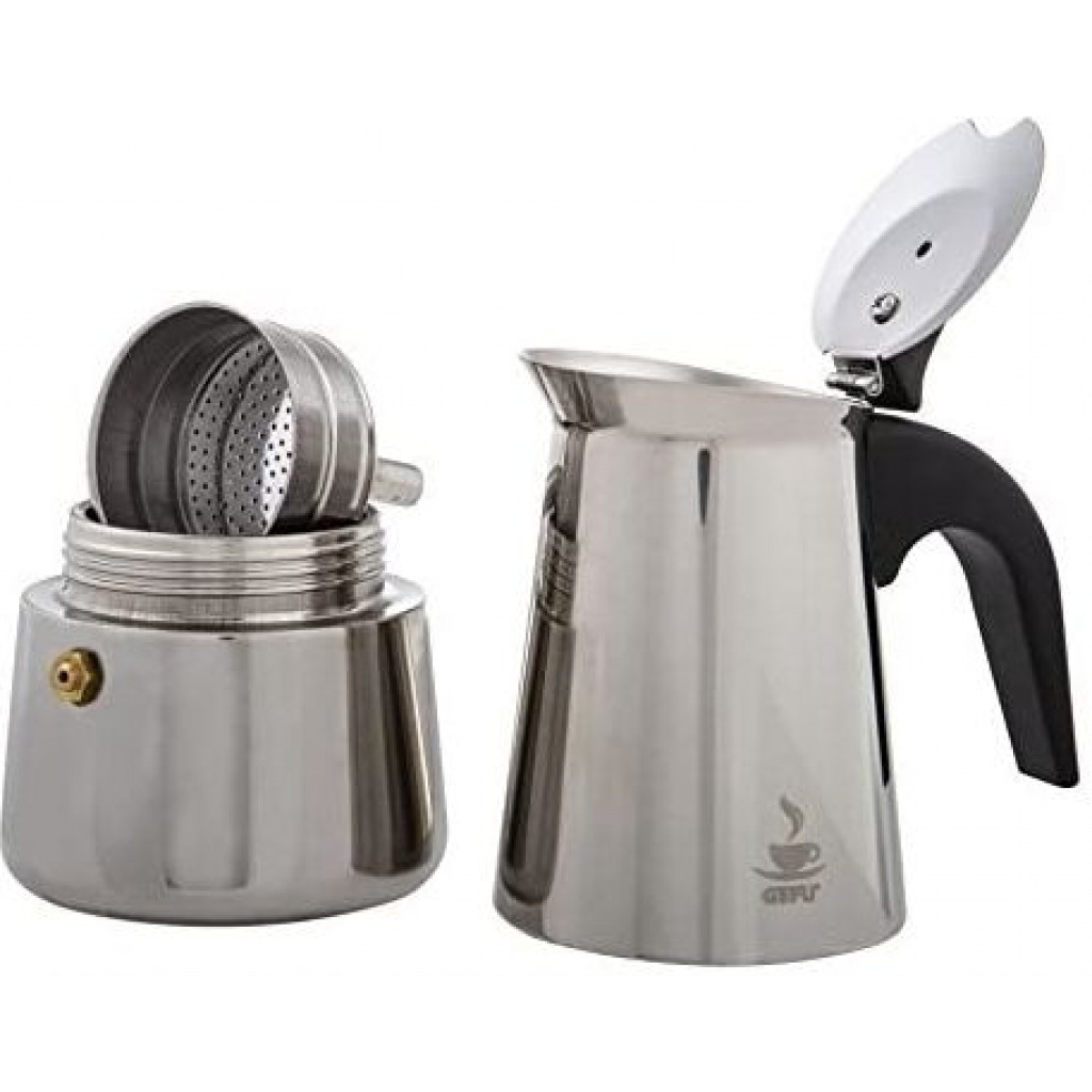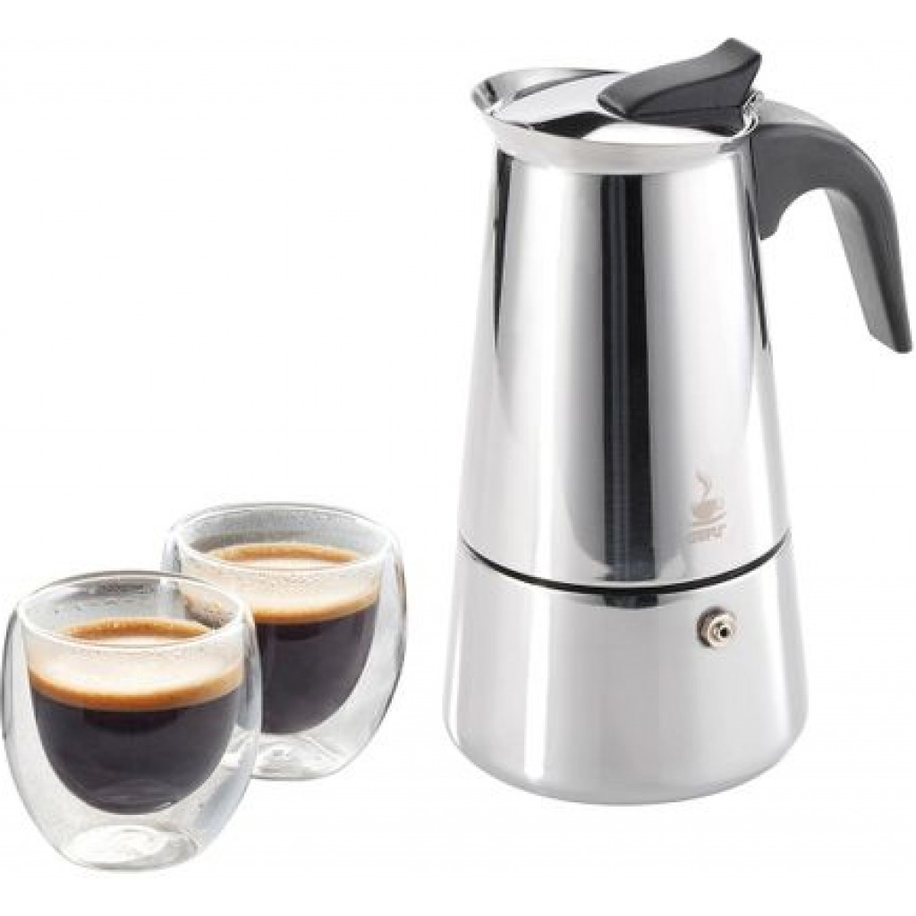 Espresso Maker Emilio for 4 Cups, Stainless Steel, Silver With GEFU’s espresso maker you can brew delicious, aromatic espresso is no time at all. The modern, tall device is made of stainless steel and features a black heat-insulated handle. Just pour in water and the ground coffee beans, screw together and boil on the stove until the fragrant coffee is ready – then simply savour it! Key Features: 2 double-walled espresso glasses included For brewing fresh espresso Suited for electrical, gas, induction and vitro ceramic stoves Pouring spout Stainless steel, plastic Dishwasher-safe