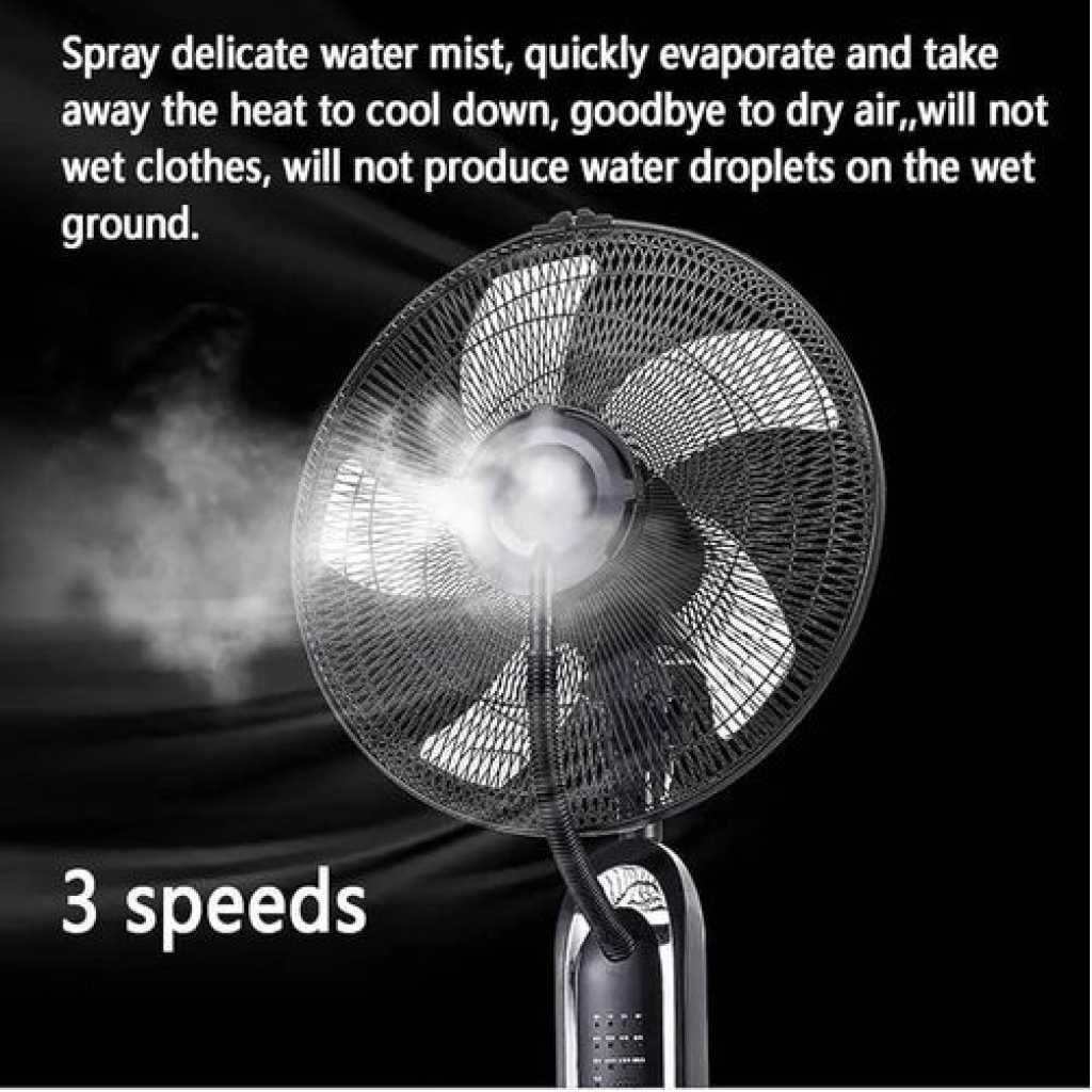 Welcome to my store! Our misting fan is a product that utilizes water to cool down by taking away heat from the surrounding environment when it evaporates. It is suitable for factories, outdoor restaurants, residential courtyards, medium-sized offices, exhibition halls, clubs, home shopping malls, electronic entertainment facilities, Internet cafes, commercial facilities, gymnasiums, and sports facilities. product name:spray fan Wind speed range:3rd gear wind speed operate:Button+remote 6-meter remote control frequency:50Hz-60Hz rated power:75W Water tank capacity: 4L Maximum fog for up to 19 hours Fan blades: 5 Timed: 7.5 hours Base: Universal wheel moves 360 degrees Power cord length: 1.7 m Main functions: cooling, humidification, ventilation. 1. Portable spray fan: 3 wind speeds, 4L large capacity water tank, spraying delicate water mist, quickly evaporate and take away the heat to cool down, goodbye to dry air, will not hit the wet floor 5.Scope of application: used in hotels, restaurants, cafes, public places, stadiums, outdoor dining, greenhouse cultivation, livestock farms, farms and other green and dry areas. 4. Standing fan: 1.7m power cord, the bottom with universal wheels, suitable for a variety of scenes and easy to move; can be timed 0.5-7.5 hours 2. Oscillating fan: 5-piece fan, strong wind, oscillating can make the fan for a large area to provide ventilation, blowing air to the whole area, with spray function, can also increase humidity, keep comfortable. 3. Floor fan: within 6 meters can be controlled from a distance using a remote control, practical and convenient; lying in bed can be easily controlled