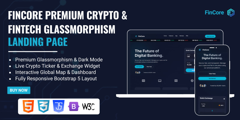 FinCore - Premium Crypto And Fintech Template. Modern, dark-mode Fintech & Crypto landing page features Glassmorphism design, live crypto ticker and exchange calculator.