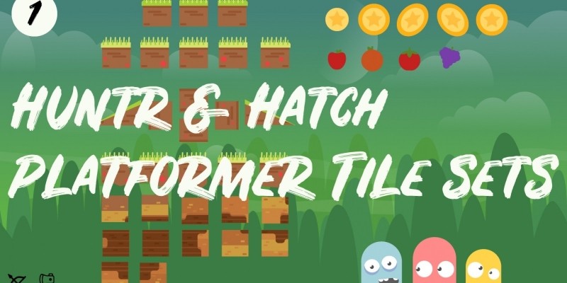 Flat Design - Tile Set. 28 Tiles, 3 Monsters, Coins, Fruit, and More