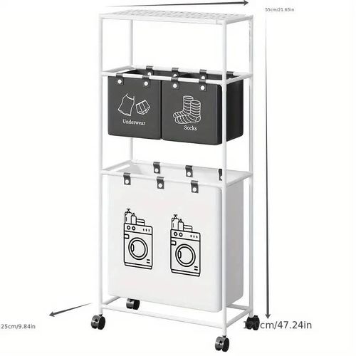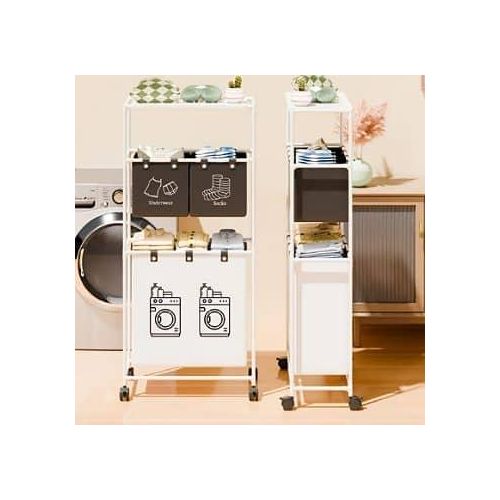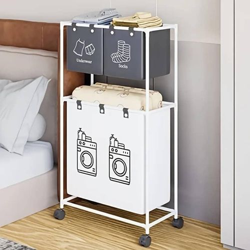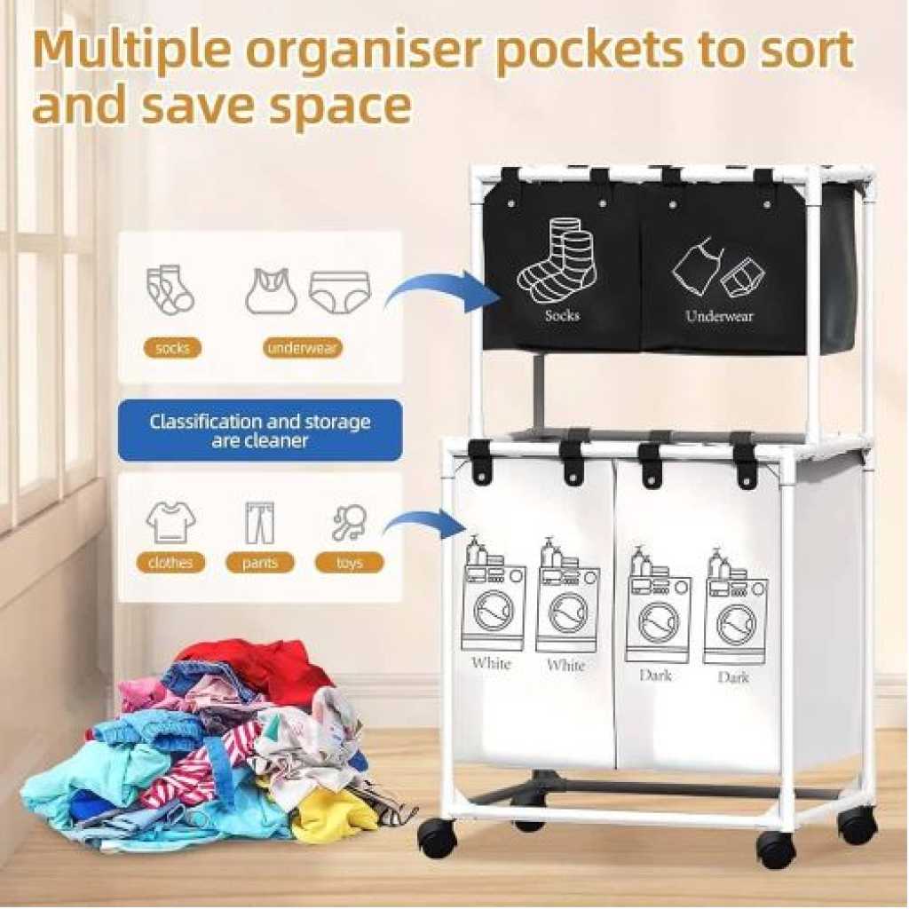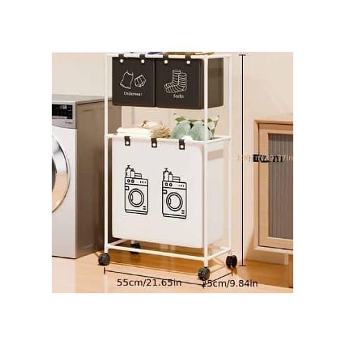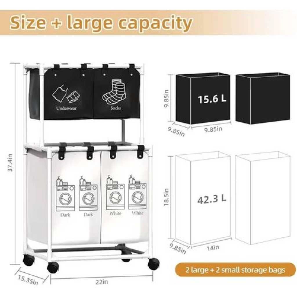 Key Features: Large Capacity Removable Waterproof Laundry Bag:This double laundry basket organizer has a total capacity of 19 gallons (86 liters) and each liner holds 3.5 gallons (15.62 liters) Zonal Dirty Laundry Bag:This double laundry basket organizer has a laundry bag to help you store bedding and clothes separately, and 2 small pockets to categorize small items like socks and underwear Flexible Casters For Easy Assembly:Flexible wheels for smooth transportation of laundry bags to the laundry room. 4 wheels are equipped with locking brakes. Assembly takes approximately 15 minutes according to detailed instructions. Package includes complete laundry sorter accessories and assembly tools. Sturdy And Pragmatic:Made of sturdy PVC material and waterproof cotton linen, this laundry organizer offers reliable strength and stability. The classic design helps prevent unwanted shaking or accidental tipping. Multi-Purpose Large Laundry Basket: This laundry hamper with shelf will fit perfectly into any room, bathroom and bedroom, helping you to hide clutter. It can be used as decoration and fits most home styles.