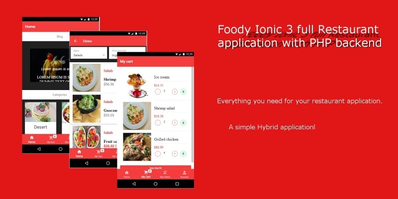 Foody Ionic 3 Full Restaurant App With PHP Backend. A simple hybrid restaurant application. Its simple and ergonomic interface allows the user a quick and easy handling. As a hybrid