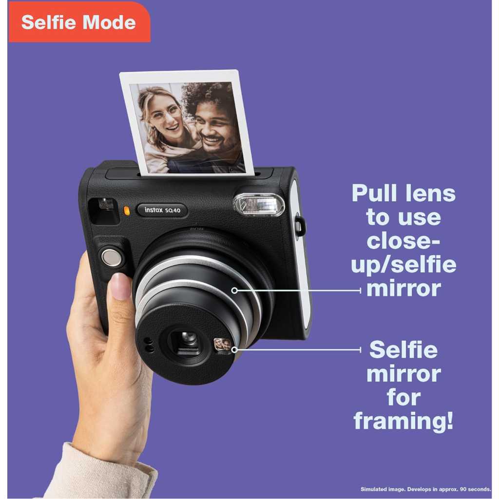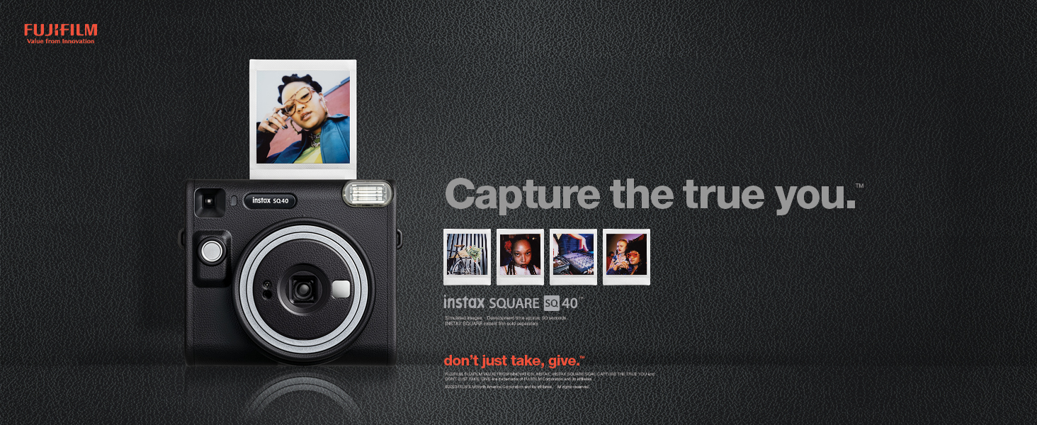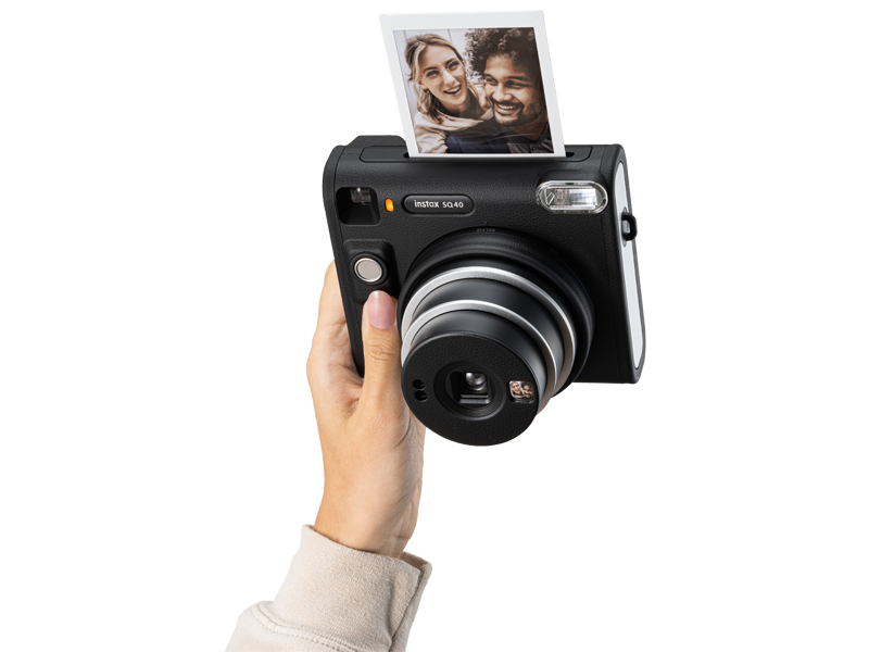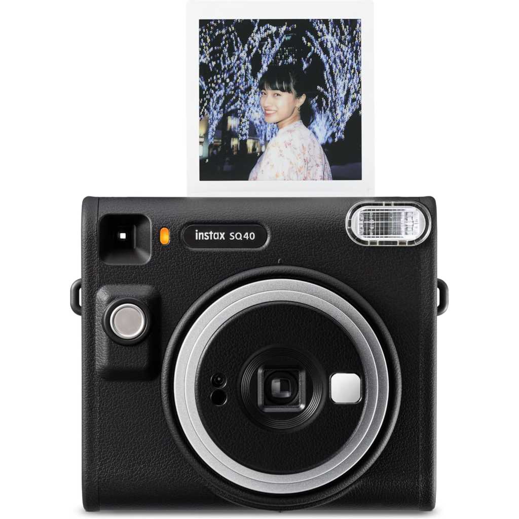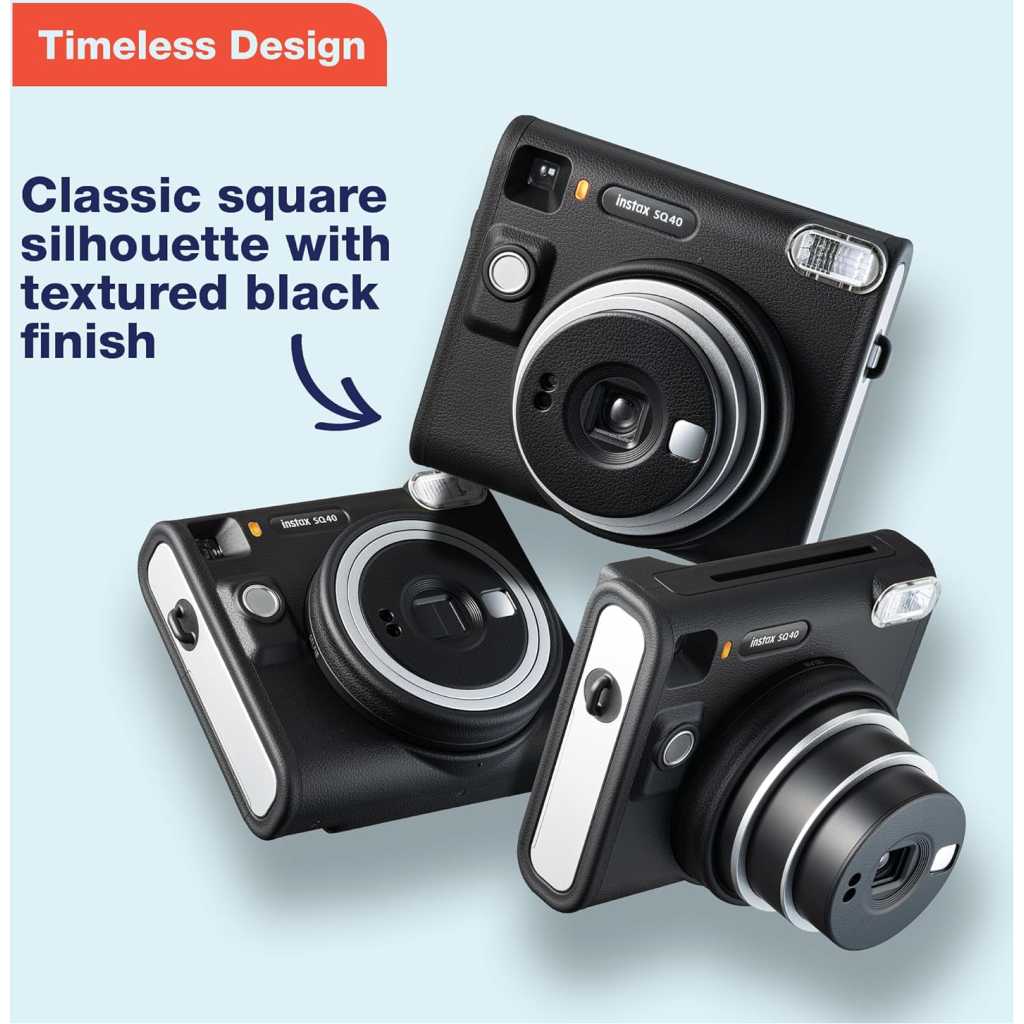 Fujifilm Instax Square SQ40 Instant Camera. Square, sophisticated design with black textured finish. Simply twist to turn on and off Built-in Automatic exposure, for ideal photos every time Built-in one-touch selfie lens and selfie mirror Prints high-quality, 3.39” x 2.83” INSTAX SQUARE instant photos (INSTAX SQUARE instant film sold separately) Includes: Hand strap, user manual, (2) CR2 batteries and 1-year limited warranty Spark unique moments of creativity with the INSTAX SQUARE SQ40™ instant camera – a chic instant camera that looks as good as it shoots. That’s right, it’s got a sophisticated black textured finish that’ll go with any style. And it’s remarkably easy to operate, helping you capture beautiful INSTAX SQUARE instant photos, every time. In fact, when it came to designing the square silhouette, we had only the boldest in mind. We added the feel of analog photography to bring you a timeless look that’ll only enhance your unique flair. Plus, by making the INSTAX SQUARE SQ40 camera wonderfully versatile, it’s always ready for all your creative moments. Simply twist to turn on, twist to enter Selfie mode and twist to turn off. And with automatic exposure, expressing your creativity really couldn’t be easier; whether you’re behind the camera or framing yourself in the selfie mirror ready for a close-up. Just point and shoot and let the INSTAX SQUARE SQ40 camera do the rest! INSTAX SQUARE instant film sold separately. Key Features: Fujifilm Instax Square SQ40 Instant Camera. Square, sophisticated design with black textured finish. Simply twist to turn on and off Built-in Automatic exposure, for ideal photos every time Built-in one-touch selfie lens and selfie mirror Prints high-quality, 3.39” x 2.83” INSTAX SQUARE instant photos (INSTAX SQUARE instant film sold separately) Includes: Hand strap, user manual, (2) CR2 batteries and 1-year limited warranty