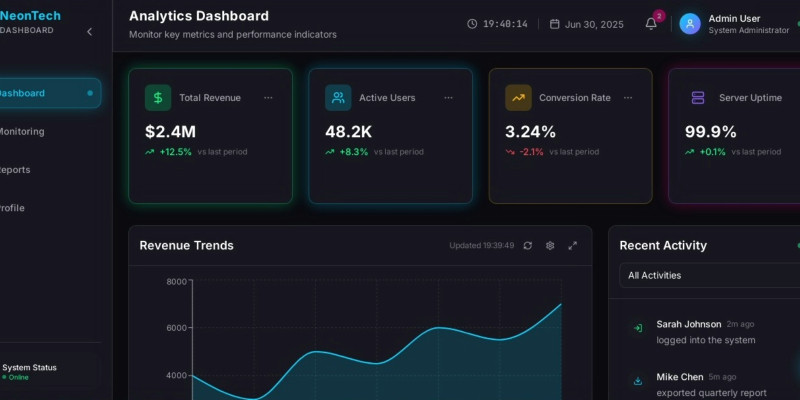 Futuristic NeonTech SaaS Analytics Dashboard UI. High-tech, colorful, and interactive SaaS dashboard UI with real-time analytics and glowing neon design.