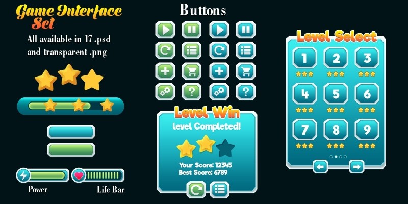 Game Interface. PSD Document size is 1024x1920 pixels . Preview Document Size 590x5000 pixels. 17 PSD files and transparent PNG files: Free font