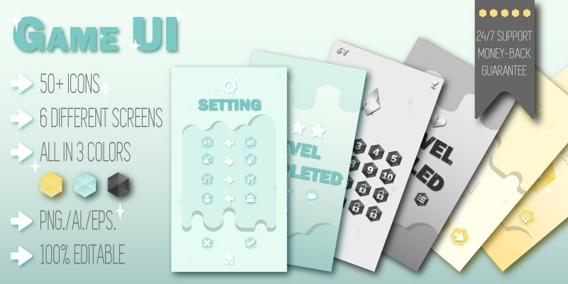 Game User Interface With 50 Icons. Game user interface in 3 colors : 6 different screens ready to go + 53 icons + backgrounds