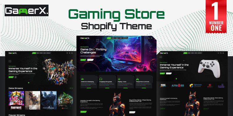 Gamerx - Digital Gaming Store Shopify Theme. Shopify theme for gaming stores, video games, consoles, and accessories. Responsive, SEO-friendly design with product showcase.