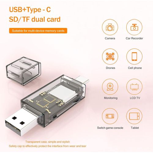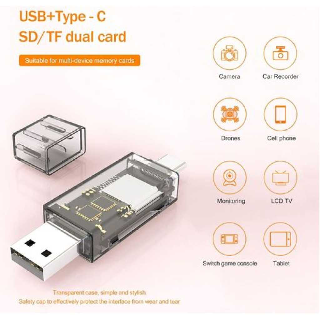 GD-DK006 Type-C & USB-A Output 4 in 1 OTG Memory Card Reader USB SD Card Reader for PC, Micro SD Card to USB Adapter, Transparent Housing Dual USB and USB-C Plug Micro USB & USB 2.0 – Supports SD/TF C
