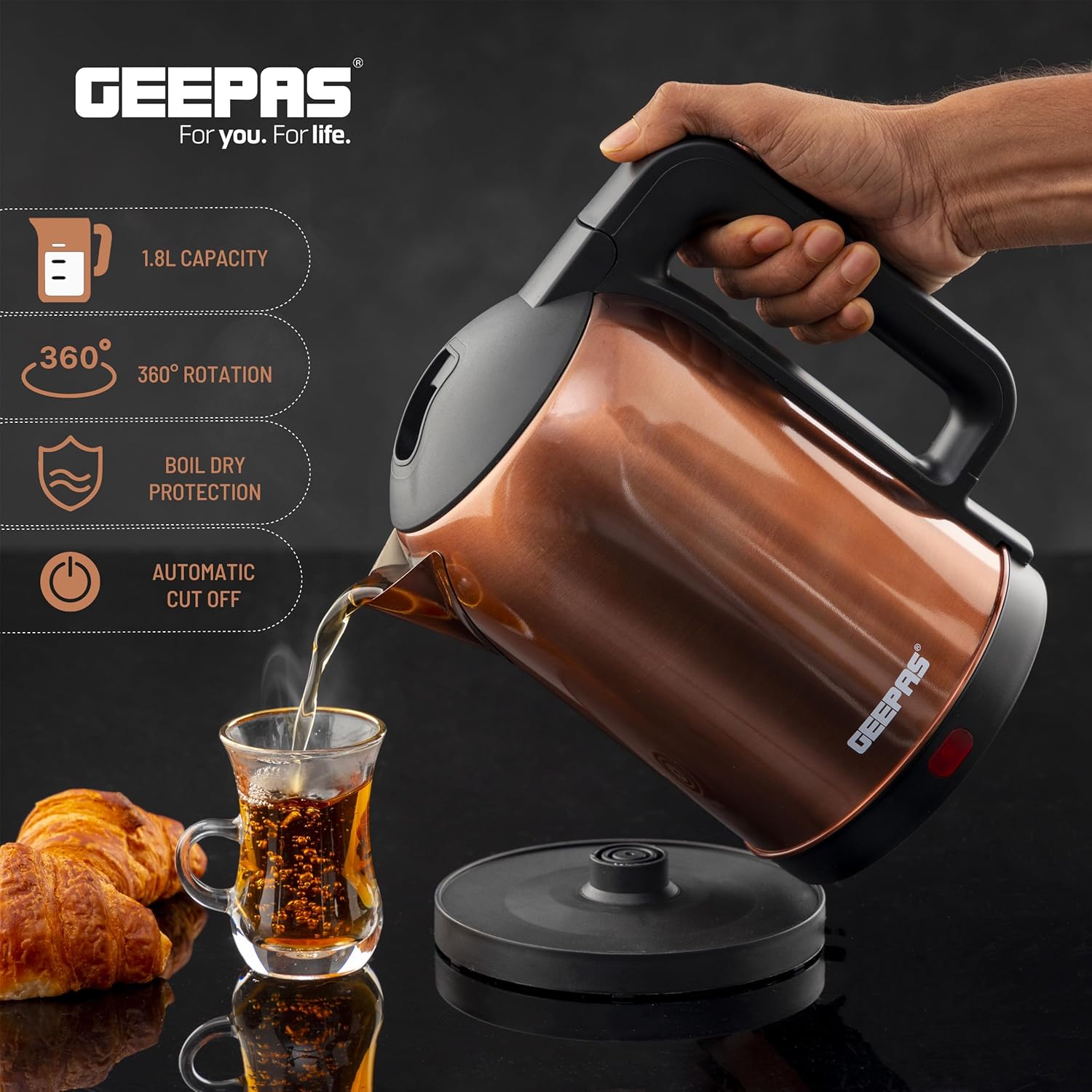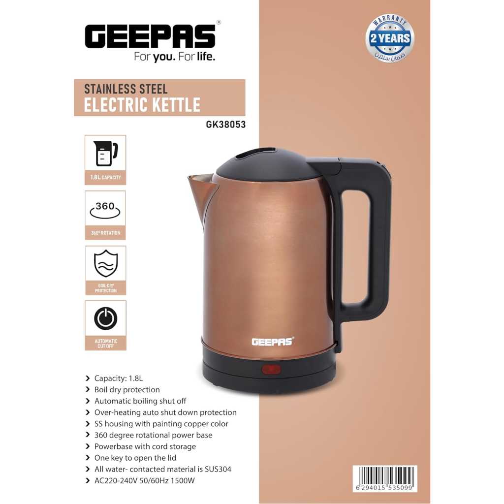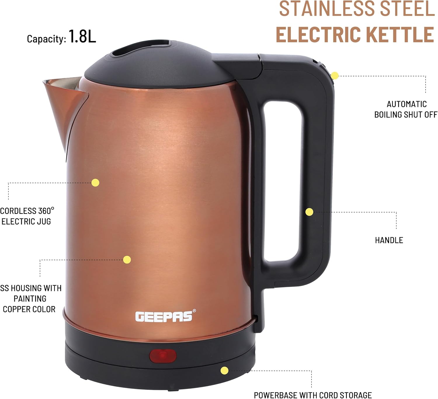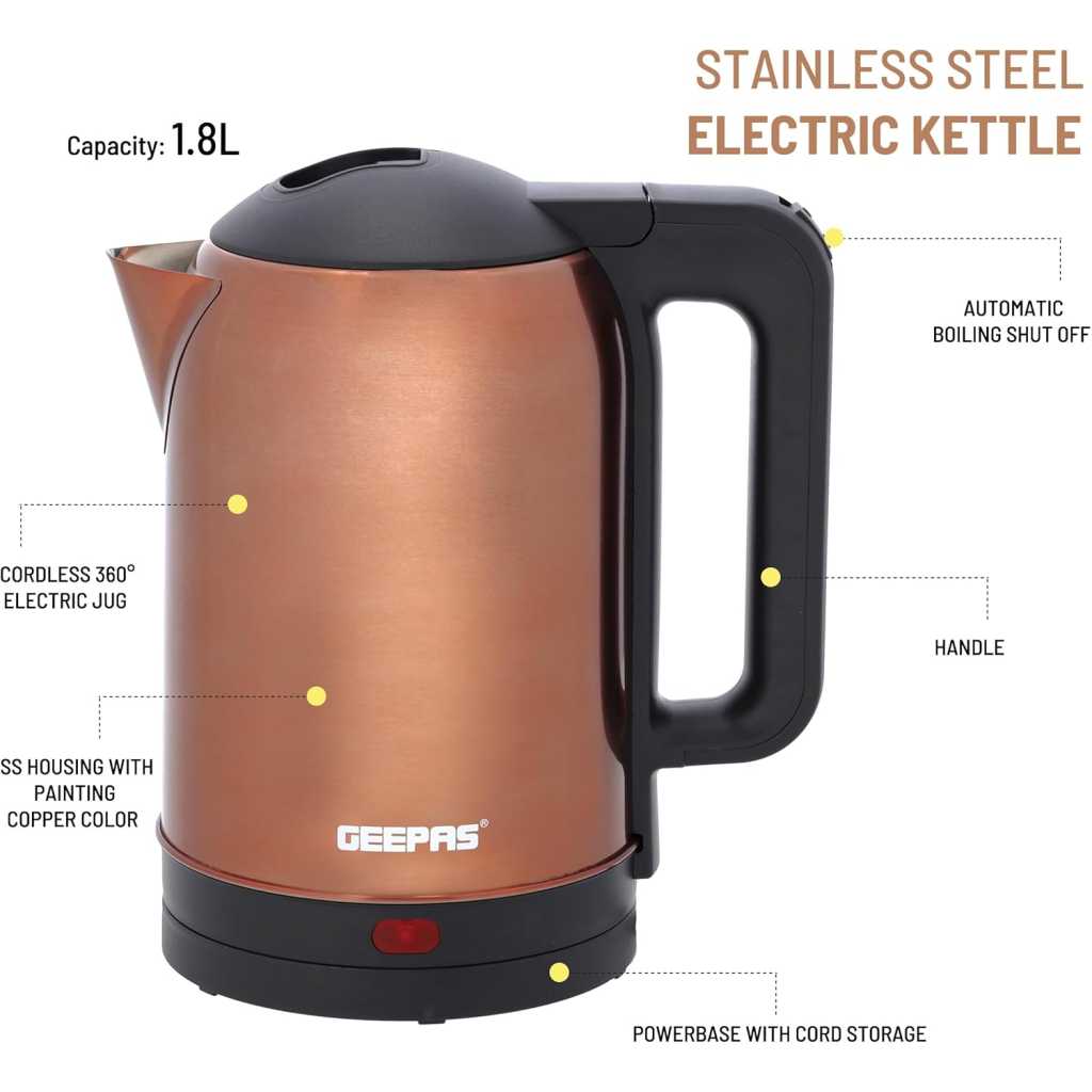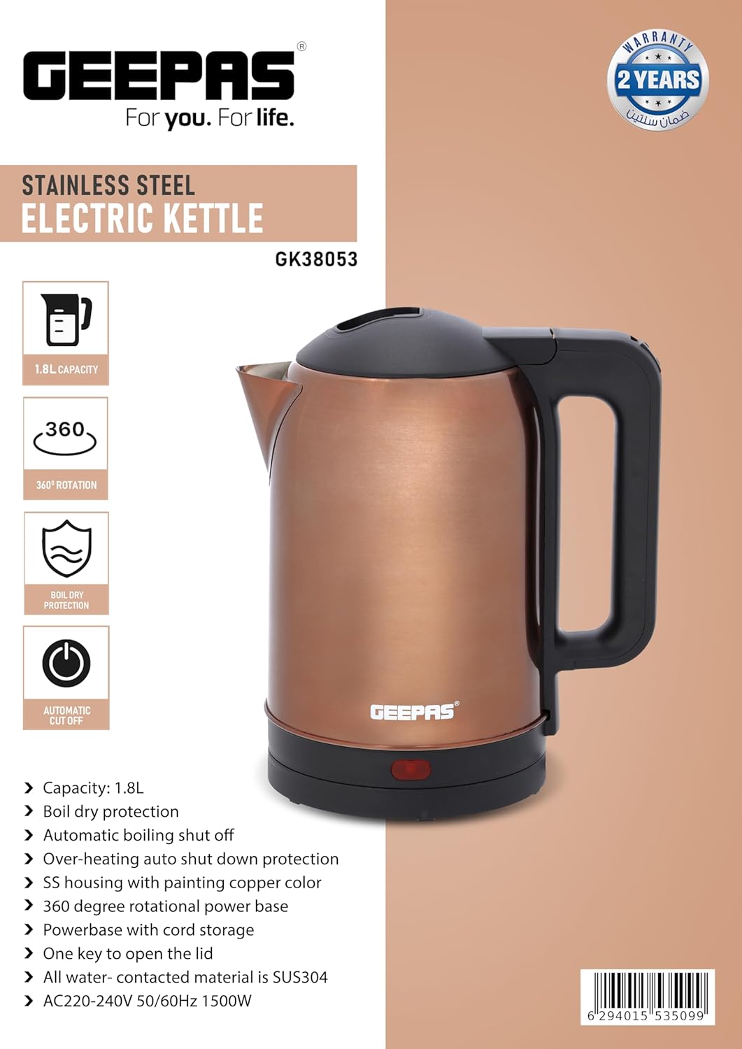 Electric kettle made with stainless steel material. Large capacity of 1.8L and is perfect for different occasions 360-degree rotating base with powerbase and cord storage. Automatic boiling shut off feature that automatically turns off when water boils. Overheating auto shut down protection and boil dry protection. All water contracted material is SUS304. AC: 220-240V 50/60Hz 1500W. ON/OFF switch with indicator light Key Features: Electric kettle made with stainless steel material. Large capacity of 1.8L and is perfect for different occasions 360-degree rotating base with powerbase and cord storage. Automatic boiling shut off feature that automatically turns off when water boils. Overheating auto shut down protection and boil dry protection. All water contracted material is SUS304. AC: 220-240V 50/60Hz 1500W. ON/OFF switch with indicator light