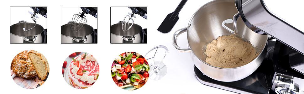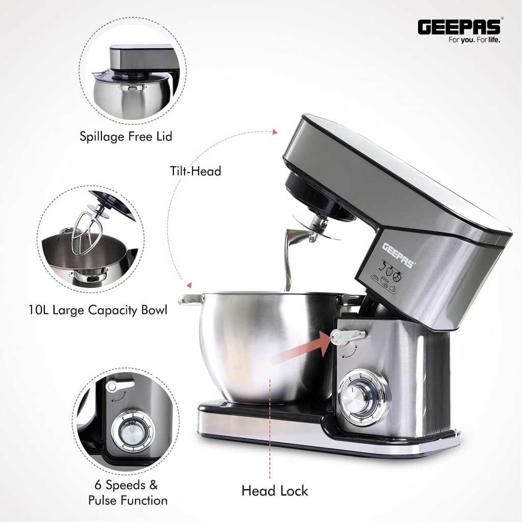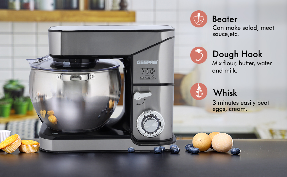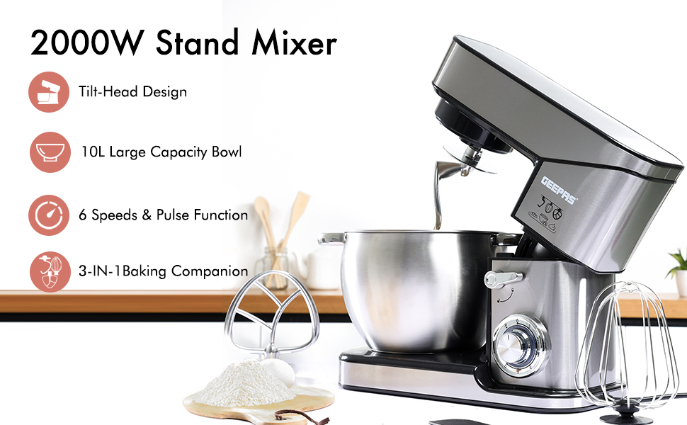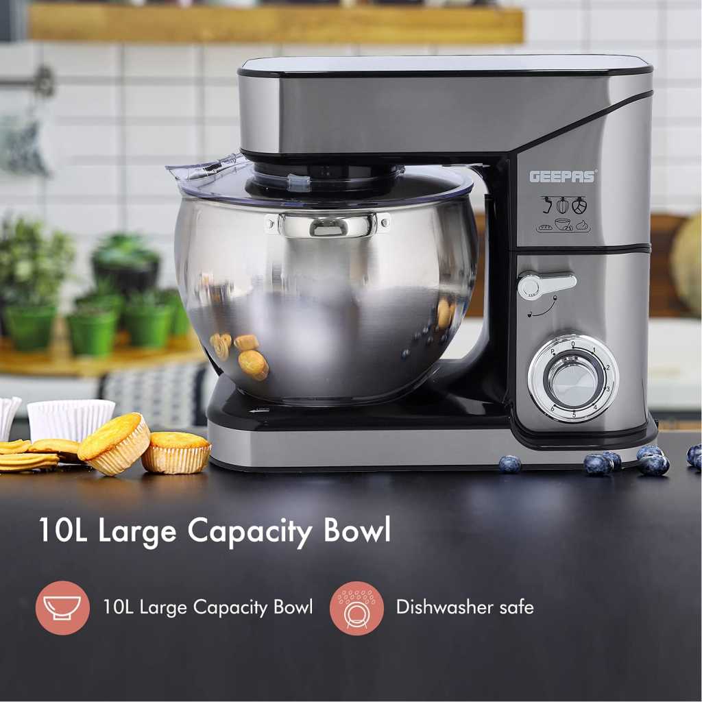 From the manufacturer Key Features: 4 anti-slip suction feet Robust metal gear system for heavy duty ABS housing with stainless steel wrapped LED power indicator AC: 220-240V, 50/60Hz, 2000W 2000W COPPER ENGINE – The engine power of this food mixer is 2000W. This power will certainly give the desired result of the work and cope with any given task quickly and efficiently. The motor will cool itself during the shutdown for a small amount of time saving electricity & it, ensures tailor mixing effortlessly and thoroughly for a variety of food, ranging from pasta to ice cream, egg whites to bread dough. TILT-UP HEAD,10L STAINLESS STEEL DURABLE BOWL – The tilt-head design mixer allows access to install or uninstall bowl and accessories easily. With a cup of this size, you can mix everything you need and its size is enough for a large amount of baking and other things that you will need. The stainless steel bowl effortlessly locks into place on the stand mixer and has 2 handles to help you lift and transfer. For foodies with a sweet tooth, the Geepas mixer can take the slog out of baking, stepping in to help mix cake mixtures and icing and whip egg whites, cream, and batters. 6 LEVEL MIXING SPEED CONTROL WITH PULSE – BAKE, MIX, BATTER, KNEAD OR BLEND TO PERFECTION – Choose your ideal 6 blending speed by just turning the dial as an afterthought. You can likewise curve the dial to the right side for a speedy manual when you need an eruption of blending power which makes it perfect for beating, whisking, kneading, and blending to guarantee quick, intensive and exact blending. TRANSPARENT SPLASH GUARD WITH POURING SPOUT & 3 ATTACHMENTS – The 10L blending bowl secures and incorporates a transparent sprinkle slash guard to avoid any spills. Both are removable for simple cleaning. Launch button for simple embellishment change. Included stainless steel whisk, aluminium beater, and dough hook in the package. BELOW SUCTION CUPS – Suckers at the bottom, you don’t worry about the moving and rocking during the cooking process as they’re sucking the desk even at the highest speed. Therefore, you can be assured to use your food mixer for your delicious recipe.