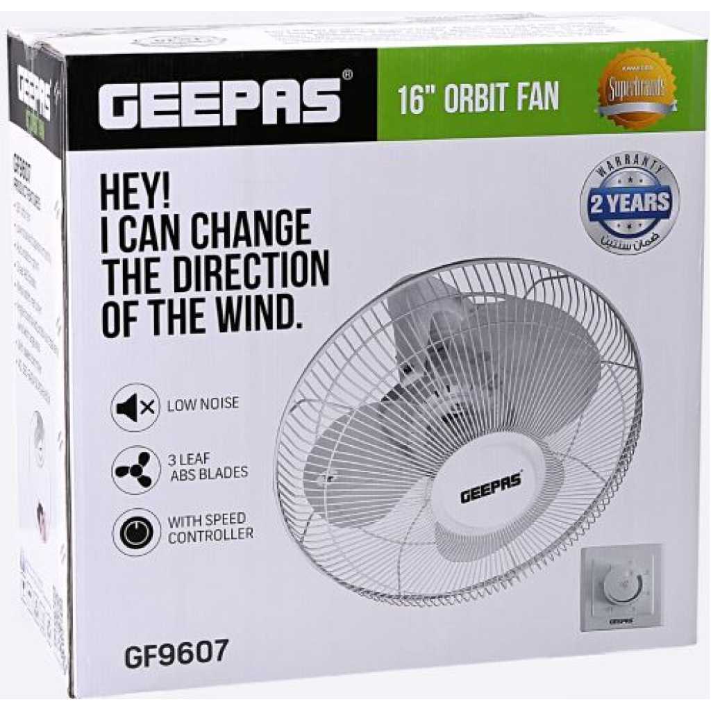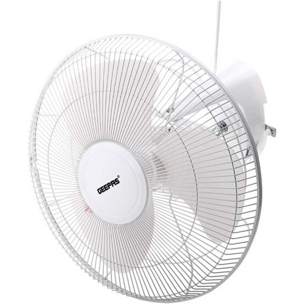 Key Features: Geepas 16″ Orbit Fan – Wide Oscilation, Speed Controller with 3 Leaf ABS Blades with Metal Grill, Ideal for Office, Bedroom, Study Room, Living Room & more OSCILLATING – Our classic oscillating orbit ceiling fan provides in auto-rotation. And creates a continuous breeze and disperses it effectively to help you feel cooler. Choose between the swinging oscillating feature or a static position. The oscillating fan circulates the air, while the static mode delivers a continuous stream of airflow in one direction. SPEED CONTROLLER – High-performance motor with speed settings: Low/medium/high choose depending on the airflow required. At the same time, it can also manually adjust the angle of up and down. Effortless control panel – the speed controls are positioned right on the base of the unit, which means you, can easily adjust the fan speed to suit your needs. CEILING – A line is perfect for your home, apartment, office, and anywhere you may need air movement. The fan is very light and convenient to fix at the top or wall side and enjoy the strong cool and fresh air. 3 LEAF METAL BLADES, QUIET AND POWERFUL – The 3 leaf fan blade is made of thick material, and the thick fan blade ensures smooth and safe operation of the fan, and quiet operation brings a comfortable bottom noise blowing environment. HIGHLY DURABLE MOTOR – The fan has a built-in 60w powerful motor capable to deliver strong breeze cool air and low noise will allow you to use anywhere you like either in a bedroom, study room or in an office it will never disturb you.
