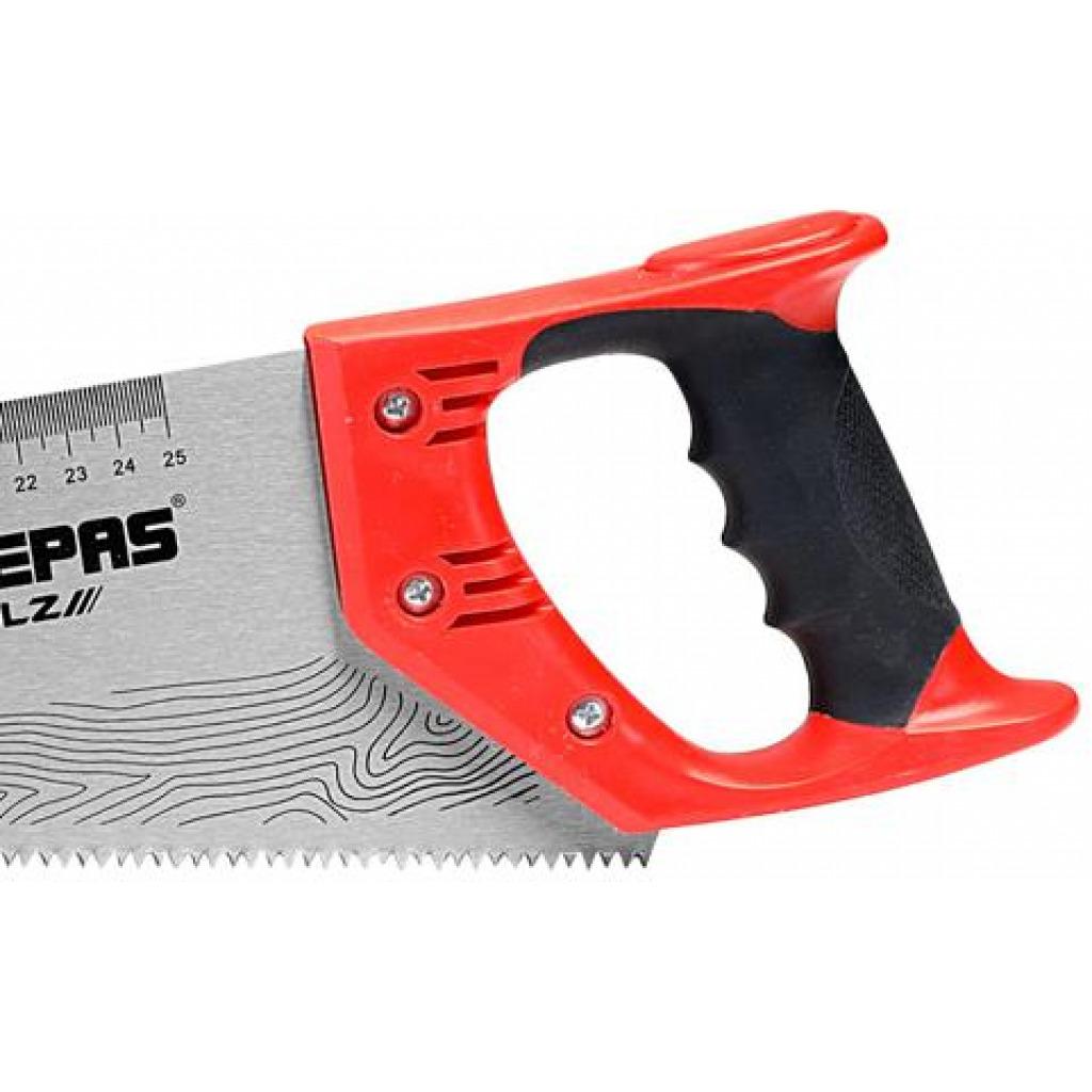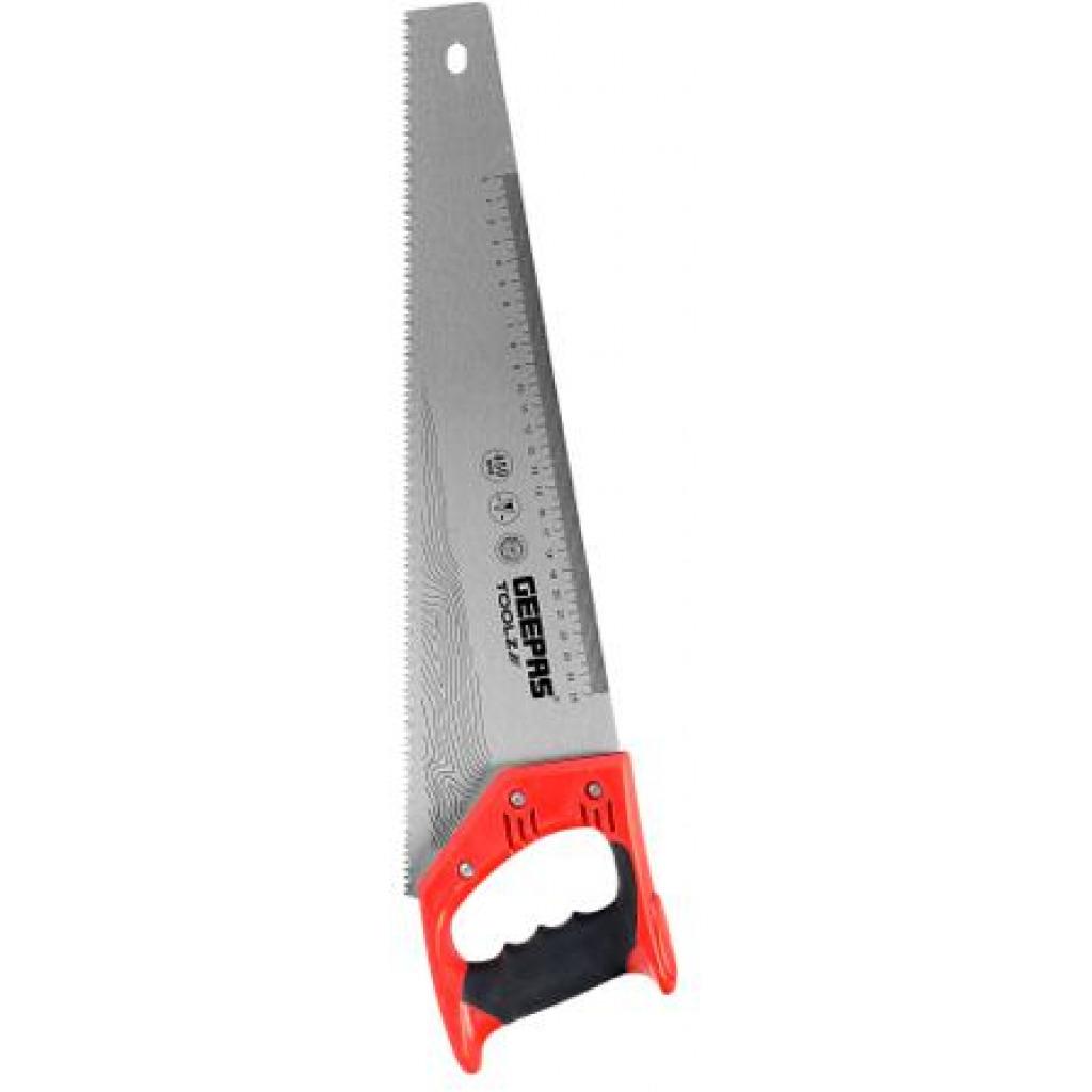 Geepas 18" Hand Saw - Universal-Cut Soft-Grip With Trp HandleFLEXIBLE USE - This Geepas Handsaw-Set includes all common sizes used at home and workshop. Heavy Duty all-purpose woodworking applications. This Handsaw is for general purposes and can be used by both professionals & amateurs as well as hobbyists, DIY maintenance or site work.HIGH-QUALITY BLADES - Saw blades made of high-quality carbon steel which is tough and capable to cut hardwood materials easily.COMFORTABLE HANDLE - Designed for site work cutting thick Hardwoods as well as softwoods. Anti-slip super grip TRP handle resists slipping and adds comfort. The handle size will work with any hand size from small to extra-large and is designed to help lessen user fatigue when cutting.HARDENED TEETH - Specially hardened and ground teeth ensure a long life. Ground teeth for general use which cuts along and across the grain. Sharp-tooth technology cuts 50% faster than conventional saws.POLISHED SURFACE - This Geepas saw is made up of high-quality carbon steel material with a polished surface that prevents corrosion and rust for long life.