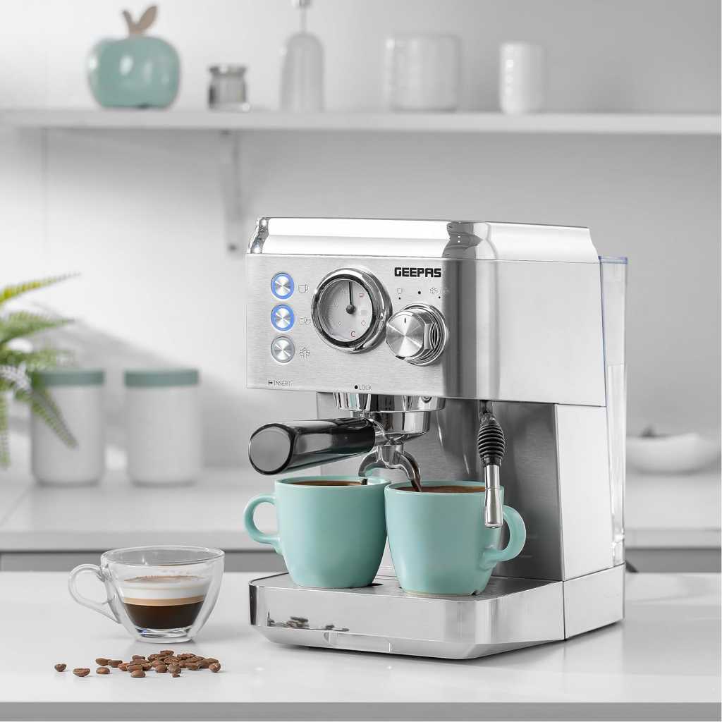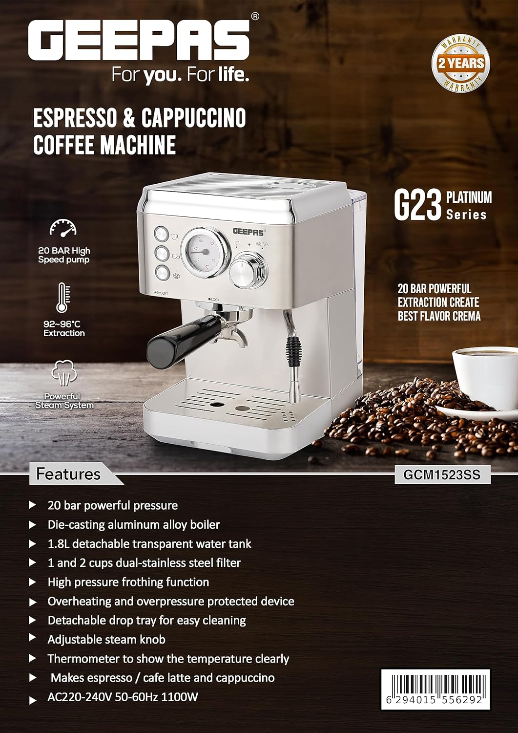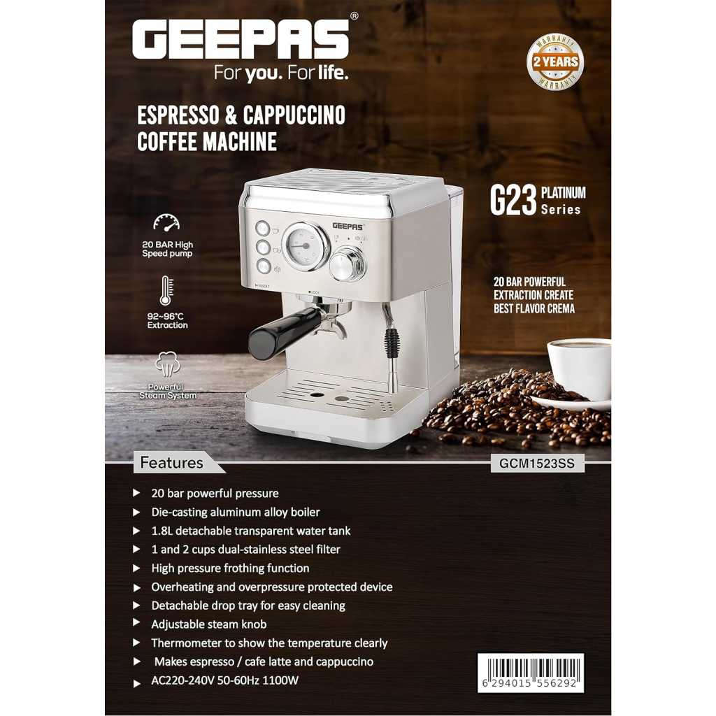 Say hello to the most advanced coffee machine with smart features and efficient performance. The Geepas espresso and cappuccino coffee maker is meticulously crafted to elevate your coffee experience to new levels. With a powerful 20 bar pressure system, this coffee machine will deliver robust and flavorful coffee shots every time. It has a strong and sturdy construction with a die-cast aluminum alloy boiler for efficient heat distribution for the best coffee extraction. It also has a generous 1.8-liter detachable transparent water tank, which allows you to easily estimate the water level and refill when needed. Dual stainless steel filters ensure that you can easily brew espresso shots with ease. The high-pressure frothing function creates creamy, foamy, and velvety foam for your cappuccinos and lattes. In addition, the adjustable steam knob allows you to control the steam pressure to customize it according to your needs. It also has overheating and overpressure protection to ensure utmost safety. The machine is also easy to clean and maintain. With its stylish white metallic design, this machine is a wonderful gift for any coffee lover, whether at home, in a caf, or in the office. The machine weighs 4.75 kg and comes with a 2-year manufacturer’s warranty. STURDY CONSTRUCTION: The Geepas espresso and cappuccino coffee machine has a sturdy construction with a die-cast aluminum alloy boiler for even heat distribution. LARGE WATER TANK: The 1.8-liter detachable transparent water tank allows you to easily estimate the water level and refill when needed. HIGH PRESSURE FROTHING: With a powerful 20-bar pressure system, this coffee machine will deliver robust and flavorful coffee shots every time. The high-pressure frothing function creates creamy, foamy, and velvety foam for your cappuccinos and lattes. MULTIPLE FEATURES: The adjustable steam knob allows you to control the steam pressure to customize it according to your needs. It also has overheating and overpressure protection to ensure utmost safety. DUAL FILTER: The 1 and 2 cup dual stainless steel filters ensure that you can easily brew espresso shots with ease. AC 220-240V 50/60 Hz 1100W PRODUCT WEIGHT: 4.75 KG INCLUDES A 2-YEAR MANUFACTURES WARRANTY. Over heating and over pressure protected device Detachable drop tray for easy cleaning Adjustable steam knob Key Features: Geepas 20 Bar Espresso and Cappuccino Coffee Machine- GCM1523SS | Die-Cast Aluminum Boiler and 1.8 L Detachable Water Tank| Makes Cappuccino, Lattes, Espresso. ✅STURDY CONSTRUCTION: The Geepas espresso and cappuccino coffee machine has a sturdy construction with a die-cast aluminum alloy boiler for even heat distribution. ✅LARGE WATER TANK: The 1.8-liter detachable transparent water tank allows you to easily estimate the water level and refill when needed. ✅HIGH PRESSURE FROTHING: With a powerful 20-bar pressure system, this coffee machine will deliver robust and flavorful coffee shots every time. The high-pressure frothing function creates creamy, foamy, and velvety foam for your cappuccinos and lattes. ✅MULTIPLE FEATURES: The adjustable steam knob allows you to control the steam pressure to customize it according to your needs. It also has overheating and overpressure protection to ensure utmost safety. ✅DUAL FILTER: The 1 and 2 cup dual stainless steel filters ensure that you can easily brew espresso shots with ease.