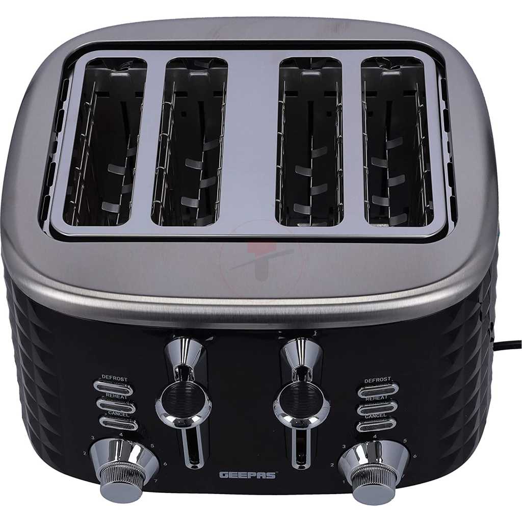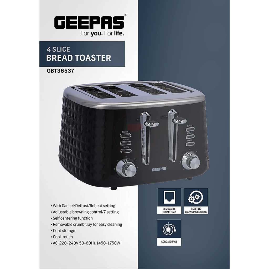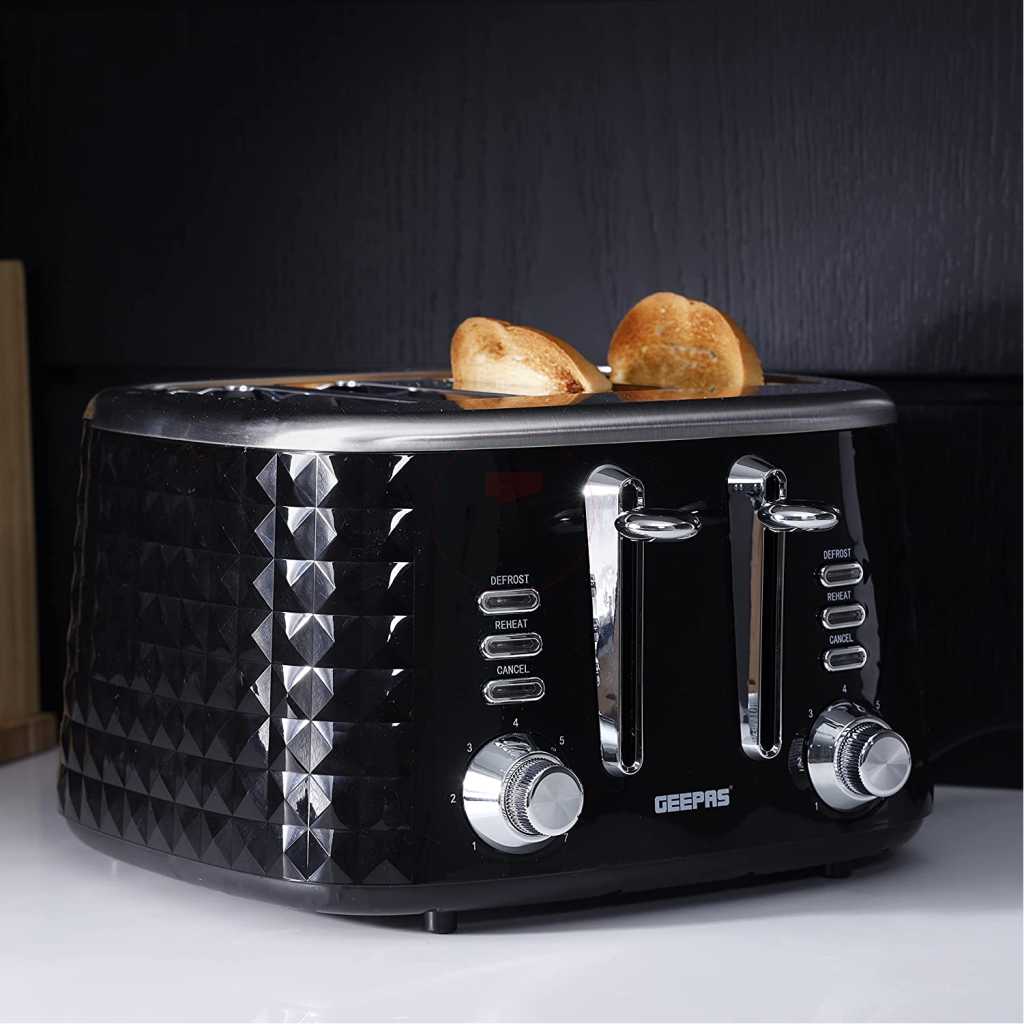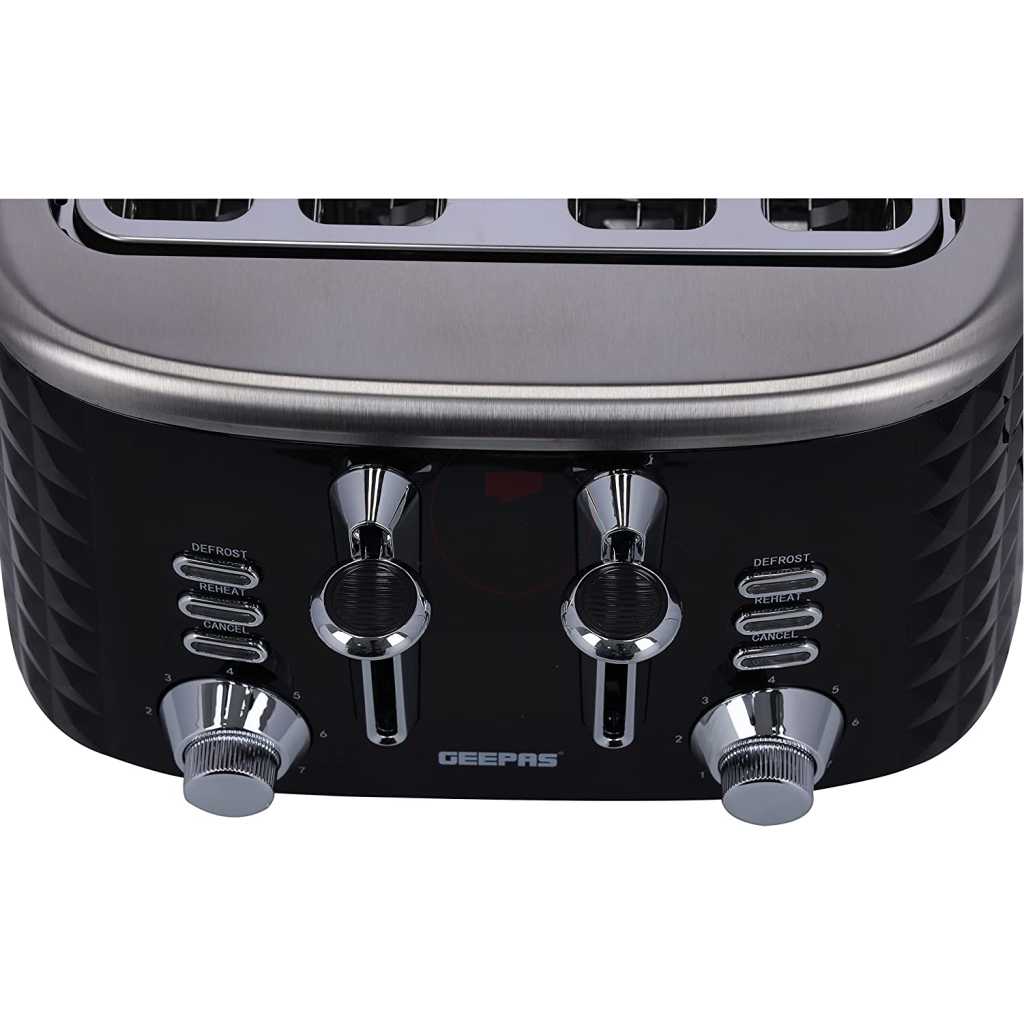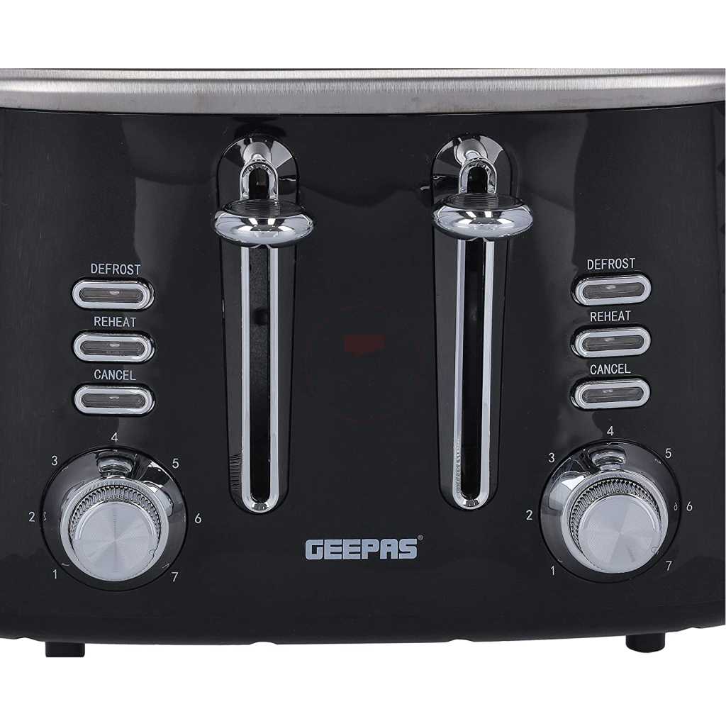 Key Features: Geepas 4 Slice Bread Toaster GBT36537 – Adjustable 7 Browning Control 4 Slice Pop-Up Toaster with Removable Crumb Collection Tray, Self-Centering | Cancel, Defrost & Reheat | Perfect Sandwiches, Toast & More. 4 Extra-wide slots and dual independent control panels Self-centering guides, drop down crumb tray Build-in warming rack and 3 smart functions Easily removable tray releases from the bottom of the toaster Upgrade heating up technology to get your toasted bread ready in 2 minutes