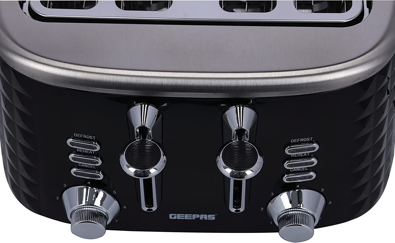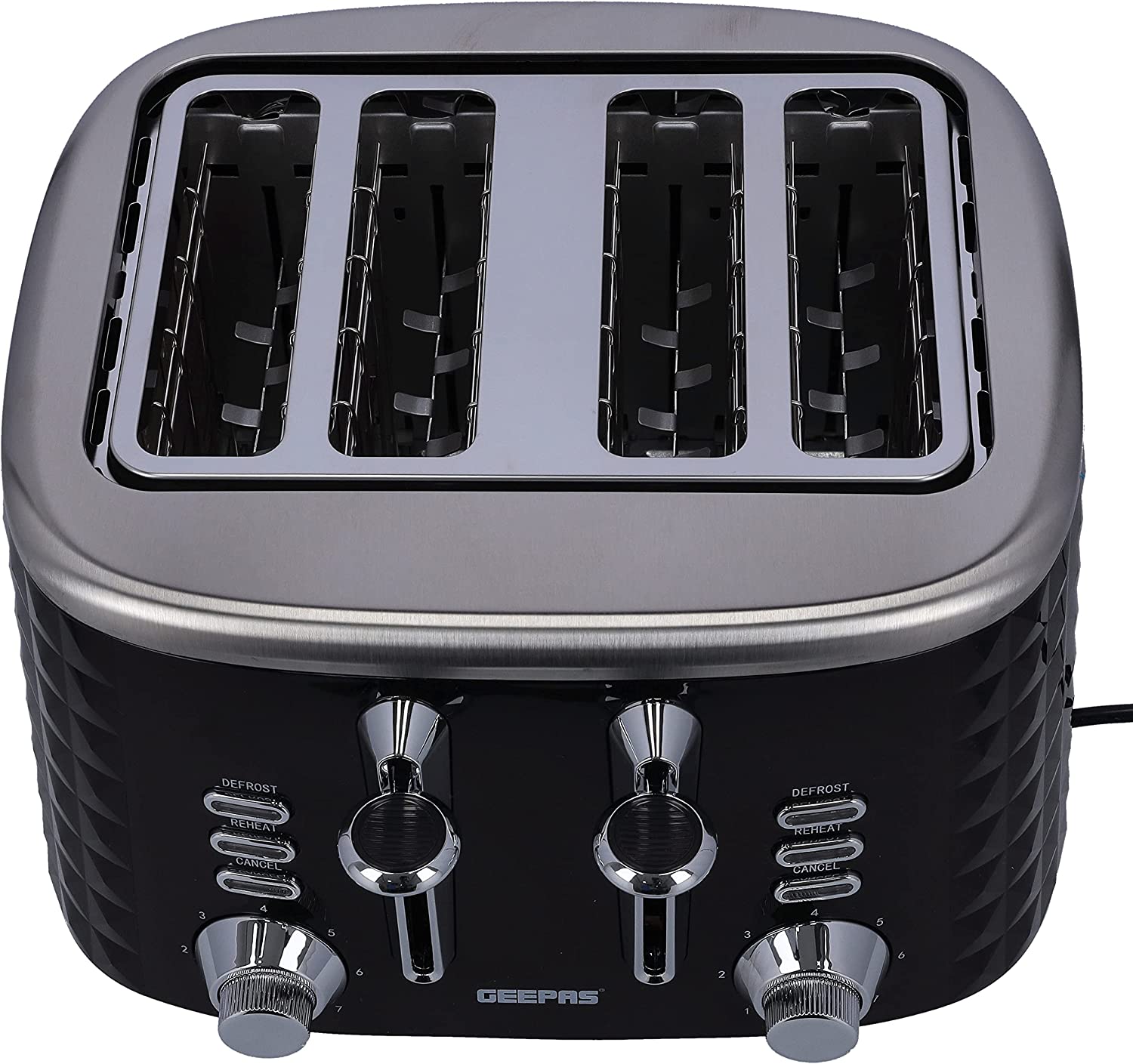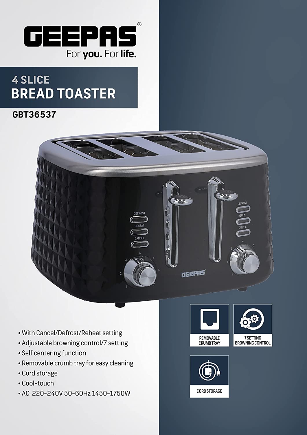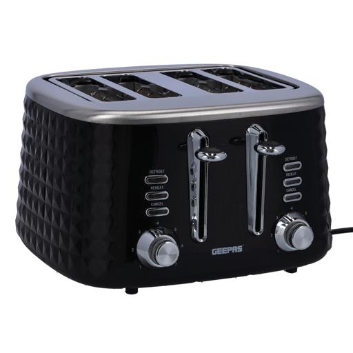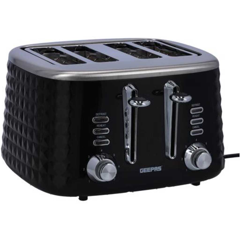 Key Features: Geepas 4 Slice Bread Toaster GBT36537 – Adjustable 7 Browning Control 4 Slice Pop-Up Toaster with Removable Crumb Collection Tray, Self-Centering | Cancel, Defrost & Reheat | Perfect Sandwiches, Toast & More. 4 Extra-wide slots and dual independent control panels Self-centering guides, drop down crumb tray Build-in warming rack and 3 smart functions Easily removable tray releases from the bottom of the toaster Upgrade heating up technology to get your toasted bread ready in 2 minutes