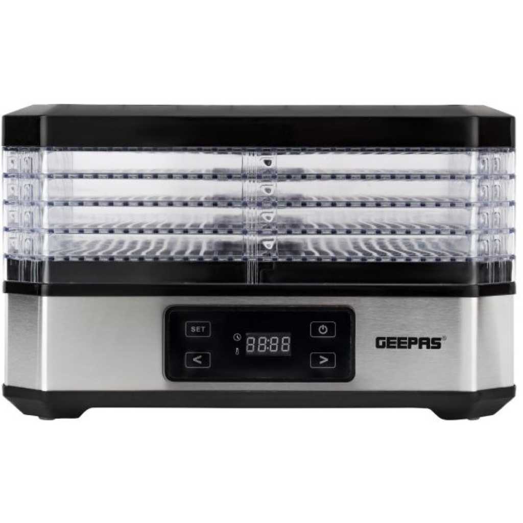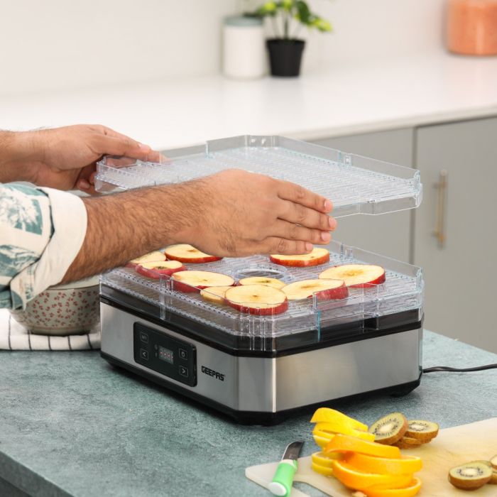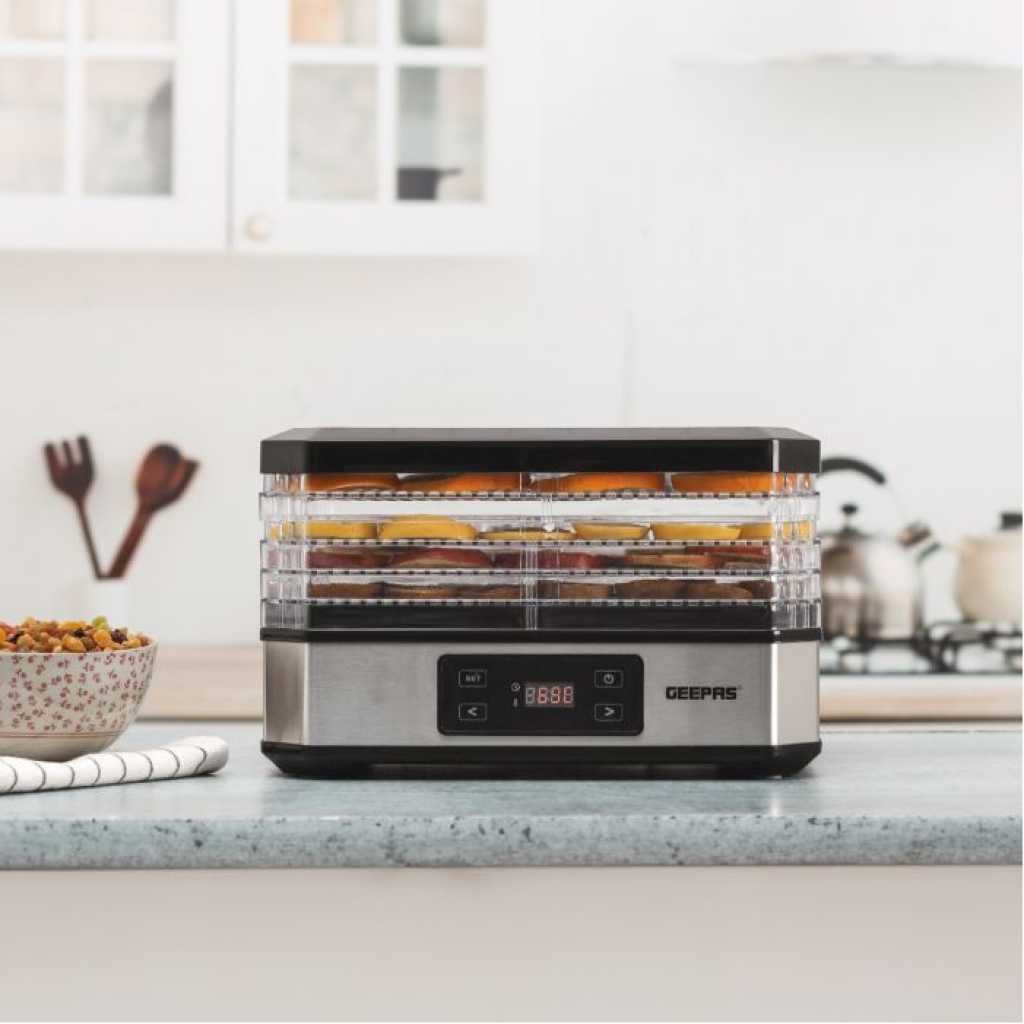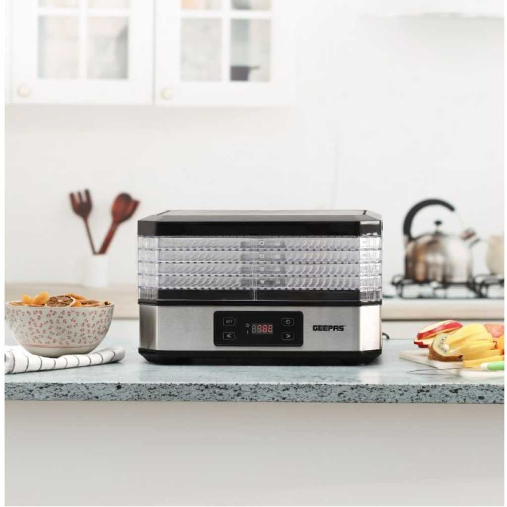 Geepas 520W Digital Food Dehydrator GFD63013UK – Food Dryer With 5 Large Trays, Adjustable Temperature & Timer Settings, Ideal For Fruit, Healthy Snacks, Vegetables, Meats & Chili, Bpa-Free – 2 Years Warranty. Digital food dryer is great as an ideal gift for you! The digital food dehydrator extends the fruit season for your family in the healthiest possible way. For centuries, dehydratation has been the most natural method for preserving food for a longer period of time. Geepas dehydrator let you can effortlessly protect fruits, vegetables, mushrooms, herbs, vegetables or meat for an optimal snack in between or as a healthy alternative for example. Completely free of artificial additives! Geepas Digital Food Dehydrator is a very simple, easy to use kitchen item. You can use it to preserve various snacks at a time. It is very precise in the temperature and time control. 5 Levels For Drying This dehydrator has five levels for drying. You can keep your items separate and keep them preserved at different levels. Not all types of food are the same, and that is why it is suitable for all of them. It gives you a variety of choices in temperature level and time. 48 Hours Timer Setting The timer function is quite straightforward and precise. You can set it up to maximum 48 hours. It carefully removes the moisture and retains the natural healthiness of the food. With this, the food can be kept in the original crisp and fresh state for a long time. Thermostat And Timer These two work together to help you choose the best temperature and time for the type of food you have put in it. Adjustable Tray Height All trays are adjustable according to height and can be removed with ease. You can choose a different height level for all five sections. Set your food according to your needs. Now you can enjoy the delicious taste, crisp texture and vitamins all year round . It is very easy to keep the snacks healthy and safe. So, let’s preserve some delicious memories!