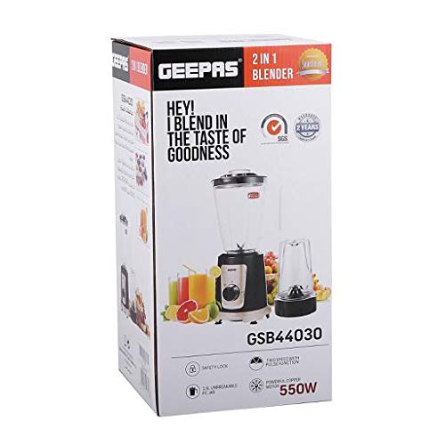 1. POWERFUL COPPER MOTOR, OVERHEAT PROTECTION – The 550W power of this 2-in-1 blender allows you to cope with hard fruits & vegetables, ideal for creating quick, easy, nutritious drinks and smoothies on the go – simply load, blend and go! 2. 1.5 L PLASTIC JAR, 200ML Grinder Mill – With a jar this big you can blend huge amounts of fruits, vegetables, & even ice. The grinder mill is ideal for coffee spice & nuts grinding. It helps to save time on cutting fruits or vegetables & instantly get a glass of tasty & healthy juice within a few seconds. 3. 2 SPEED CONTROL WITH PULSE – Keep control over your blending and juicing creations with 2-speed control functions whip, puree, crumb & chop. And with “Pulse” function grind the ice to the smallest grains & gives the option to use full blade speed in bursts to blend hard chunky ingredients quicker. 4. DOUBLE STAINLESS STEEL CUTTING BLADES – With these long span blades made of stainless steel, you can cut all kinds of fruits and vegetables. 5. 2 IN 1 JUG BLENDER – The 550W power of this 2 in 1 multi-functional blender allows you to cope with hard fruits & vegetables, ideal for creating quick, easy, nutritious drinks and smoothies on the go – simply load, blend and go!