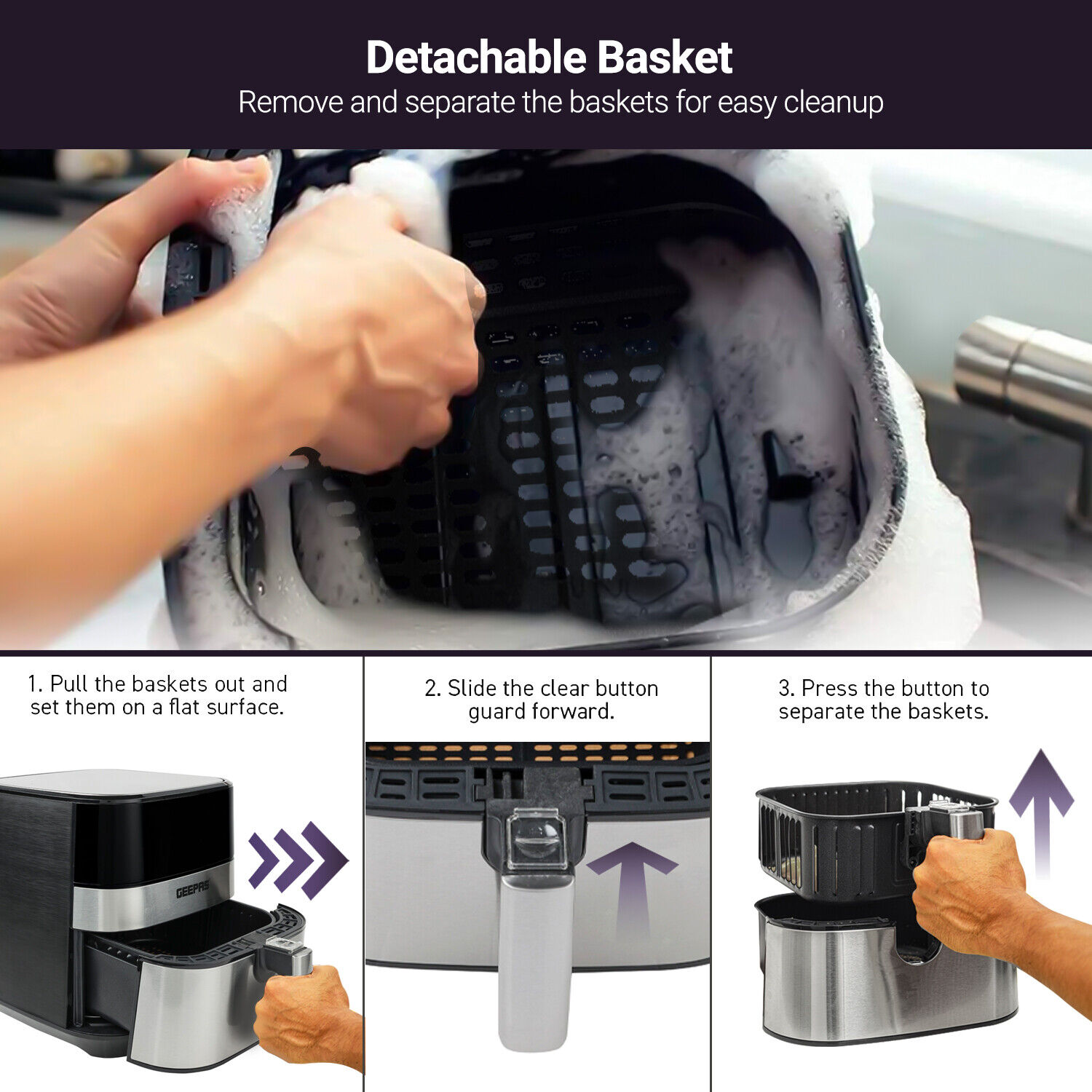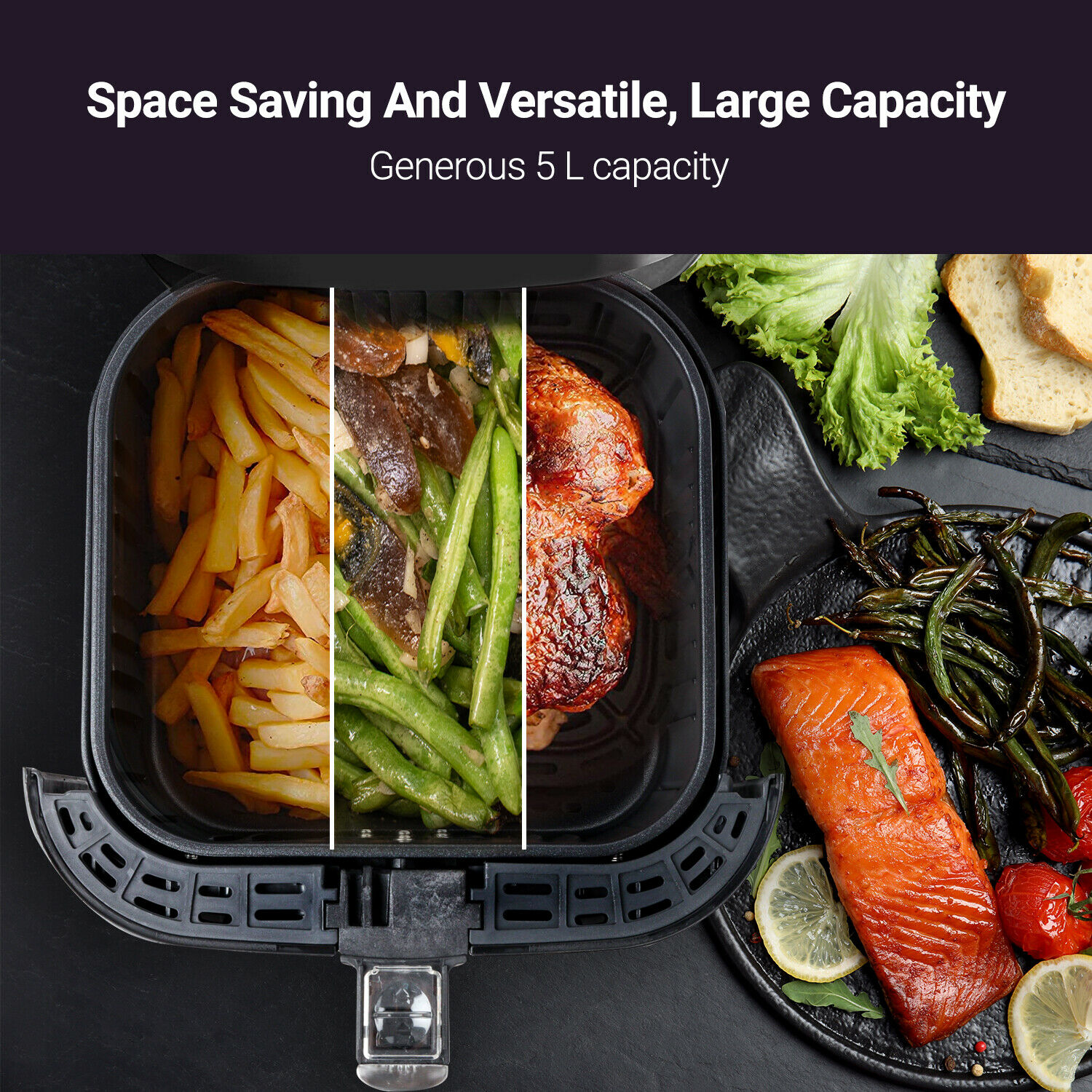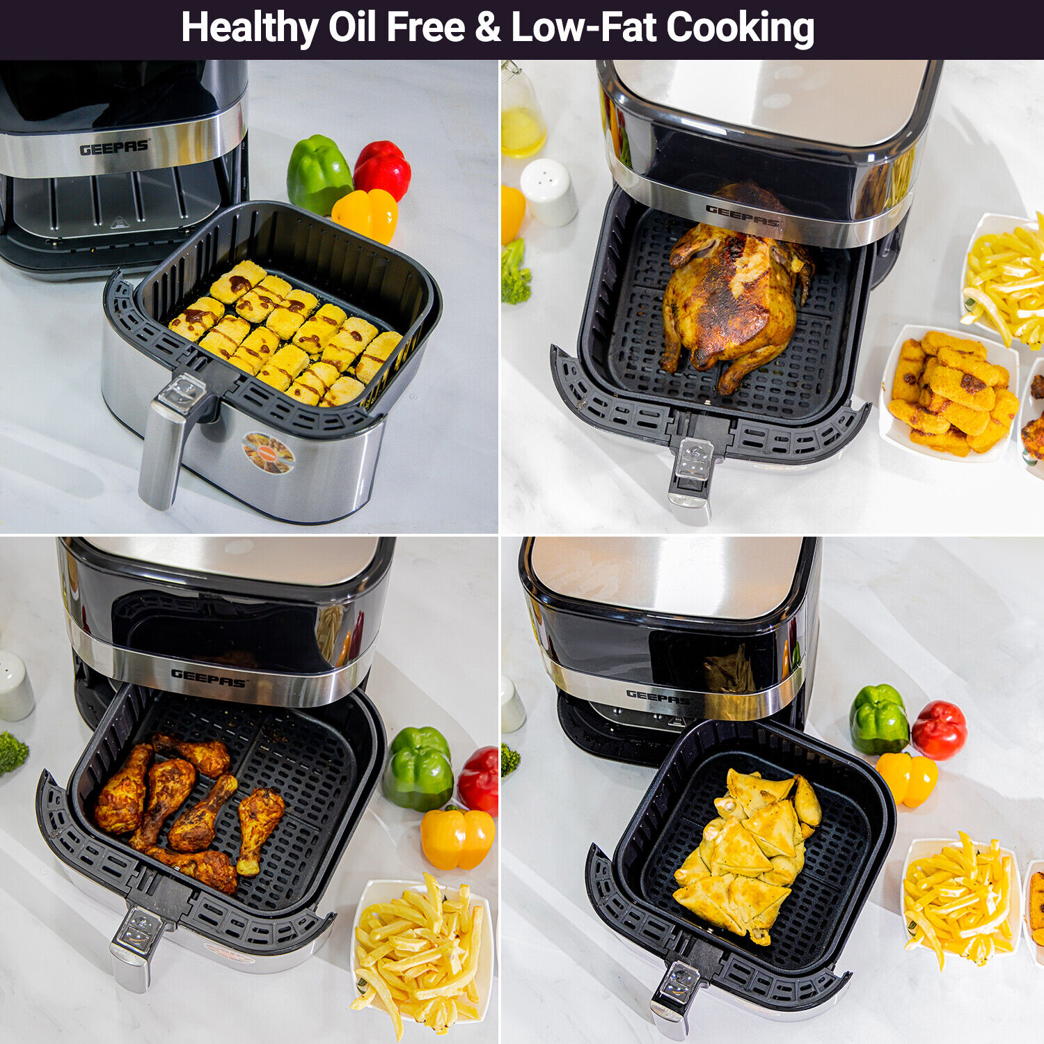 Digital Air Fryer 5L Low Fat Healthy Cooker Nonstick Tray Oil Free 1700W Geepas Key Features: Oil Free : YES No oil used; so no risk of hot oil scalding Frying faster! save time energy 50% The high-performance system makes the hot air heating the food circularly Much less smell and steam than traditional fryer With 60 mins timer automatically shut off for precise cooking Adjustable thermostat control temperature up to 200°C With overheating protection function Digital control panel with LED display Cool-touch handle & nonslip feet AC: 220-240V 50/60Hz 1700W