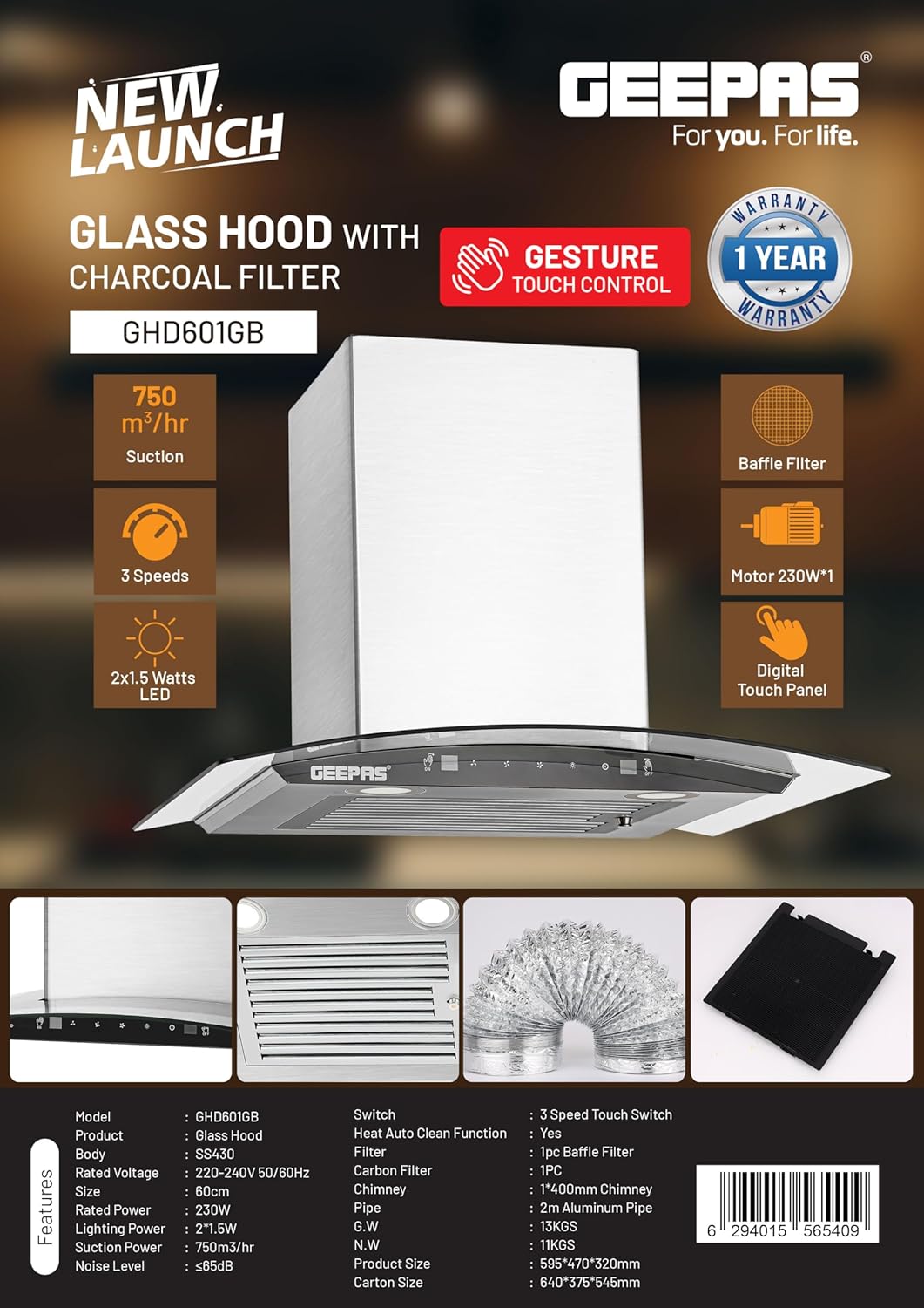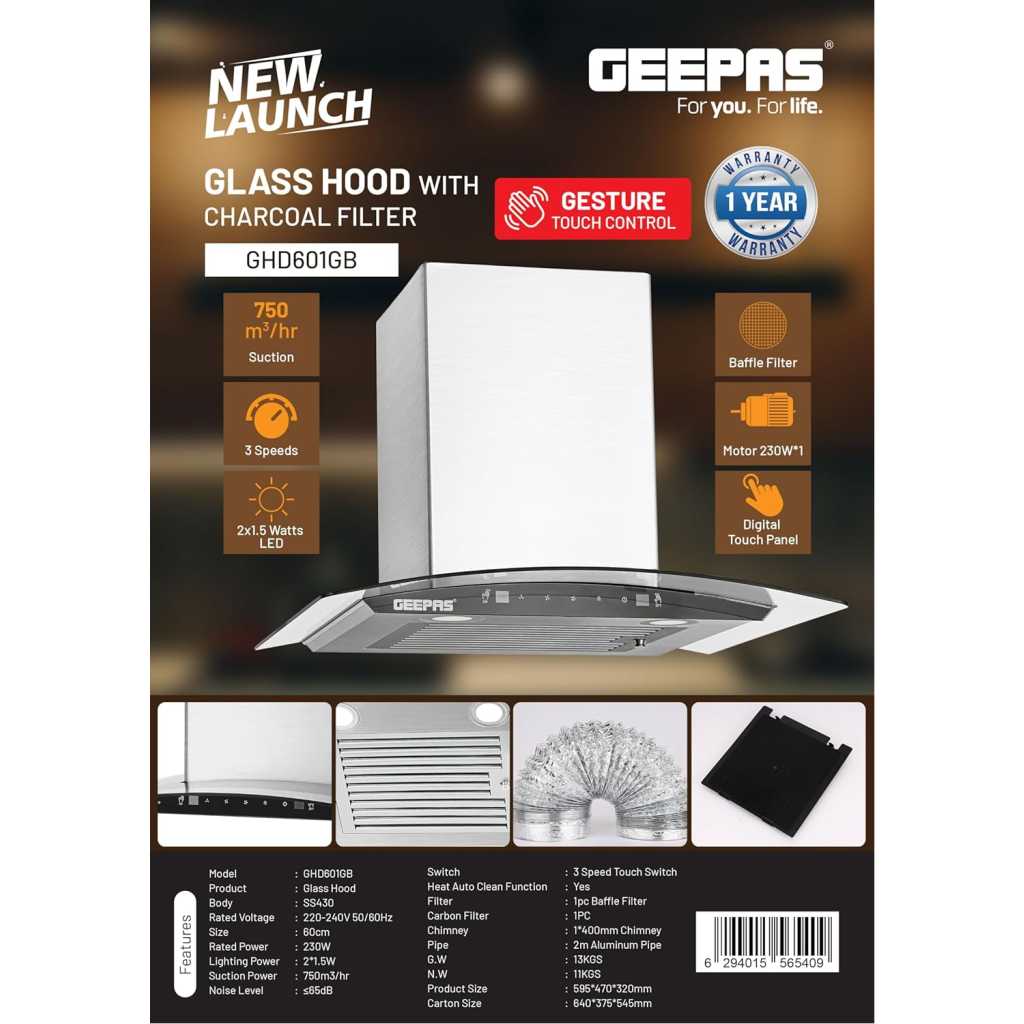Key Features: GEEPAS 60CM Slim Cooker Hood With Charcoal Filter/ Chimney With 750 m3/Hour Suction, 3 Speeds, 2X1.5 Watts LED, Baffle Filter, 230 W Motor, Digital Touch Panel, Stainless Steel Finish Body 230 W GHD601GB White. Slim hood design (60 CM): Contemporary and space-saving design for modern kitchens with limited space Charcoal filter/chimney: Includes an efficient charcoal filter for effective smoke and odor removal, promoting a healthier cooking environment 750 m3/Hour suction: Powerful suction capacity ensures rapid and efficient removal of cooking fumes, smoke, and odors, maintaining a clean kitchen air 3 Speeds: Adjustable fan speeds low, medium, high to accommodate different cooking scenarios and ventilation needs 2X1.5 Watts LED lighting: Energy-efficient LED lights provide bright and clear illumination of the cooking area Baffle filter: Advanced baffle filter design for enhanced grease trapping, easy maintenance, and prolonged performance 230 W Motor: High-powered motor for robust suction performance, effectively capturing and expelling cooking odors and smoke Digital touch panel: Intuitive and user-friendly touch panel for convenient control and customization of ventilation settings Stainless steel finish body: Durable and stylish stainless steel finish enhances the overall aesthetic of your kitchen, easy to clean and maintain 1 Pc baffle filter, 1 Pc carbon filter: Comprehensive filtration system with a baffle filter for grease trapping and a carbon filter for odor absorption Heat auto clean function: Self-cleaning feature that uses heat to remove accumulated grease and residues, ensuring hassle-free maintenance 400 Mm chimney: Adequate chimney size for efficient air circulation and ventilation in the kitchen