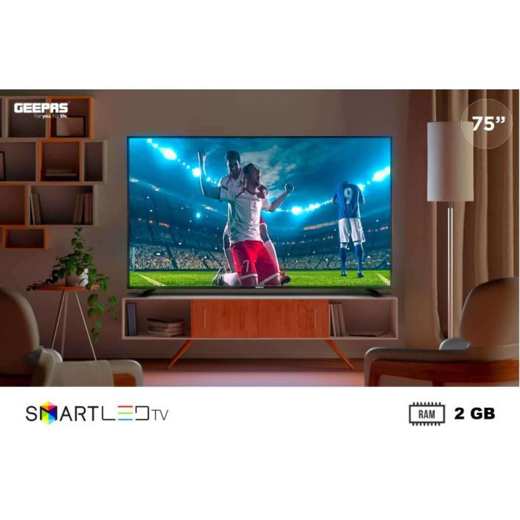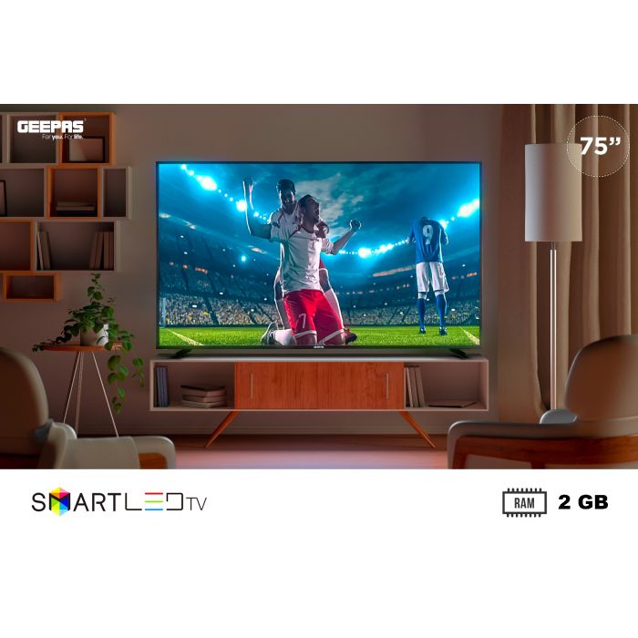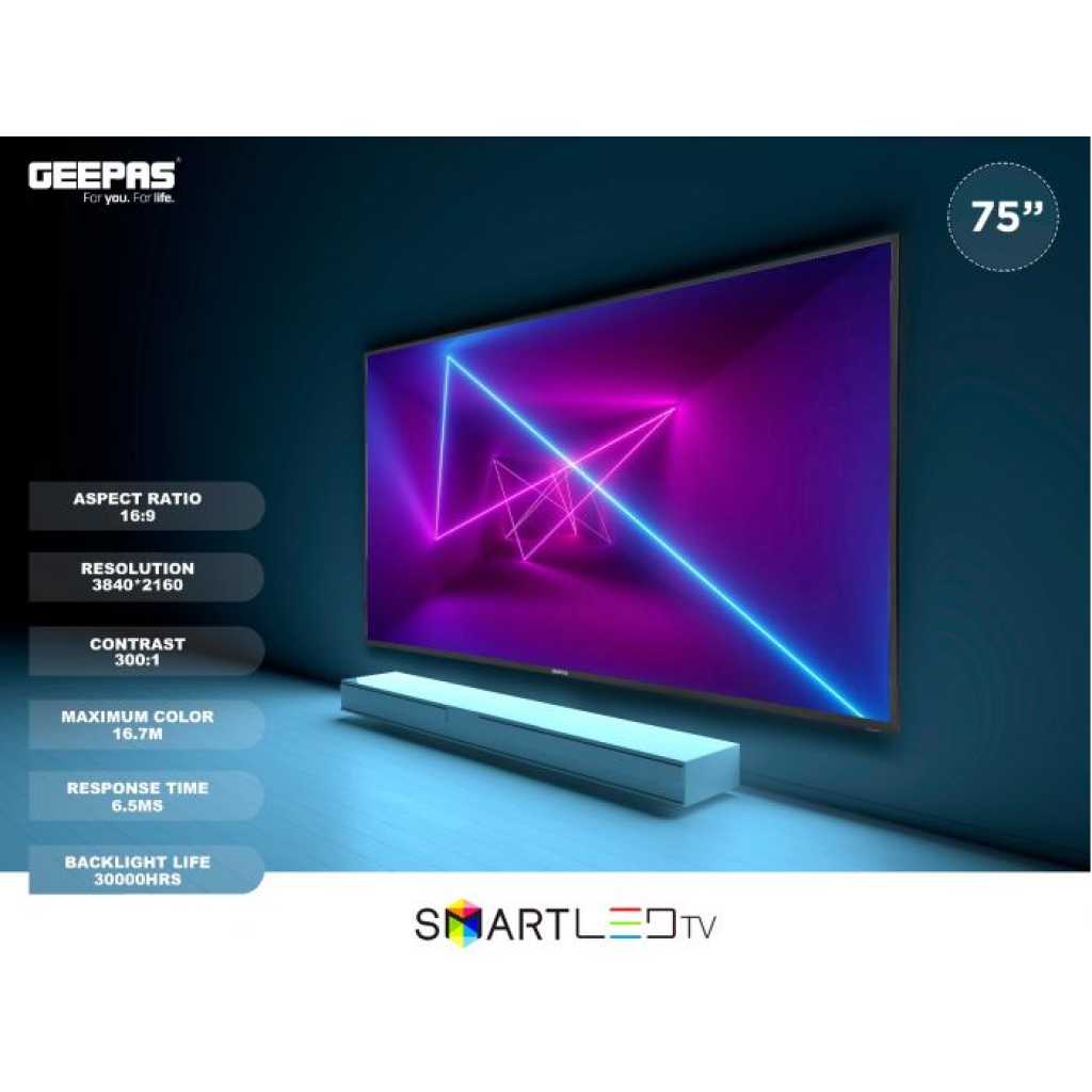 Geepas 75" 4K UHD Smart LED TV GLED7520SEUHD. Display Type: 75" ; Backlight life- 30000 hrs;Aspect Ratio: 16:9, Resolution: 3840*2160; Maximum colors- 16.7MEnergy Saving Technology, Dynamic Sound; Response time- 6.5MSPower Supply: AC 100V-240V ~ 50/60Hz; Power consumption (operation)‹ 320W; Power consumption (standby)‹ 0.5W4K ULTRA HD VIDEO QUALITY - Comes with four times the resolution of Full HD, you'll experience the detail and color definition. Micro dimming technologies – brightness color saturation and contrast are intelligently optimized in every frame.SMART FEATURES - Built-in, enjoy thousands of apps in Android 9.0 and channels including Netflix, YouTube, Prime Video, BBC, ITV, Channel 4, Disney, and more (subscription fees may apply).9.0 Android TV - HD Ready display, cinematic HQ sound, multiple ports, leading performance, and mirror cast feature with an android 9.0 version. Android TV offers thousands of movies, shows, and games from Google Play, YouTube, and your favorite apps. You can easily cast movies, shows, and photos from your Android or iOS device.HIGH-QUALITY SOUND - With HQ superior audio experience is delivered. Featuring dynamic EQ, the sound is intelligently optimized according to audio content - or customized to personal taste instead.WIDE VIEWING ANGLE - Enjoy the same consistency and clarity from almost any viewing angle 176"(H)/176"(W). Sit at any corner of the room you will experience the same quality. This 65” screen with 3840*2160 resolution gives an expansive entertainment experience. This LED TV is 168.16 x 31.41 x 101.52cm in size.