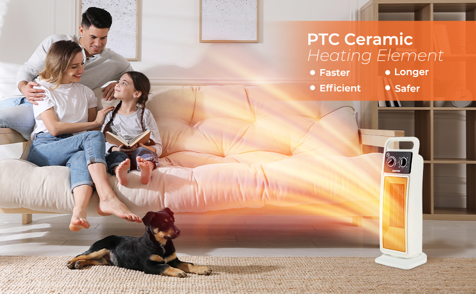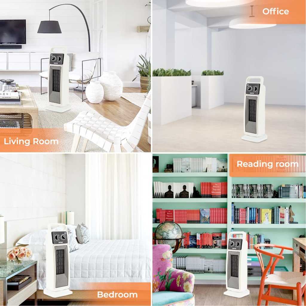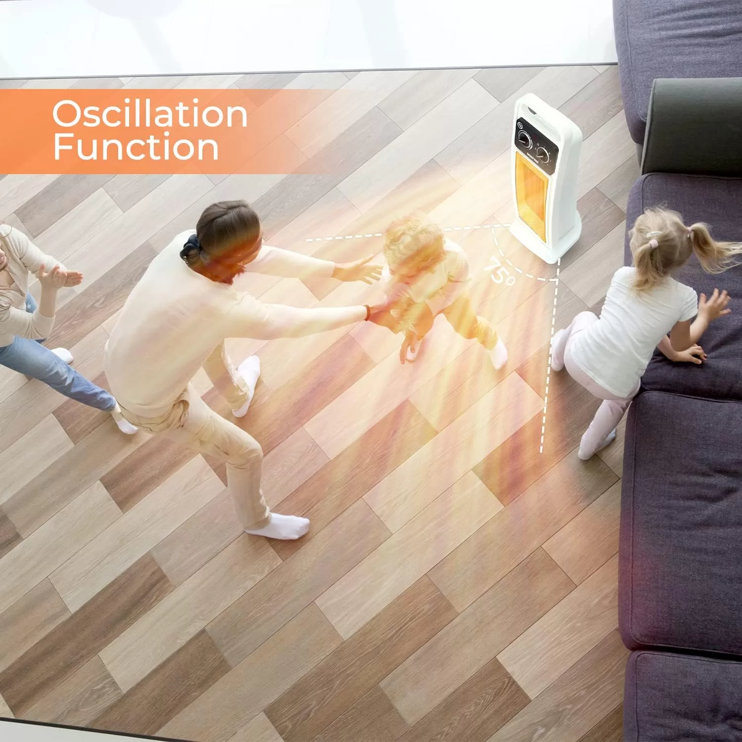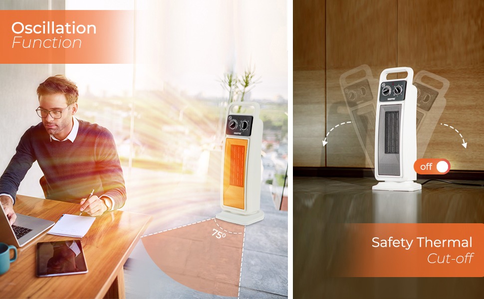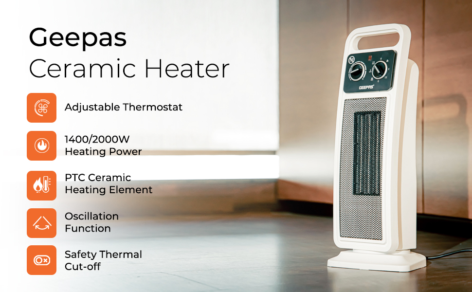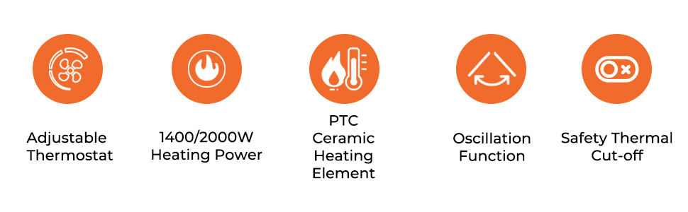 Key Features: PTC CERAMIC TECHNOLOGY: Advanced PTC ceramic heating elements provide faster, more efficient, longer, and safer heat transfer than traditional fan heaters. They operate by circulating air through the PTC element to heat it and can be slightly noisier than regular fan heaters. This electric heater is perfect for keeping you warm this winter. ADJUSTABLE THERMOSTAT: An easy-to-use and fully adjustable thermostat control is built into the mini heater to monitor the temperature around and ensure optimal heating and energy efficiency. 2 POWER SETTINGS & OSCILLATION, ADJUSTABLE THERMOSTAT: Includes 2000W (High) and 1500W (Low) power settings as well an automatic oscillation mode for heating larger rooms and spaces. An easy-to-use and fully adjustable thermostat control is built into the mini heater to monitor the temperature around and ensure optimal heating and energy efficiency. ADVANCED SAFETY, PORTABLE: Built in overheat protection and anti-tip over switch ensure the heater instantly switches off in any unsafe situation. The lightweight compact design allows the heater to be easily transported to wherever you need it most, making it great for use in homes, bedrooms, garages, schools and offices. GREAT HELPER TO WARM YOUR CORNER, HEAT UP FAST: With automatic oscillation, this space heater for indoor use increase the heat distribution range for even warmth, so that you can get the fast widespread, comfortable and efficient heating comfort. Equipped with ceramic heating elements and rated power up to 2000 watts, our PTC space heater heats quickly to provide warmth for relatively small spaces.