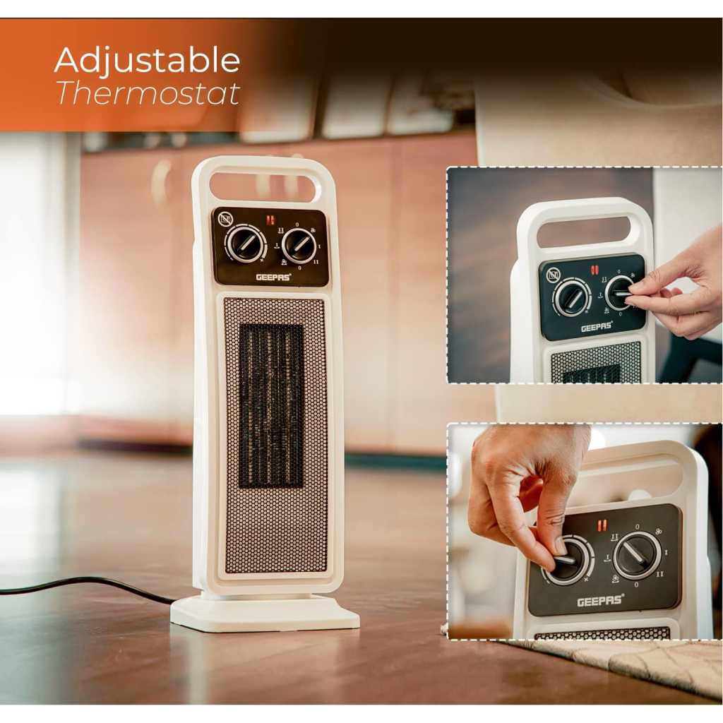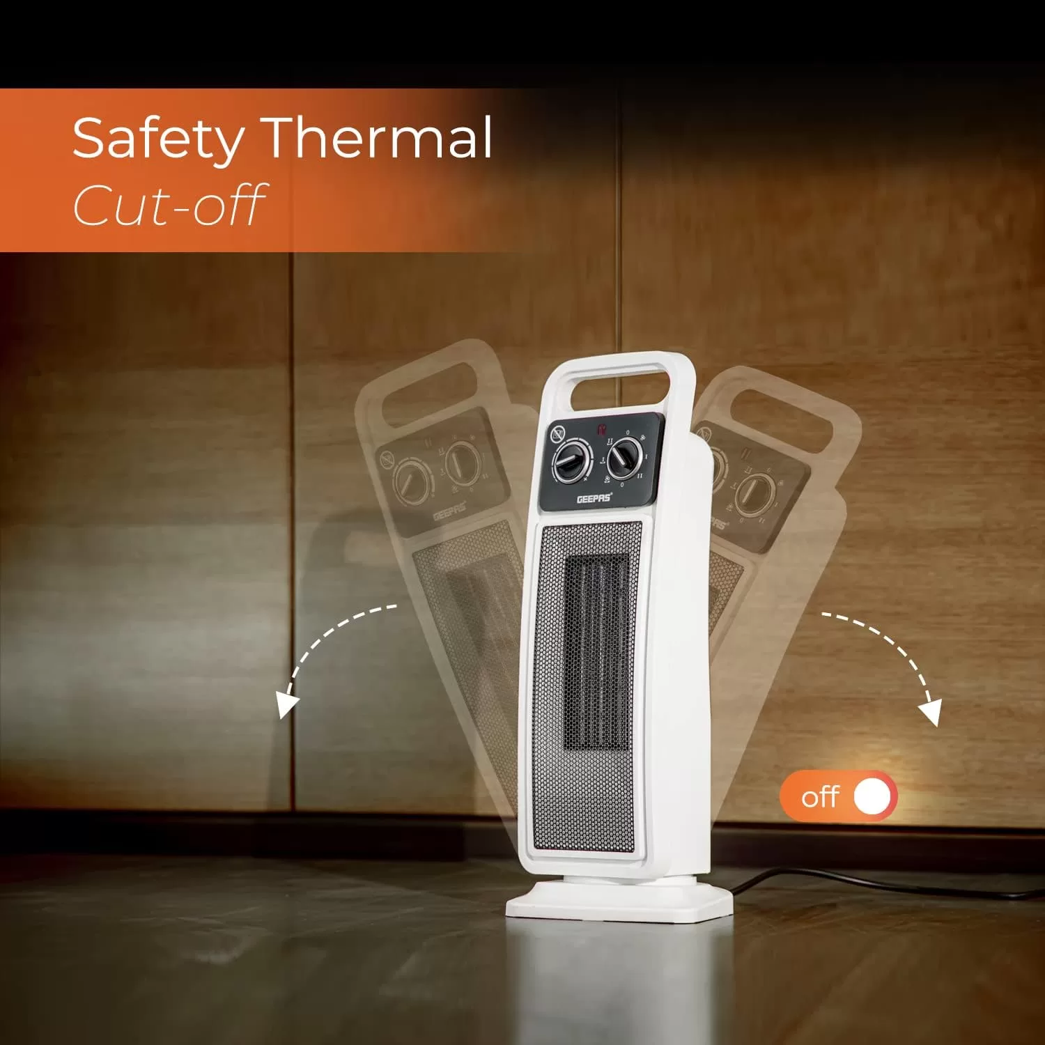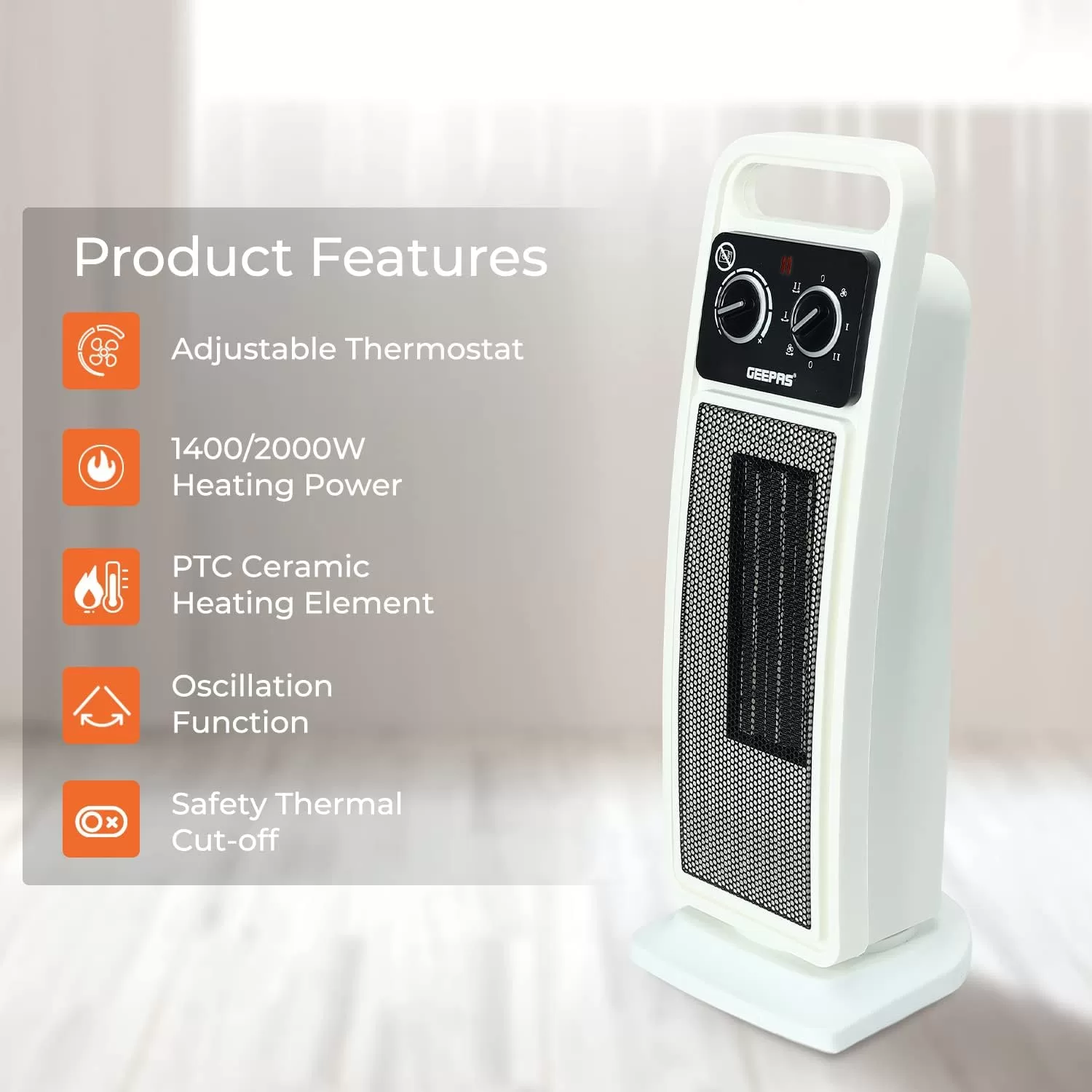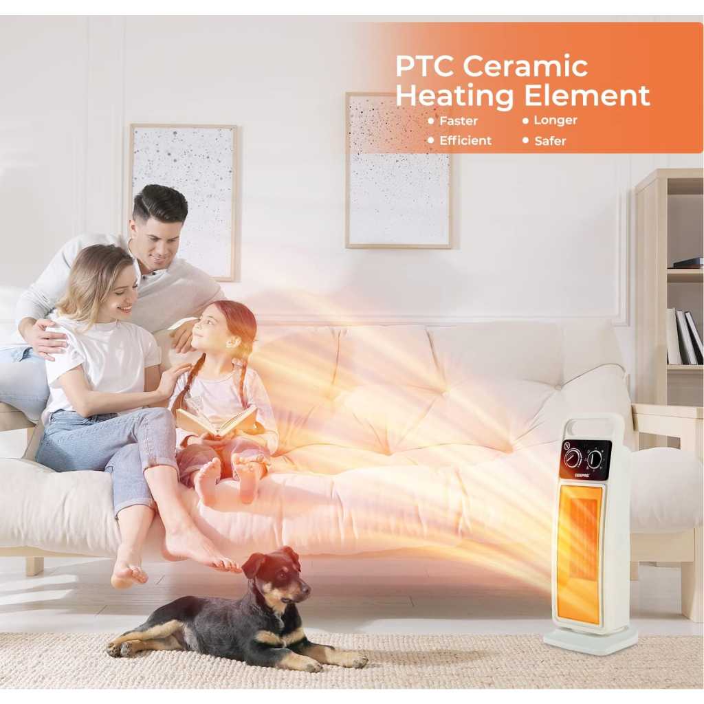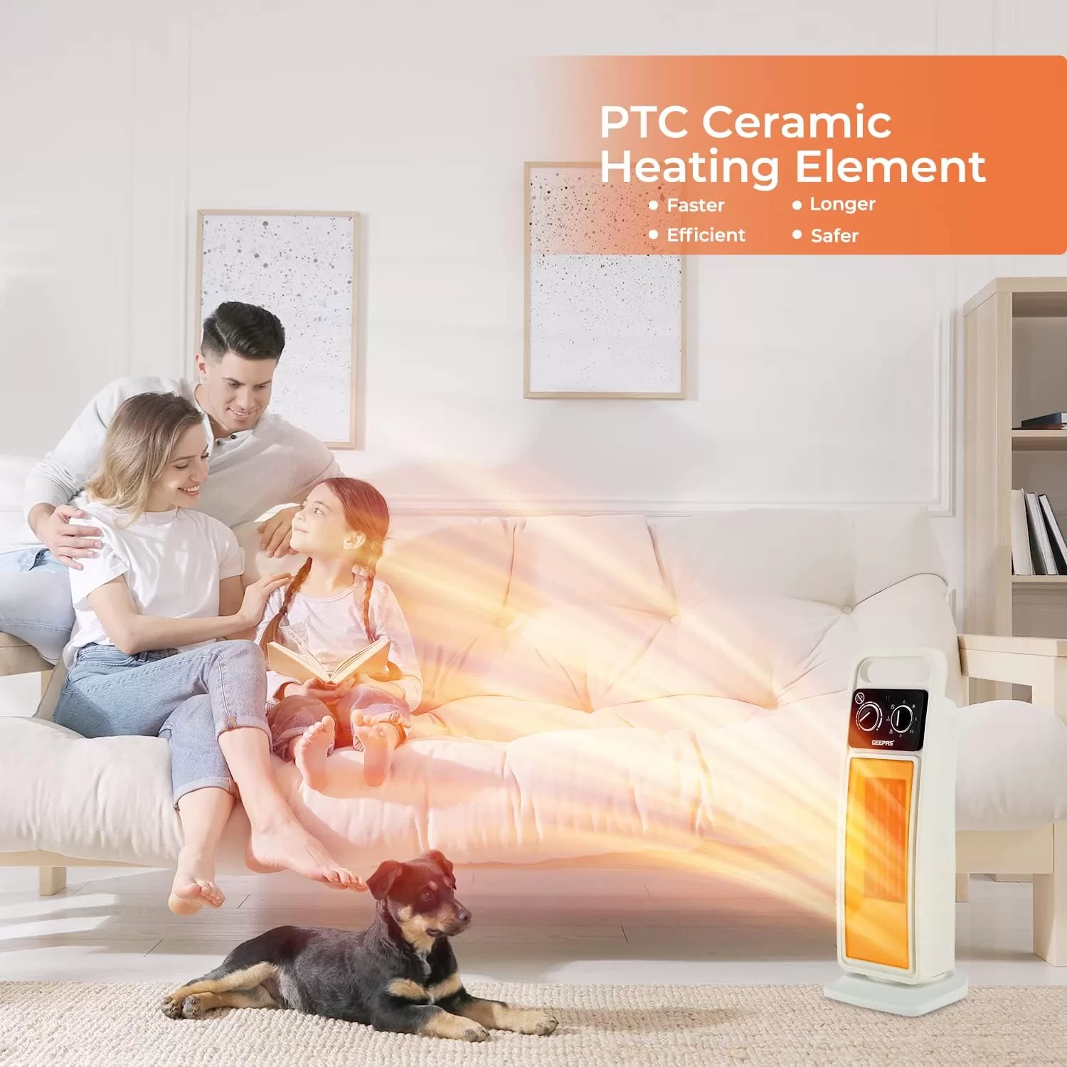 Key Features: PTC CERAMIC TECHNOLOGY: Advanced PTC ceramic heating elements provide faster, more efficient, longer, and safer heat transfer than traditional fan heaters. They operate by circulating air through the PTC element to heat it and can be slightly noisier than regular fan heaters. This electric heater is perfect for keeping you warm this winter. ADJUSTABLE THERMOSTAT: An easy-to-use and fully adjustable thermostat control is built into the mini heater to monitor the temperature around and ensure optimal heating and energy efficiency. 2 POWER SETTINGS & OSCILLATION, ADJUSTABLE THERMOSTAT: Includes 2000W (High) and 1500W (Low) power settings as well an automatic oscillation mode for heating larger rooms and spaces. An easy-to-use and fully adjustable thermostat control is built into the mini heater to monitor the temperature around and ensure optimal heating and energy efficiency. ADVANCED SAFETY, PORTABLE: Built in overheat protection and anti-tip over switch ensure the heater instantly switches off in any unsafe situation. The lightweight compact design allows the heater to be easily transported to wherever you need it most, making it great for use in homes, bedrooms, garages, schools and offices. GREAT HELPER TO WARM YOUR CORNER, HEAT UP FAST: With automatic oscillation, this space heater for indoor use increase the heat distribution range for even warmth, so that you can get the fast widespread, comfortable and efficient heating comfort. Equipped with ceramic heating elements and rated power up to 2000 watts, our PTC space heater heats quickly to provide warmth for relatively small spaces.
