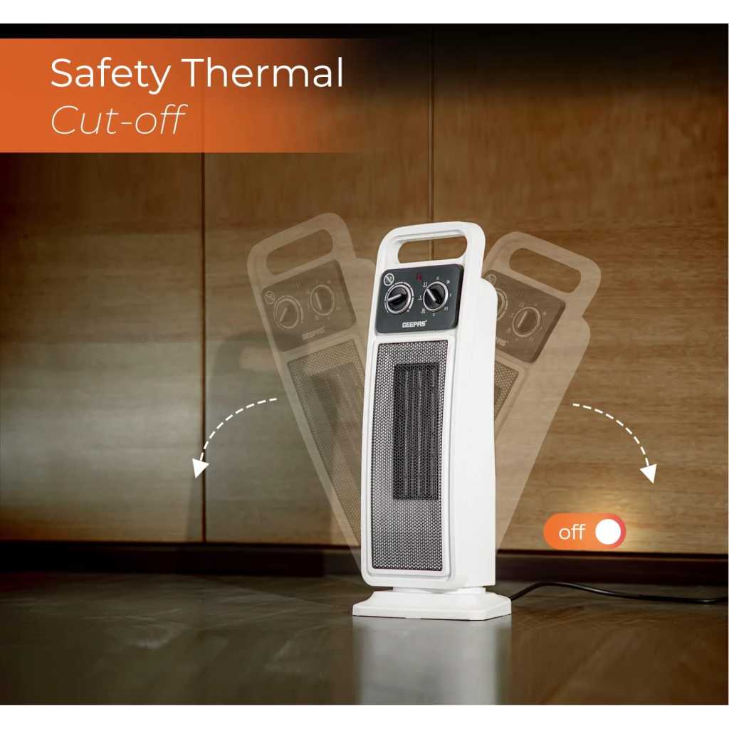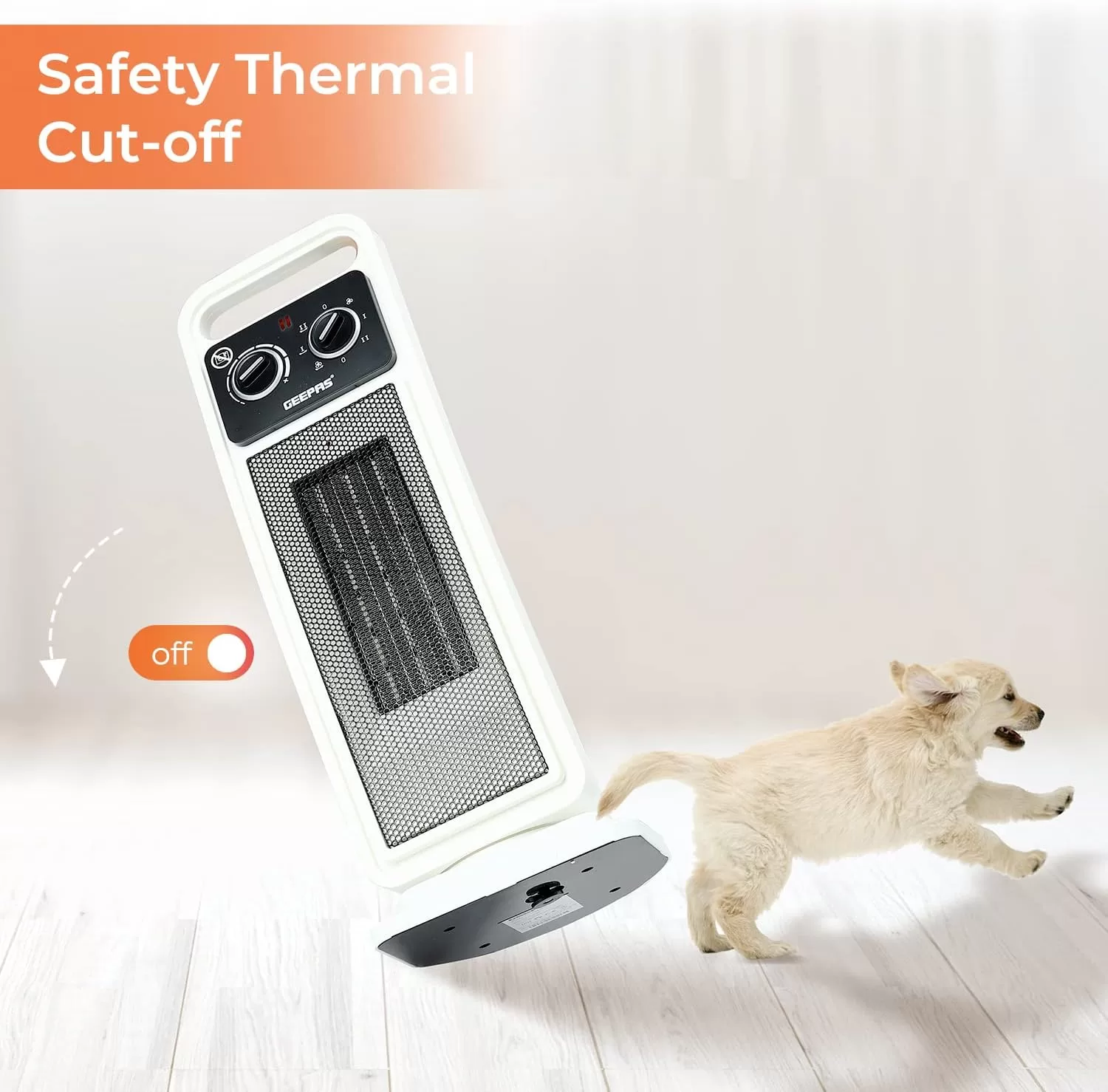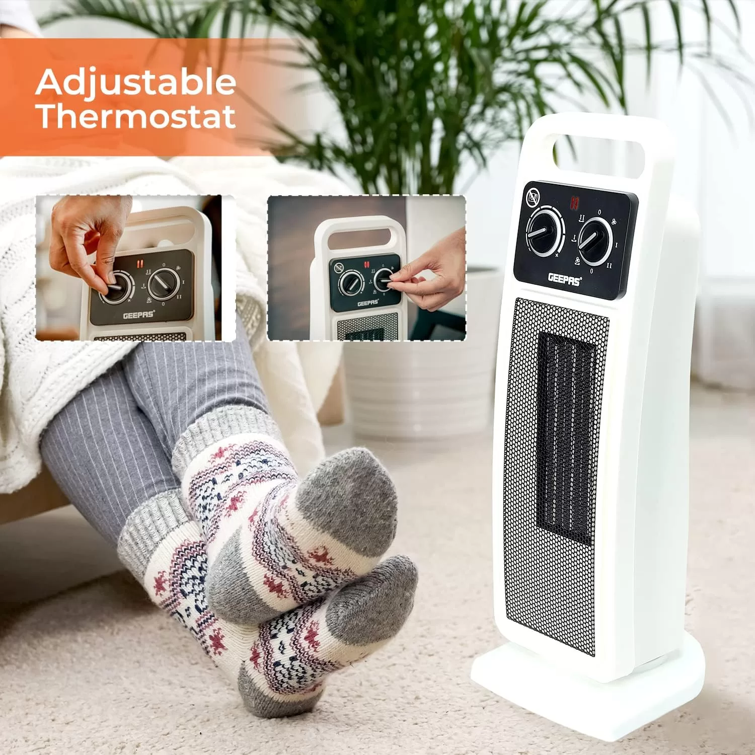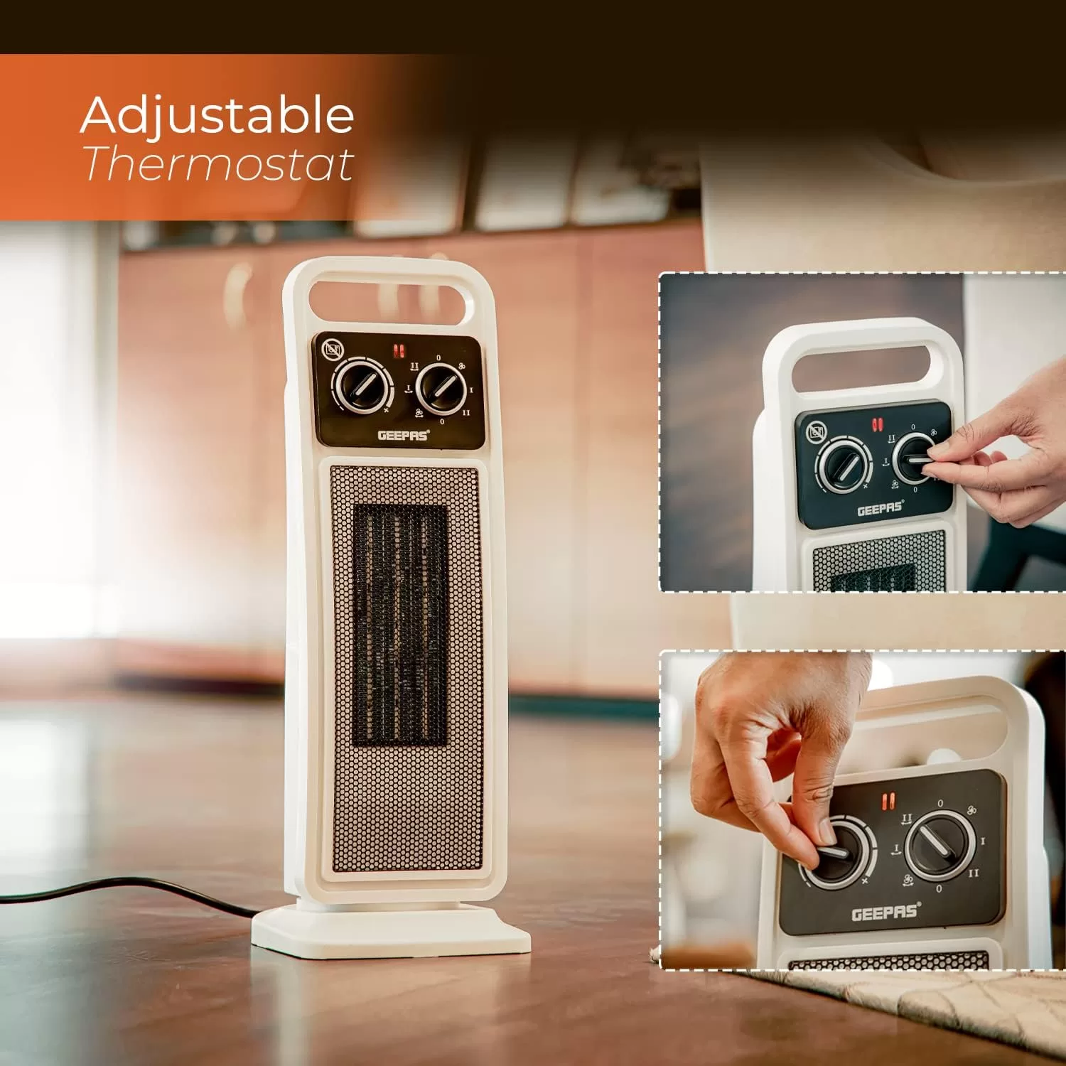 Key Features: PTC CERAMIC TECHNOLOGY: Advanced PTC ceramic heating elements provide faster, more efficient, longer, and safer heat transfer than traditional fan heaters. They operate by circulating air through the PTC element to heat it and can be slightly noisier than regular fan heaters. This electric heater is perfect for keeping you warm this winter. ADJUSTABLE THERMOSTAT: An easy-to-use and fully adjustable thermostat control is built into the mini heater to monitor the temperature around and ensure optimal heating and energy efficiency. 2 POWER SETTINGS & OSCILLATION, ADJUSTABLE THERMOSTAT: Includes 2000W (High) and 1500W (Low) power settings as well an automatic oscillation mode for heating larger rooms and spaces. An easy-to-use and fully adjustable thermostat control is built into the mini heater to monitor the temperature around and ensure optimal heating and energy efficiency. ADVANCED SAFETY, PORTABLE: Built in overheat protection and anti-tip over switch ensure the heater instantly switches off in any unsafe situation. The lightweight compact design allows the heater to be easily transported to wherever you need it most, making it great for use in homes, bedrooms, garages, schools and offices. GREAT HELPER TO WARM YOUR CORNER, HEAT UP FAST: With automatic oscillation, this space heater for indoor use increase the heat distribution range for even warmth, so that you can get the fast widespread, comfortable and efficient heating comfort. Equipped with ceramic heating elements and rated power up to 2000 watts, our PTC space heater heats quickly to provide warmth for relatively small spaces.