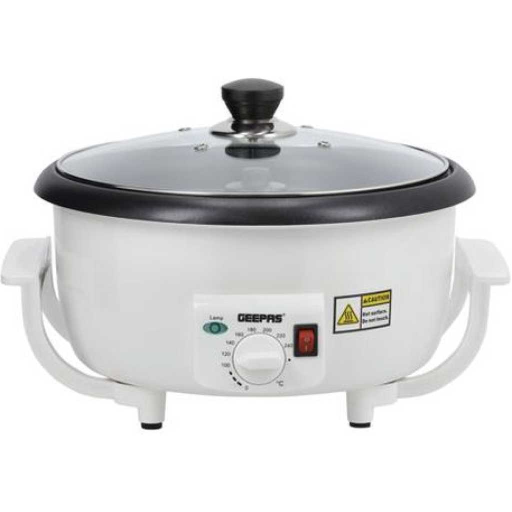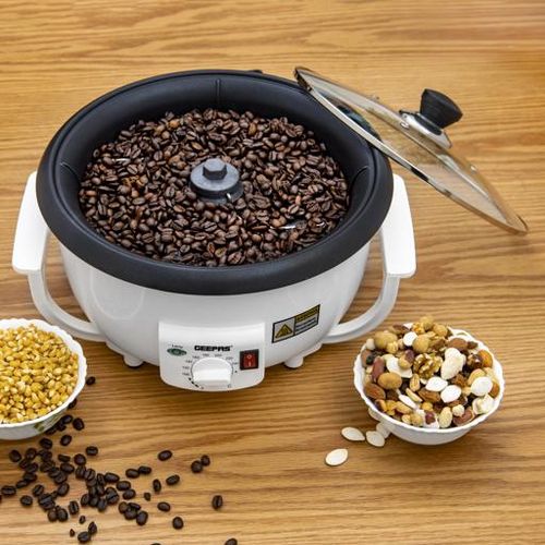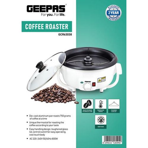 Key Features: Die-cast aluminium pan roasts 750 grams of coffee at a time Unique thermostat for roasting the coffee according to your taste Easy handling design, toughened glass lid, control switch for easy operating, cool touch body. AC 220-240V 50/60Hz 800W LARGE CAPACITY -The Geepas Coffee Bean Roaster is equipped with a roasting tray, which can roast 750gms coffee beans at a time. Please take an appropriate amount of coffee beans for roasting according to the needs, it works well in household use. BARISTA’S FAVOURITE – Temperature adjustable, suitable for coffee lovers to dark roast and light roast, I believe this will be a happy gift. Heat at constant temperature and stir evenly, so that each coffee bean can be roasted enough to release a strong aroma. The temperature range is 100 to 240 ℃, and different temperatures can be selected according to different beans and baking methods. MULTI-USE – This coffee bean roaster can be used not only to roast different amounts of coffee beans but also to roast popcorn, peanuts, soybeans, sunflowers seeds, dried fruits, and other beans, brewing the freshest coffee for yourself and your family at home. OBSERVE AT ANY TIME – There are 4 ventilation holes on the transparent cover, which can observe the status of coffee beans at any time and record the changes of coffee beans. The glass cover is strong and heat-resistant and has strong usability. HEAT EVENLY – There is a stirring rod in the baking tray, which is constantly stirred during the baking process so that the beans are heated more evenly. The bakeware adopts food-grade paint, which is safe to use and easy to clean. PROFESSIONAL DESIGN – Coffee roaster builds with rotating rods inside to stir for a uniform and thermostatic roasting heat-resistant coffee roaster.