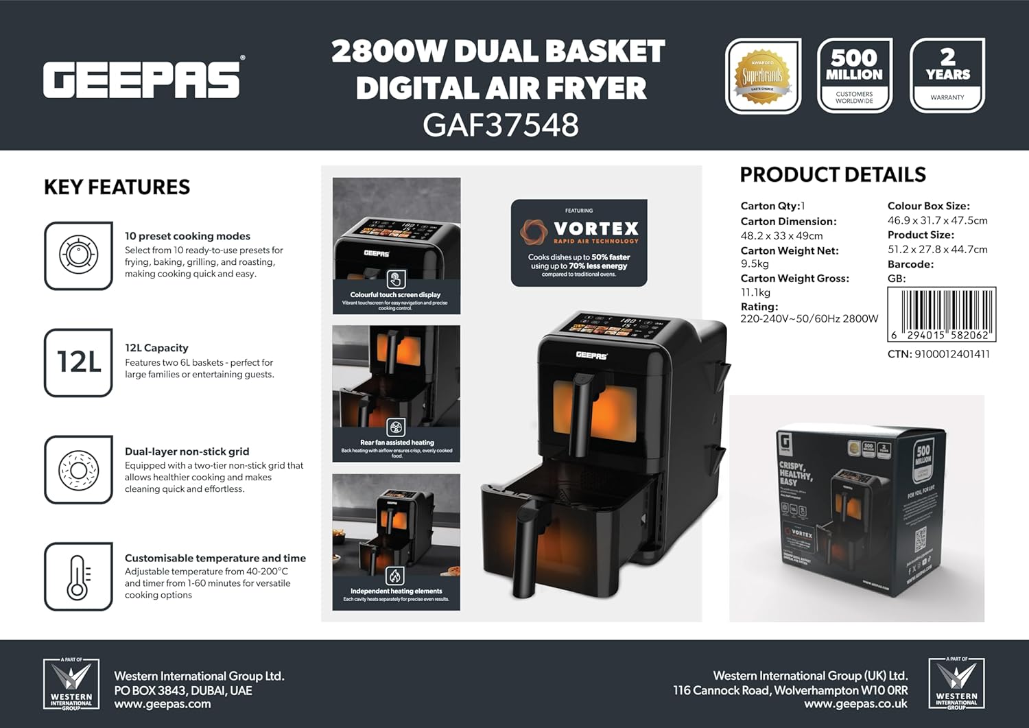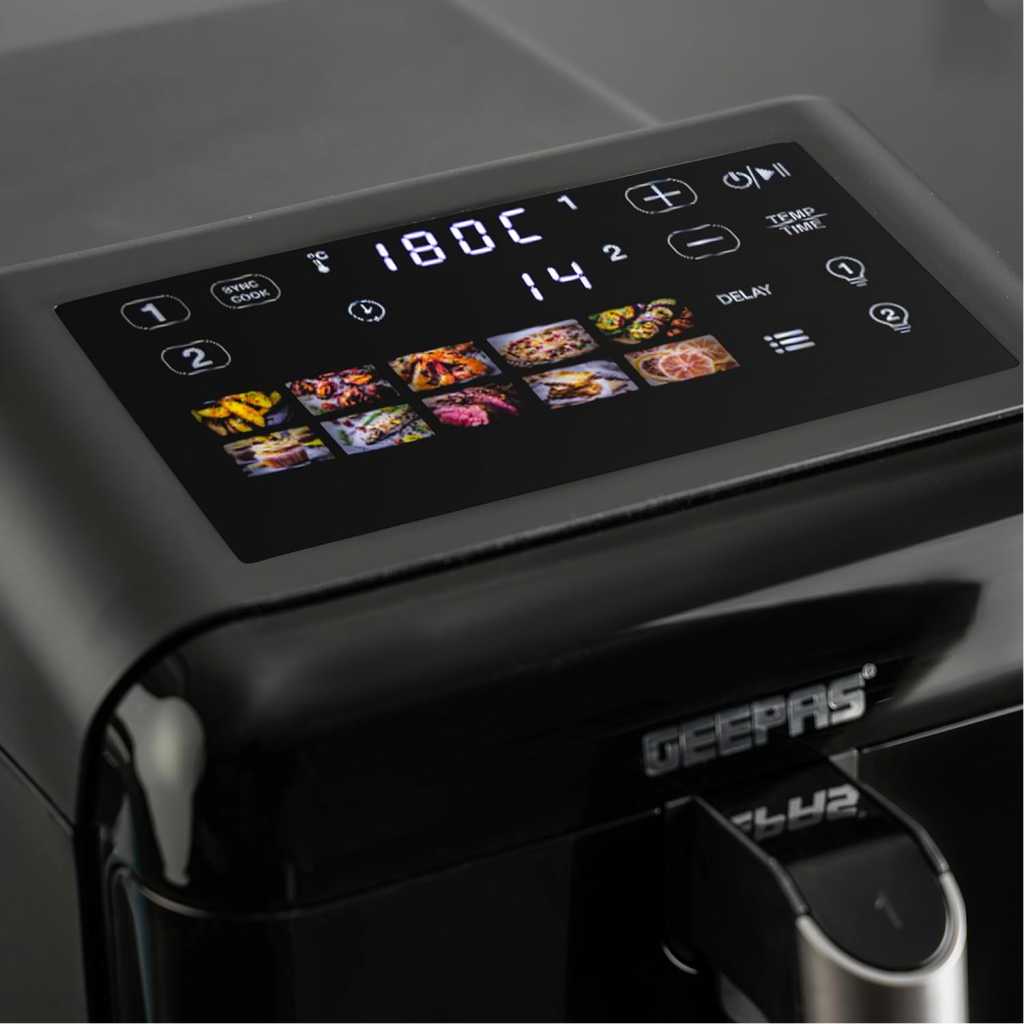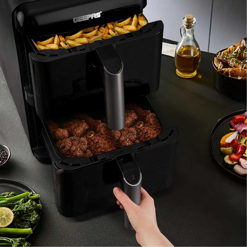 Experience smarter, faster, and healthier cooking with the Geepas 2800W Dual Basket Digital Air Fryer. Designed with innovation and convenience in mind, this advanced appliance features a 12-liter total capacity divided into two 6-liter vertically stacked baskets, allowing you to cook multiple dishes at once without mixing flavors. It is ideal for preparing perfectly fried, healthy, low-fat food without oil for the entire family. The air fryer uses VORTEX air frying technology, which cooks 50% faster with 70% less energy and ensures food is not greasy. It helps you prepare delicious foods that are crispy on the outside and tender on the inside with little to no added oil. The dual-layer nonstick coating offers quick food release and effortless cleaning, while the colorful touchscreen display provides intuitive control over 10 preset cooking modes. With customizable temperature settings (40C-200C) and a 1-60 minute timer, you can fine-tune your cooking preferences for perfect results, from crispy fries to tender grilled vegetables. You can cook various food items in it, including fries, chicken, sausages, bread, cake, and more. The strong and sturdy construction provides effortless cooking. The air fryer is also easy to clean and maintain. The genius design and utility features make it an ideal option for your kitchen, and it is also an excellent choice for gifting. Compact yet spacious, this vertical design saves counter space while doubling your efficiency. The Geepas digital air fryer comes with a 2-year warranty. The air fryer measures 51.2×27.8×44.7 cm and weighs 11 kg.