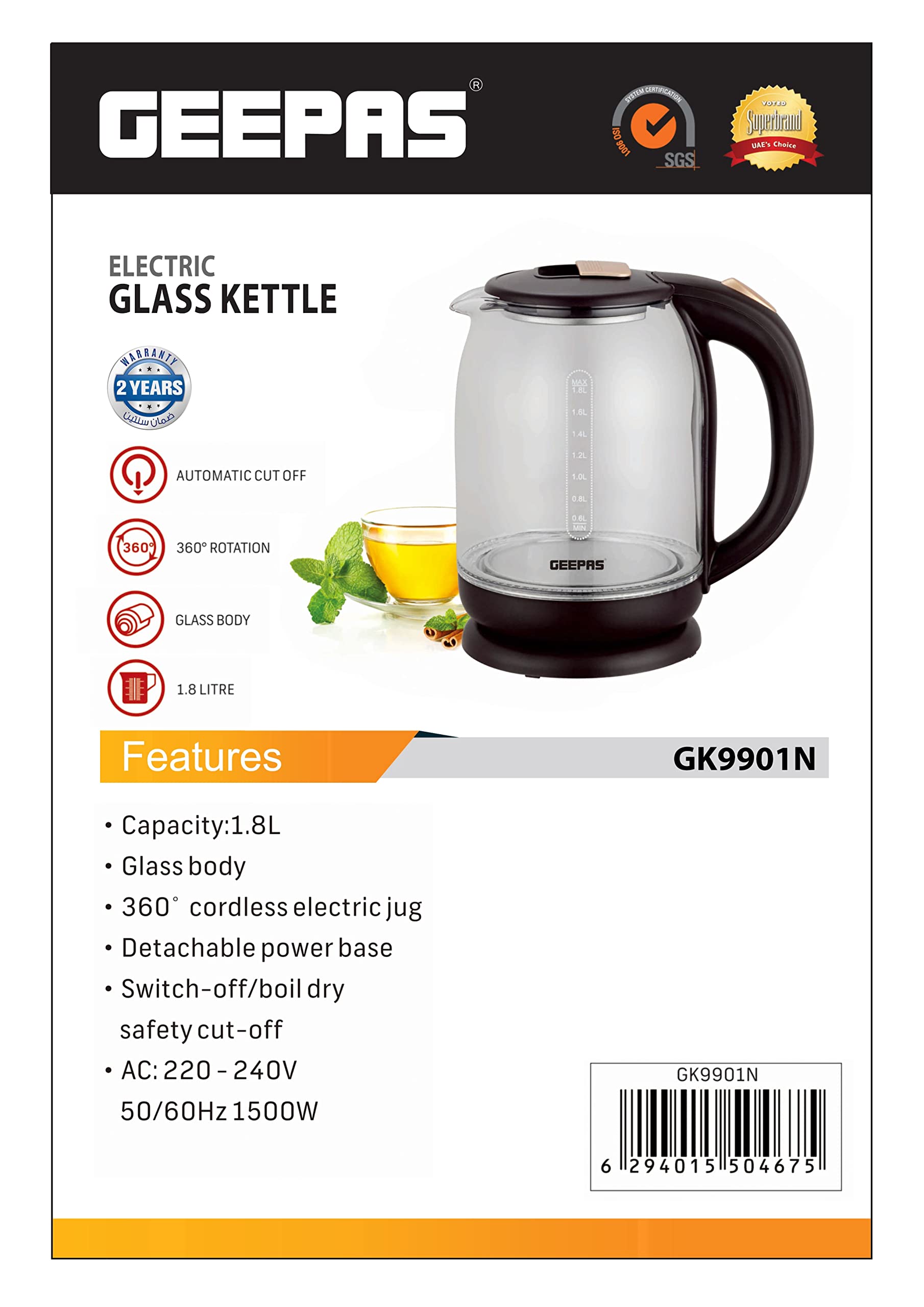 One of those handy items with a long lifespan and adequate heating! A stylish Choice! Key Features: Model Number : GK9901 Type : Electric Kettle Capacity : 1.7 Liter Material : Mixed Color : Black Brand : Geepas