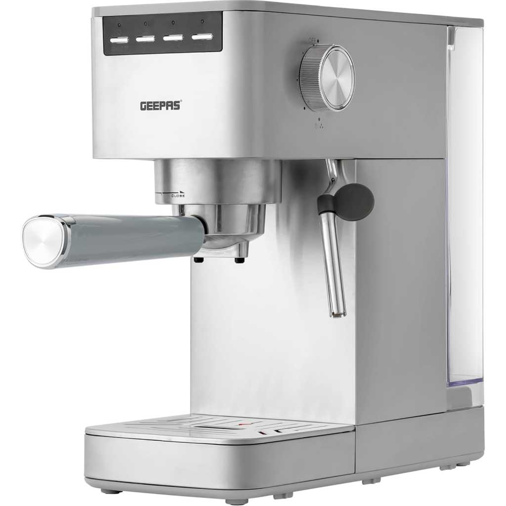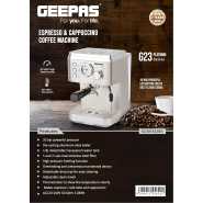 Geepas Espresso & Cappuccino Coffee Machine, 1250W – 1450W, GCM1415. The Geepas GCM1415 Espresso and Cappuccino Coffee Machine is meticulously crafted to elevate your coffee experience to new levels. This powerful machine is equipped with a 20-bar high-pressure pump and a powerful steam system , ensuring robust and flavorful coffee shots every time. Sturdy Construction : Made with durable materials for efficient heat distribution (92-96°C) and long-lasting performance. High-Pressure Frothing : Creates creamy, foamy, and velvety foam for cappuccinos and lattes. Multiple Coffee Options : Capable of making mocha, latte, cappuccino, caramel macchiato, and espresso. User-Friendly Features : Includes a detachable drip tray for easy cleaning and an automatic flow stop feature for convenience. Thermo Block Heating and Pre-Brew System : Ensures optimal brewing temperature and pre-infusion for enhanced flavor extraction. Stylish Design : The sleek silver finish adds a touch of elegance to any kitchen. Key Features: Geepas Espresso & Cappuccino Coffee Machine, 1250W – 1450W, GCM1415. 20-Bar High-Pressure Pump Powerful Steam System Sturdy Construction High-Pressure Frothing Function Multiple Coffee Options Detachable Drip Tray Automatic Flow Stop Feature Thermo Block Heating and Pre-Brew System Stylish Silver Design