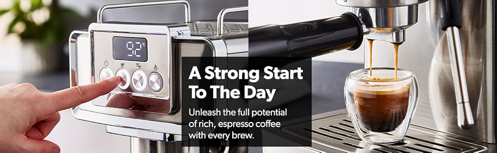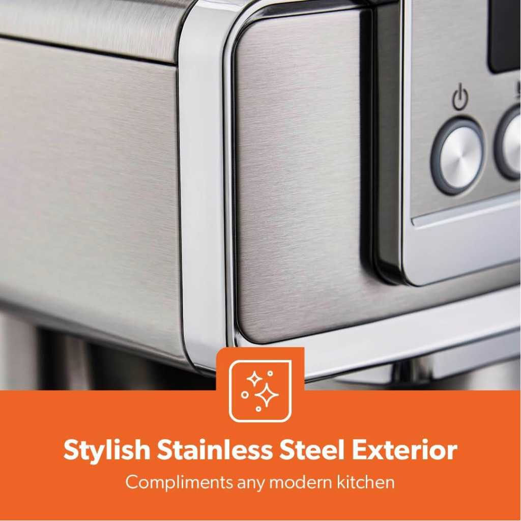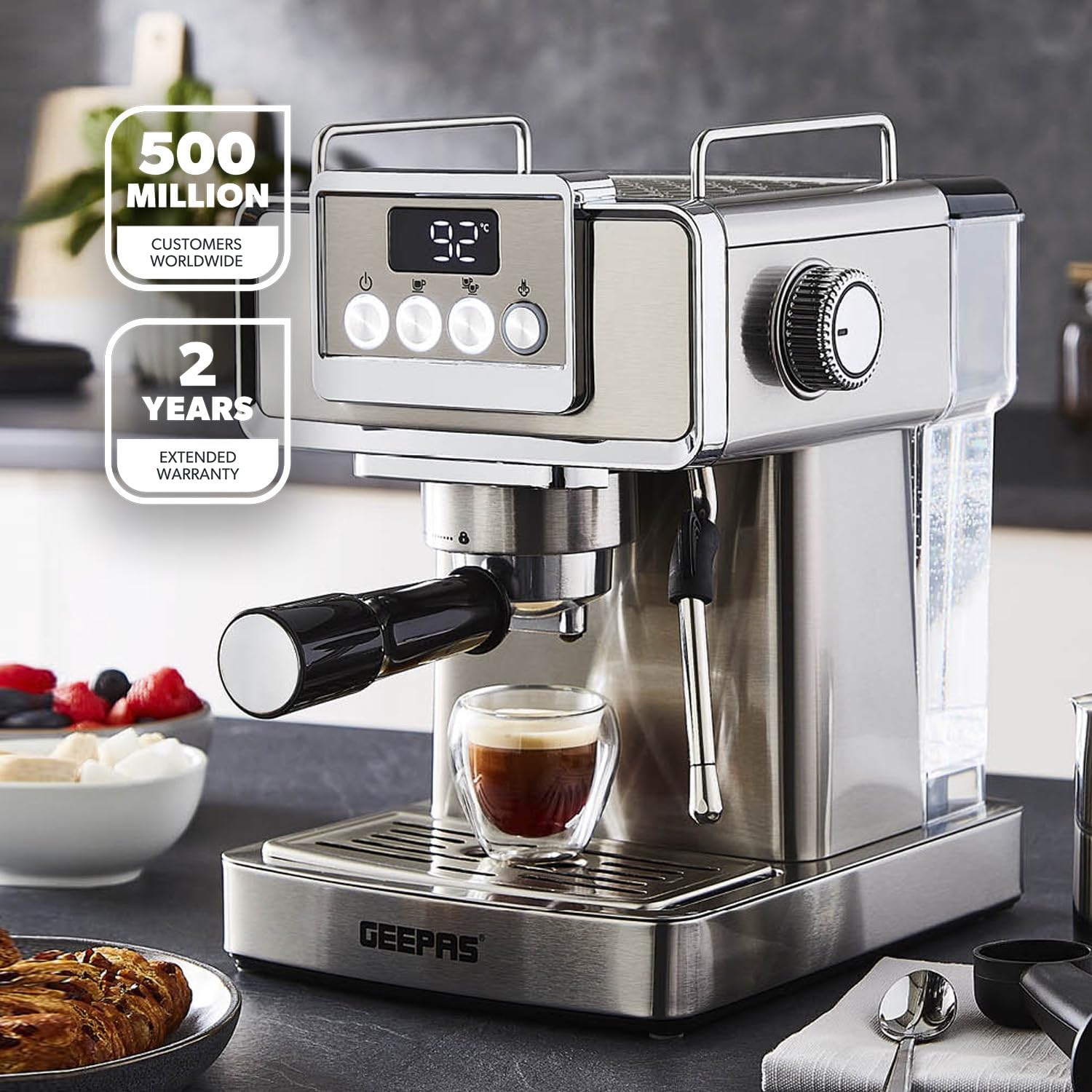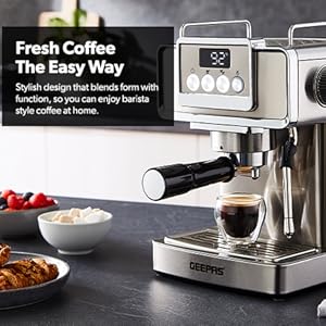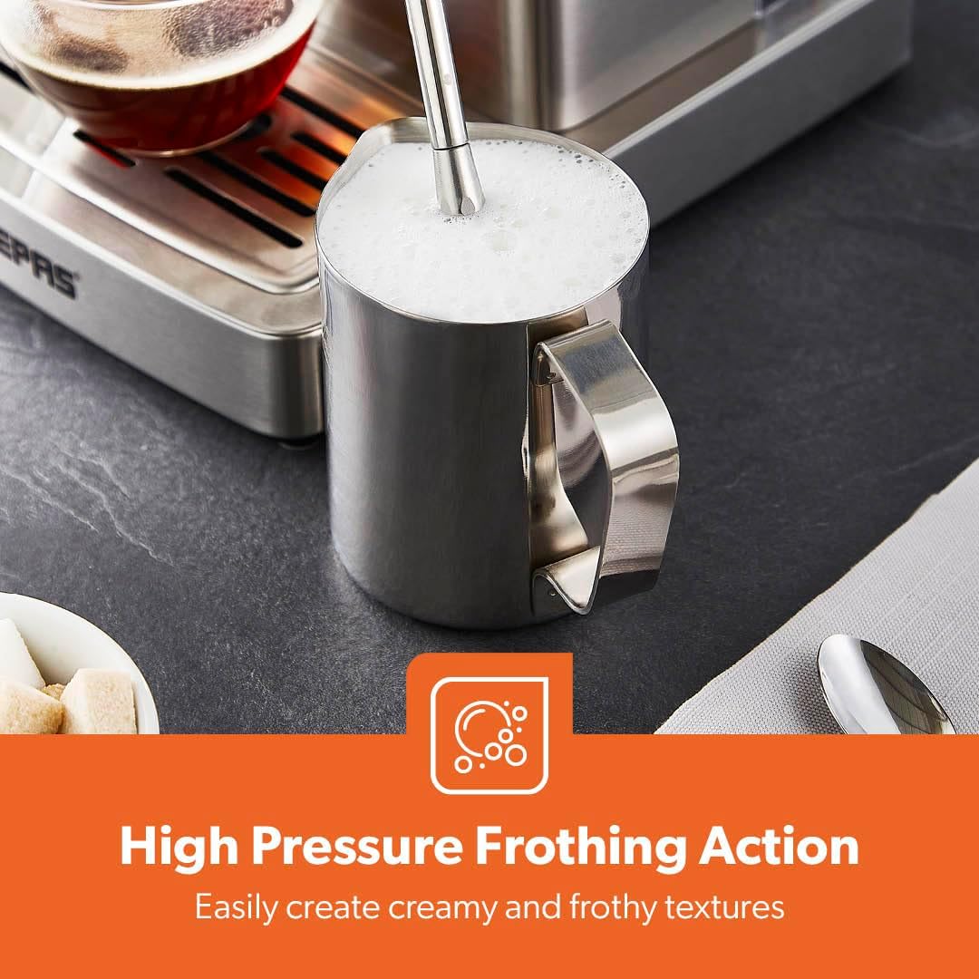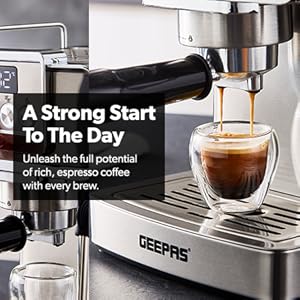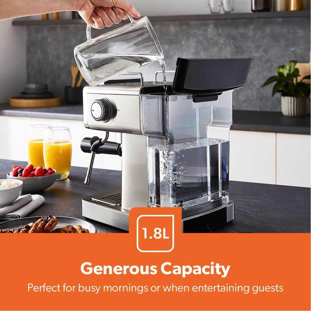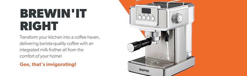 From the manufacturer Key Features: 1465W, 20 BAR POWER BREWING PUMP – A machine with a built-in 15 bar pressure brewing pump is perfect for brewing your beverages like cappuccino, espresso, ristretto, espresso macchiato, Americano, flat white, latte, etc. Enjoy it at the time you want to with powerful a 1140W motor that has less noise and high performance. DIE-CAST ALUMINIUM ALLOY BOILER WITH 1.8L WATER CAPACITY – High-quality durable boiler will give perfect taste and aroma to your coffee and you can make up to 10 to 12 cups of coffee and enjoy it with your family, friends or colleagues. Comes with a large 1.8L water tank. INTEGRATED SAFETY FEATURES – This Geepas Cappuccino Maker turns off when it is overheated and overpressure to avoid any incident or damage to your coffee maker. AC: 220-240V 50/60Hz-1465W power.