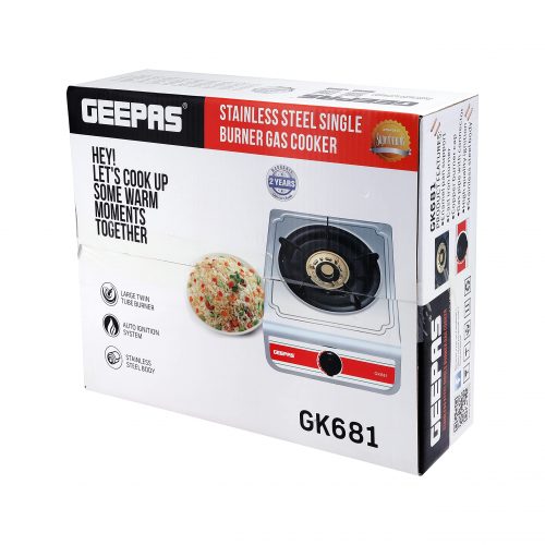 Hey! Let’s Cook Up Some Warm Moments Together Geepas Stainless Steel Single Burner Gas Stove – Modernize your kitchen space with this single burner gas stove and Embrace a stylish design along with safety features. Eases your everyday cooking efficiently and comes in a stainless steel finish body to make your kitchen spacious and appealing. You can easily place this over your kitchen counter without taking much of space and the burners of the gas stove ensure even heat distribution for excellent cooking at low gas consumption. Stainless-Steel Gas Stove Indoor-Outdoor Cook-top – The powerful burner provide the basis for efficient and effective cooking, Complete with a high-quality stainless-steel surface that requires little maintenance and has an incredibly long life. Energy Efficient Cook-top – Stainless steel body with cast iron burner, for effective and even heat distribution. Compact Design – Its compact design makes it the perfect fit for your kitchen by occupying less space and adding more utility and can easily be carried, ideal for outdoor camping. Ant-Skid Feet – Stove movement becomes a risk factor when high pressure is applied while cooking and stirring. Make cooking hassle-free and allows easy cleaning and maintenance Easy to Clean, Easy to Use – The innovative enamel drip trays are designed for easy cleaning and maintenance that gathers spills and overflows while keeping the cooktop clean. With automatic ignition, you are able to get heat instantly. Features – High Fuel Efficiency Gas Stoves made of high-quality stainless steel which is easy to maintain and long-lasting. Unique body shape makes it user friendly and easy to clean. Comes with a highly efficient burner which consumes less energy read less Key Features: Superior burner evenly distributes the flame Designed for hassle-free cleaning Press-fit knob allows you to efficiently control the flame Auto ignition for hassle-free operation Smartly pre-portioned for fast and uncomplicated grilling