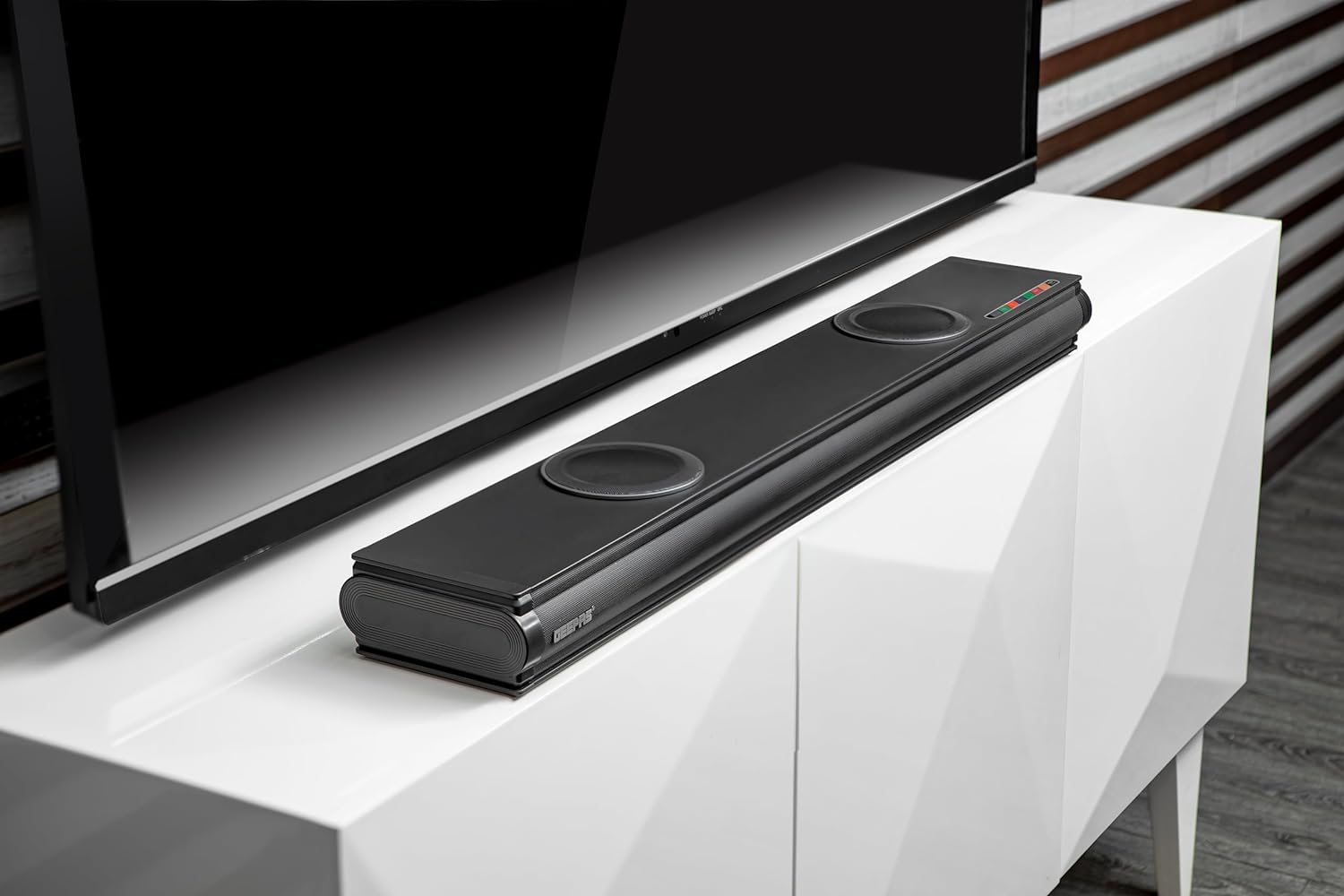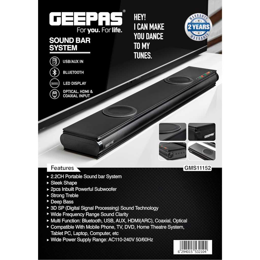 Key Features: Geepas GMS11152 Portable Sound bar System 2.2CH 2 Inbuilt Sub Woofer with 3D Sound Technology USB/AUX/BT/HDMI/Remote Included Connect to TV, Mobile, Laptop & More, Black. 2 POWERFUL SUBWOOFERS – This small and sleek sound bar is equipped with high output power and can be paired with your TV, laptop, pc, mobile and so on It creates a louder, more immersive listening experience than through your TV speakers alone It provides full- high audio quality, making bedrooms and compact spaces full of extensive stereo effects MULTIPLE CONNECTIVITY – The Sound bar supports 35mm (AUX&RCA) and optical wired audio input for use with mobile phones, tablets, TVs, computers, projectors, set-top boxes, etc Please make sure your TV audio setting to PCM for ARC/optical input before use After connecting the speaker to a laptop or mobile phone, sit on a comfortable sofa and enjoy high-quality music IMPROVE TV SOUND – Upgrade your sound quality in a smart way with this portable Geepas sound bar as it has built-in voice-enhancement technology which produces clear and quality sound effects to enjoy your favourite music, videos or while playing games It can be connected to the tv, mobile, laptop and other Bluetooth compatible devices EASY TO CONTROL FEATURES – The remote control adjusts the treble and bass intensity, switch the music or movie mode you need, meet your different scene, make your home magically become your private cinema, opera house, game hall Open the soundbar, attach the subwoofer enjoy your precious leisure time The LED screen will show the current function with ease