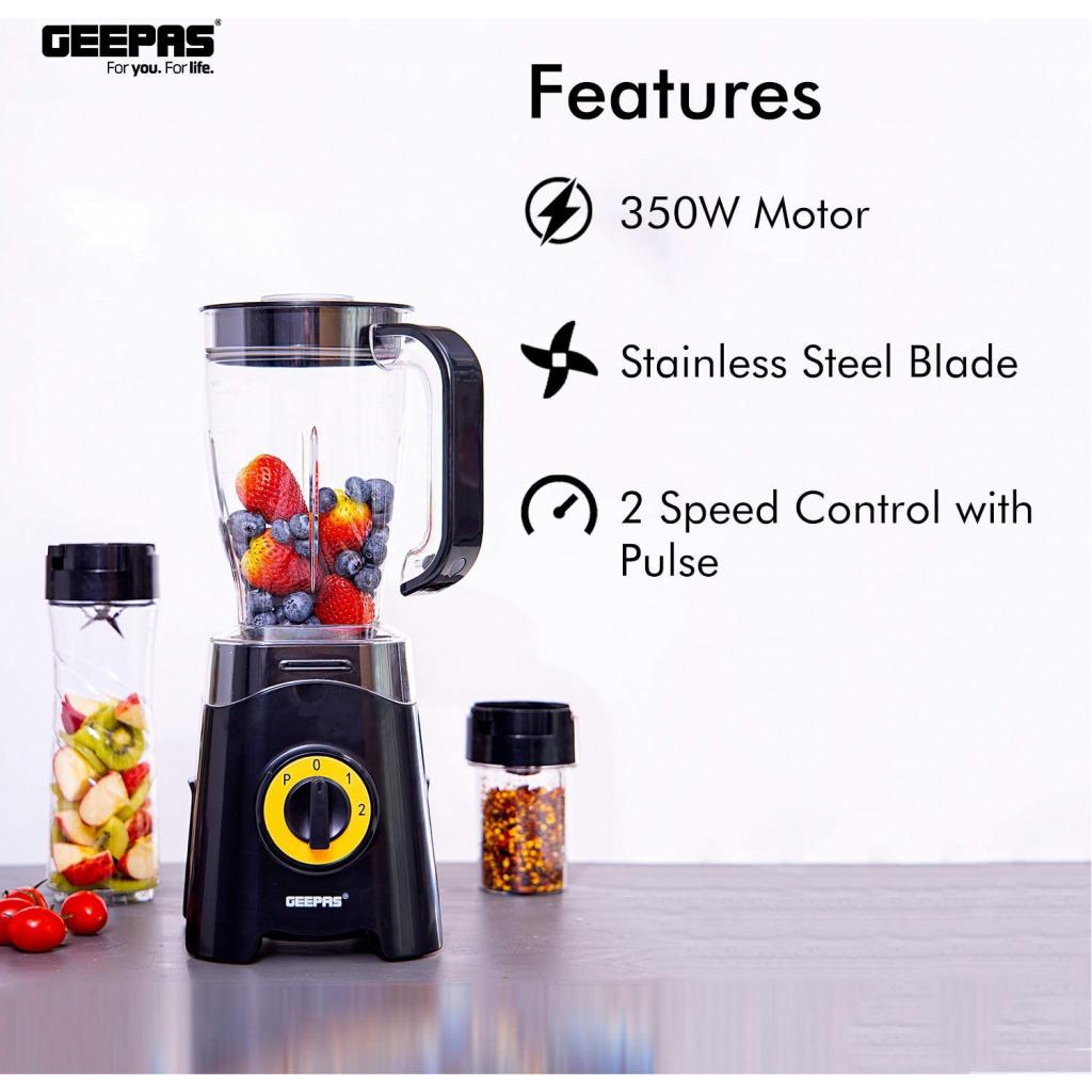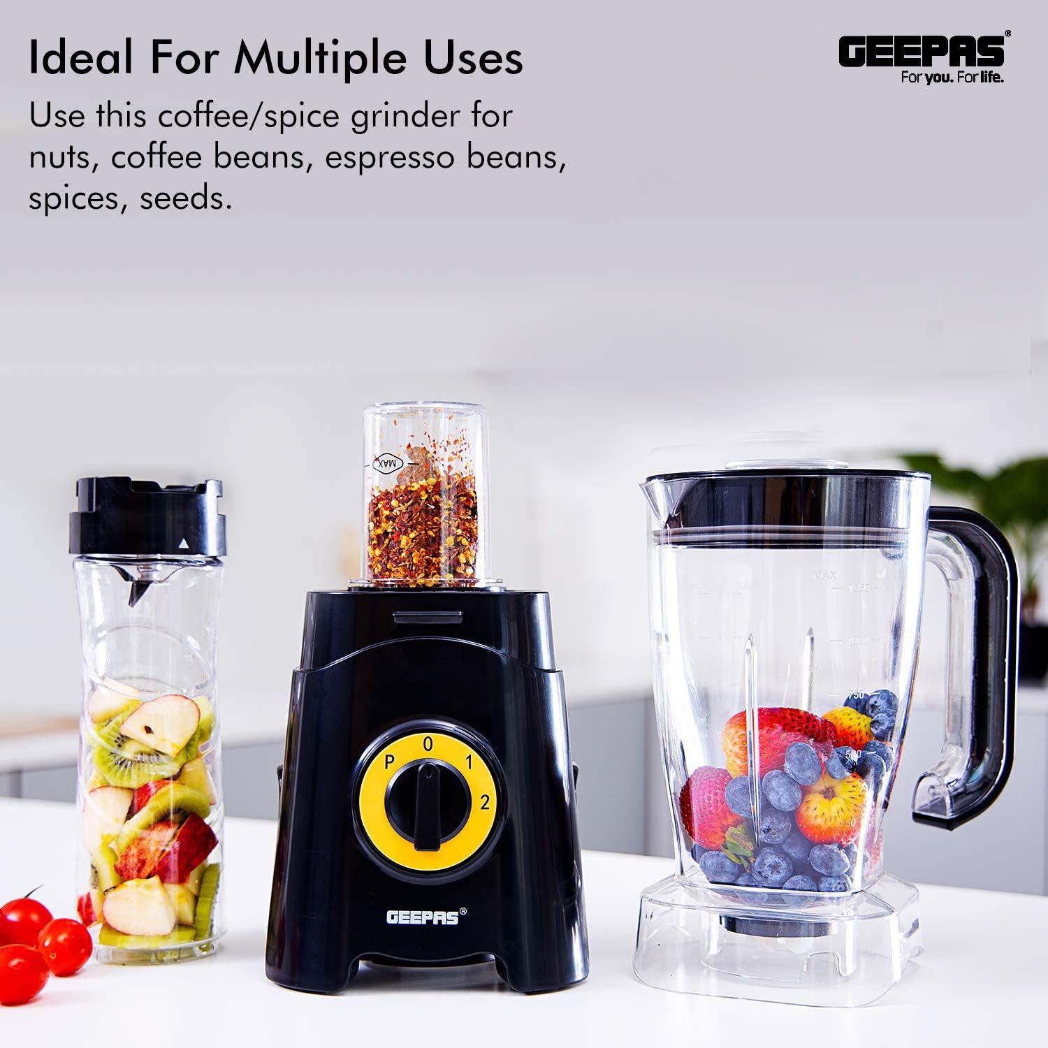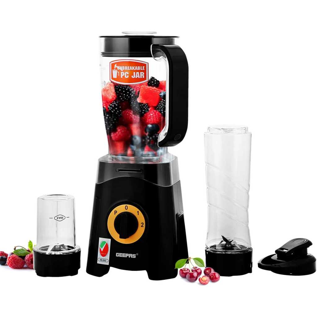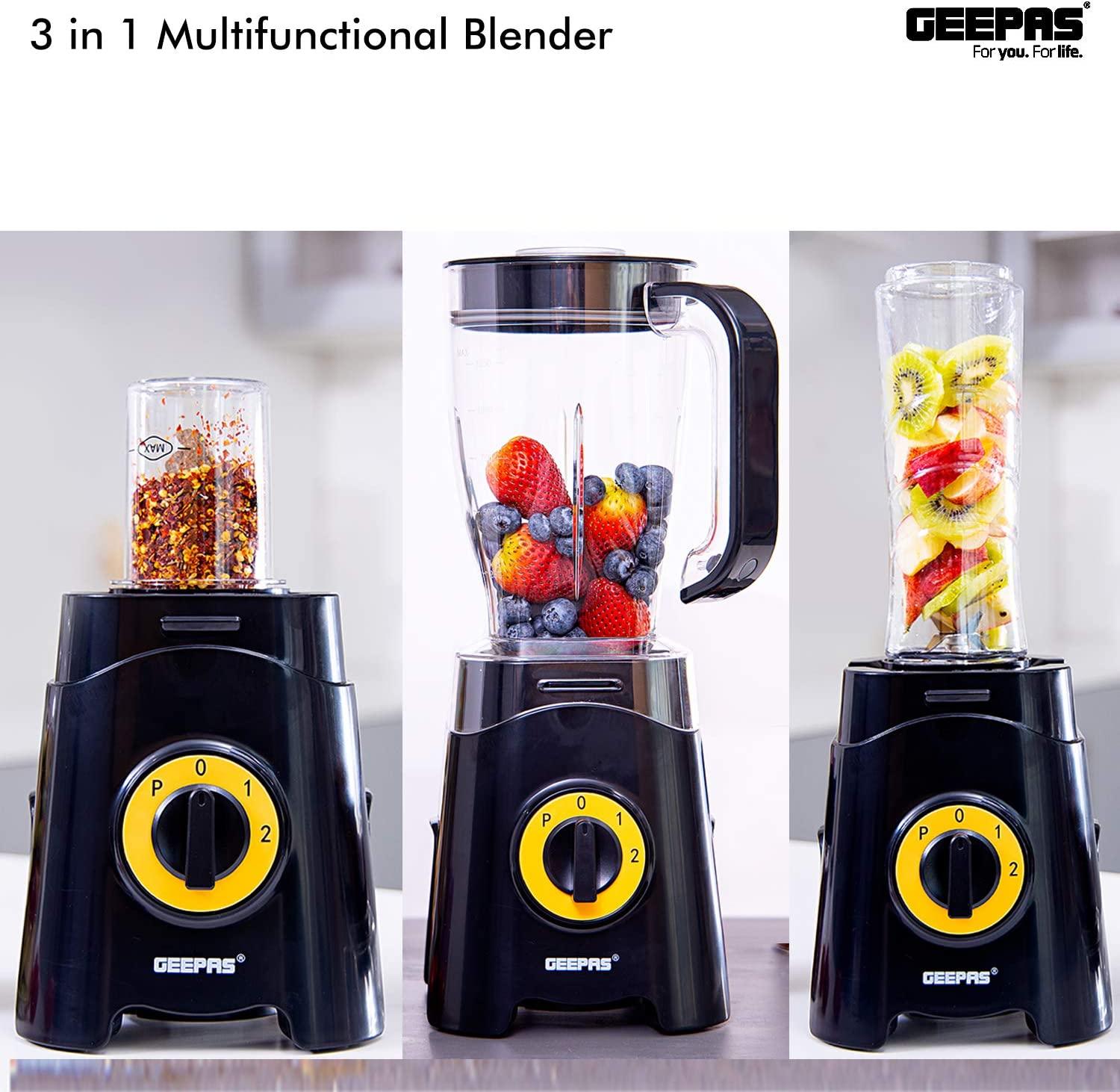Geepas GSB44033 3 in 1 Blender, Unbreakable Jar Smoothie Blender - BlackPOWERFUL MOTOR- The 350W power of this 3-in-1 multifunctional blender allows you to cope with hard fruits & vegetables. It is ideal for creating quick, easy, nutritious drinks and smoothies on the go - simply load, blend and go! Ideal for making sports drinks, protein shakes, thick smoothies, and milkshakes.1.25 L UNBREAKABLE PC JAR, COFFEE MILL INCLUDED - With a jar this big you can blend huge amounts of fruits & vegetables. It helps to save time on cutting fruits or vegetables & instantly get a glass of tasty & healthy juice within a few seconds. Use this for grinding nuts, coffee beans, espresso beans, spices, seeds, and anything else that needs a ground up. Safety lock design and motor overheat protection.CONVENIENT 500ML BOTTLE FOR TRAVEL & OUTDOOR - Comes with 500ML Tritan sports bottle with leak-proof travel lid. You can take the bottle anywhere and enjoy a delicious smoothie, yogurt or protein cocktail, fresh thick juice anytime, working, studying, or traveling.STAINLESS STEEL CUTTING BLADE - With these long-span blades made of stainless steel, you can cut all kinds of fruits and vegetables.2 SPEED CONTROL WITH PULSE, 2 YEAR WARRANTY - Keep control over your blending and juicing creations with the dual-speed functions. And with the "Pulse" function grind the ice to the smallest grains & gives you the option to use full blade speed to blend hard chunky ingredients quicker.Product dimensions (LxBxH): 15.0x19.0x38.0 cmAC: 220-240V, 50/60Hz, 300-350W