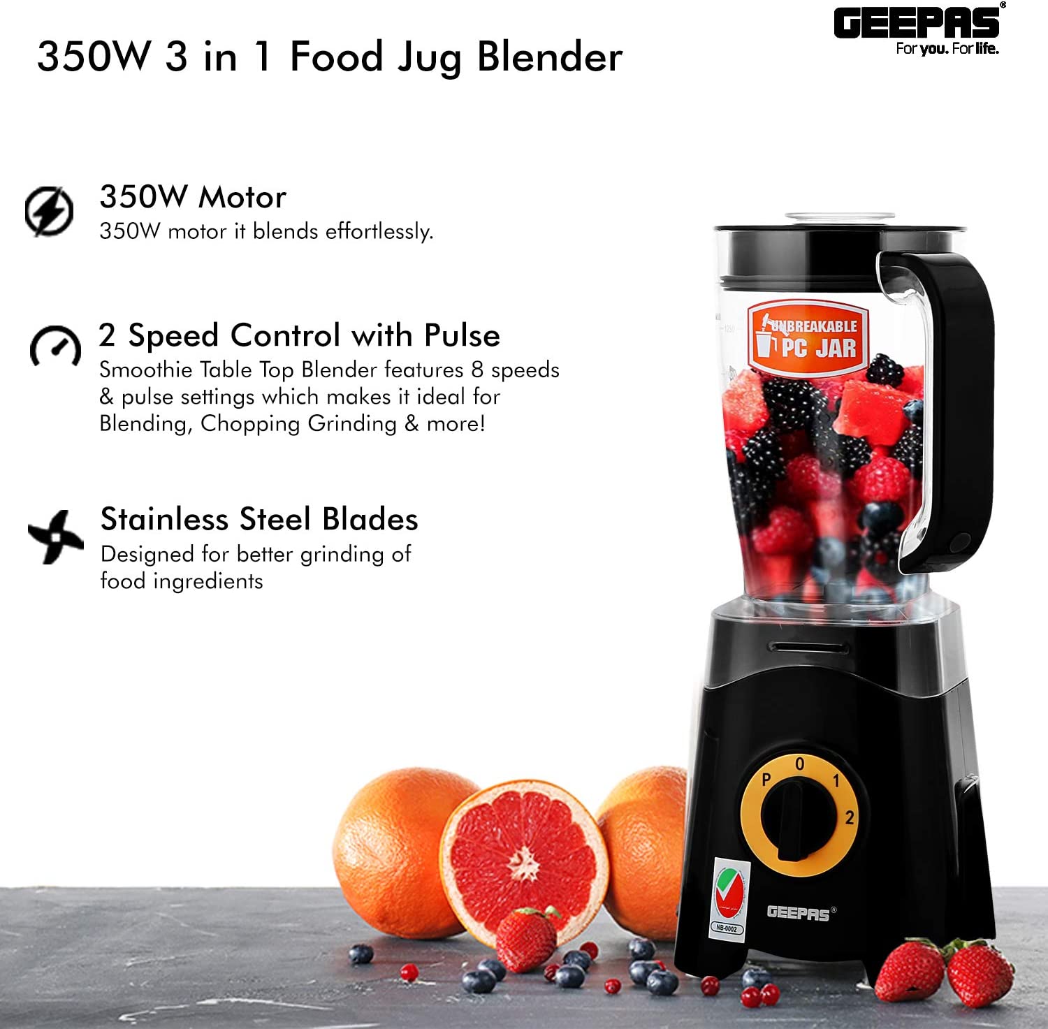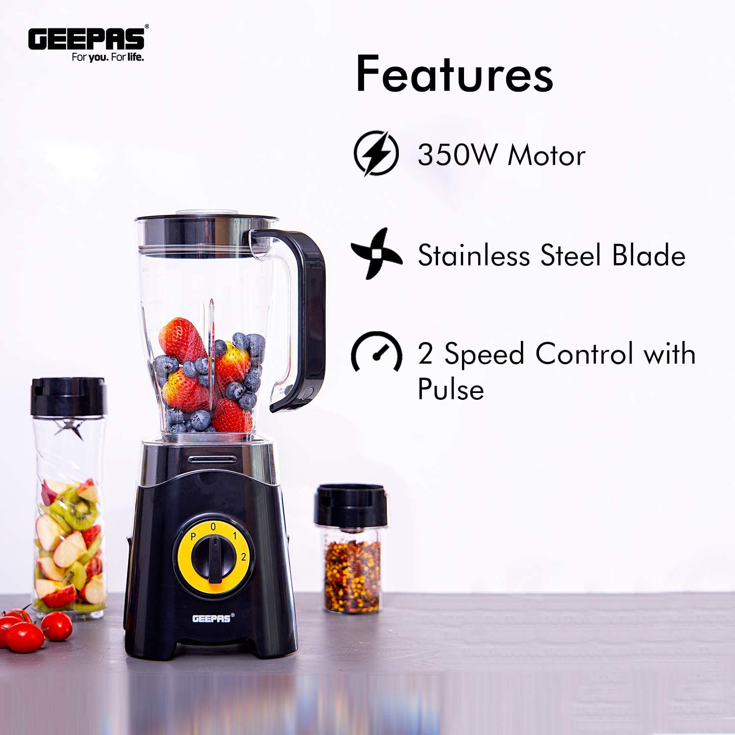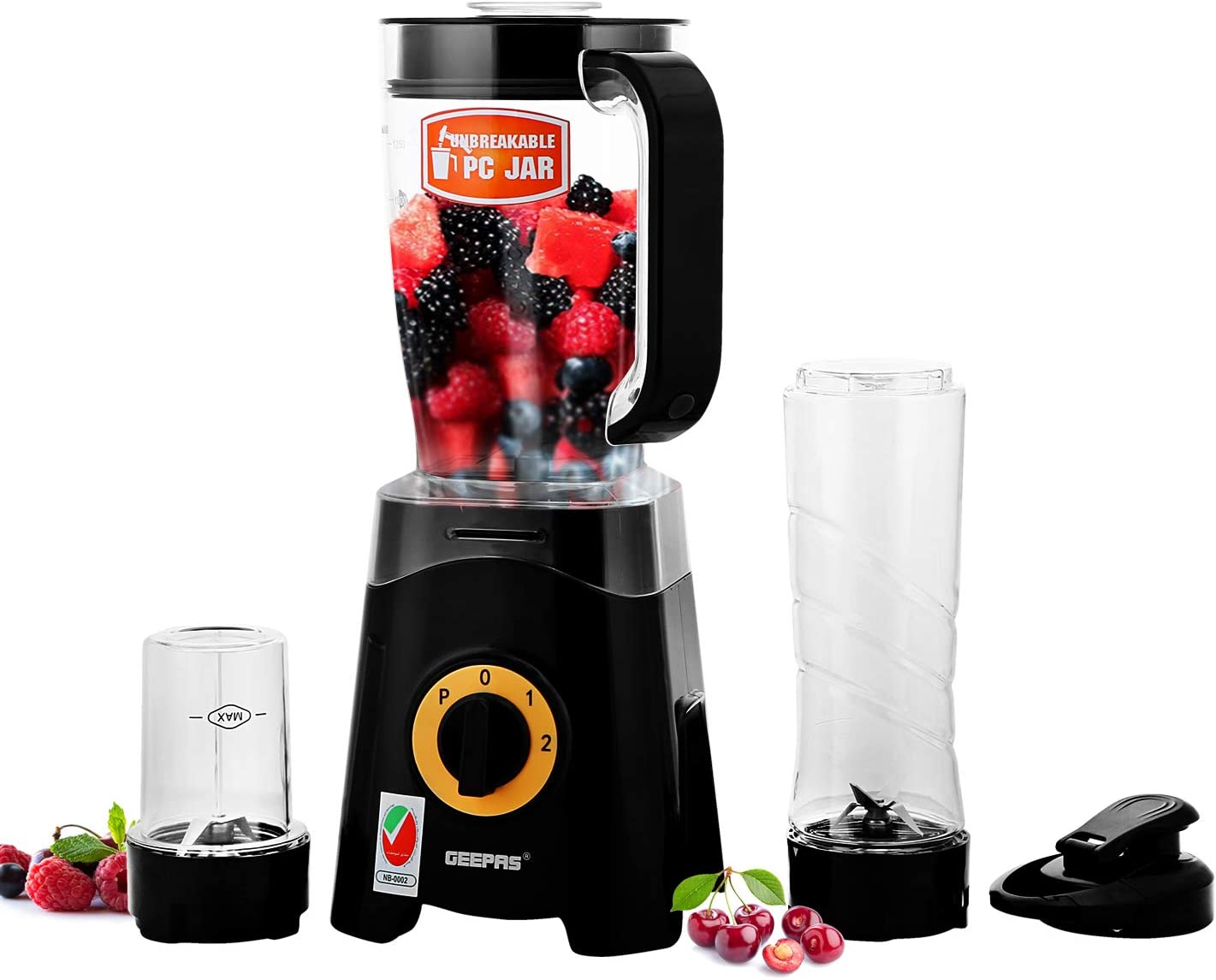 Geepas GSB44033 3 in 1 Blender, Unbreakable Jar Smoothie Blender - BlackPOWERFUL MOTOR- The 350W power of this 3-in-1 multifunctional blender allows you to cope with hard fruits & vegetables. It is ideal for creating quick, easy, nutritious drinks and smoothies on the go - simply load, blend and go! Ideal for making sports drinks, protein shakes, thick smoothies, and milkshakes.1.25 L UNBREAKABLE PC JAR, COFFEE MILL INCLUDED - With a jar this big you can blend huge amounts of fruits & vegetables. It helps to save time on cutting fruits or vegetables & instantly get a glass of tasty & healthy juice within a few seconds. Use this for grinding nuts, coffee beans, espresso beans, spices, seeds, and anything else that needs a ground up. Safety lock design and motor overheat protection.CONVENIENT 500ML BOTTLE FOR TRAVEL & OUTDOOR - Comes with 500ML Tritan sports bottle with leak-proof travel lid. You can take the bottle anywhere and enjoy a delicious smoothie, yogurt or protein cocktail, fresh thick juice anytime, working, studying, or traveling.STAINLESS STEEL CUTTING BLADE - With these long-span blades made of stainless steel, you can cut all kinds of fruits and vegetables.2 SPEED CONTROL WITH PULSE, 2 YEAR WARRANTY - Keep control over your blending and juicing creations with the dual-speed functions. And with the "Pulse" function grind the ice to the smallest grains & gives you the option to use full blade speed to blend hard chunky ingredients quicker.Product dimensions (LxBxH): 15.0x19.0x38.0 cmAC: 220-240V, 50/60Hz, 300-350W