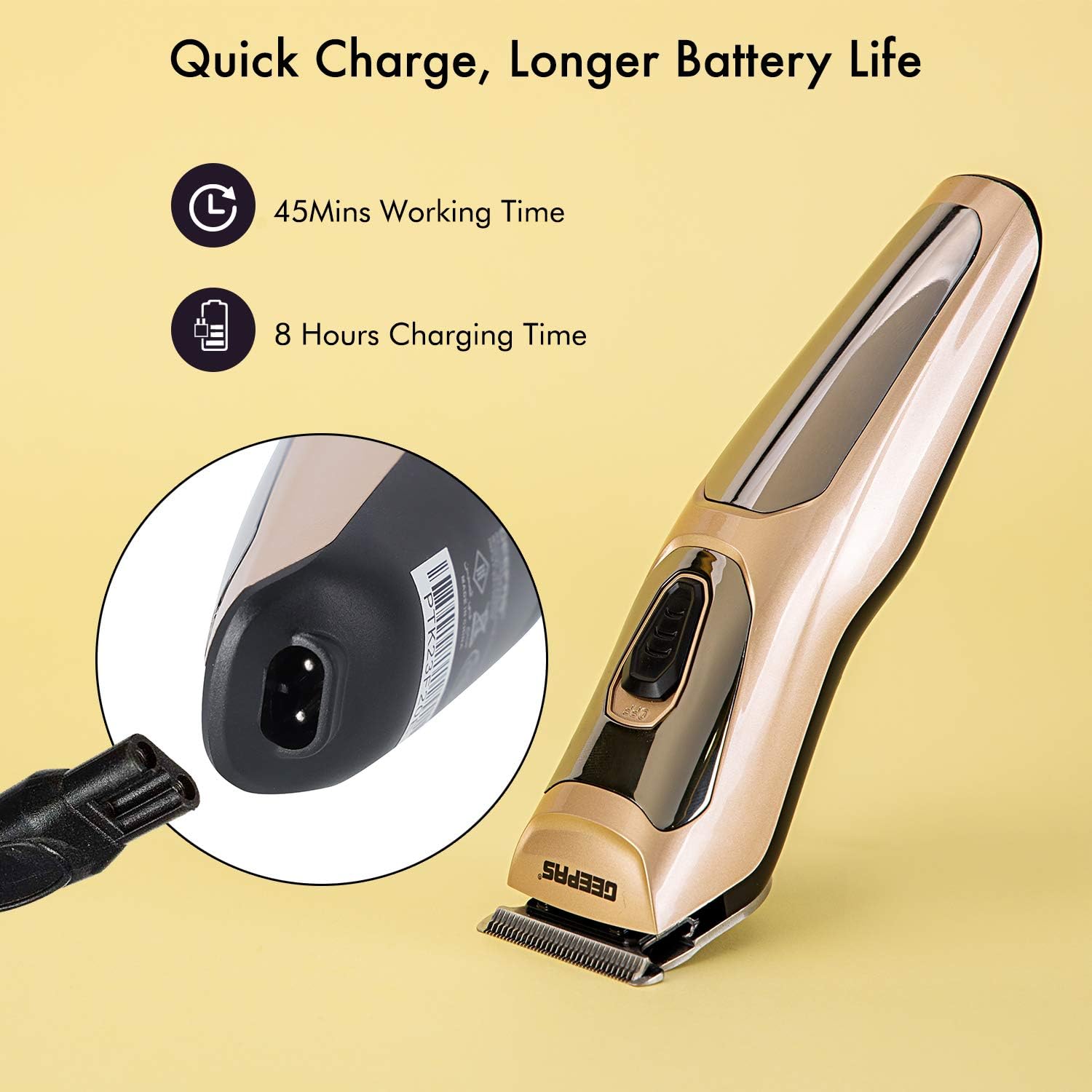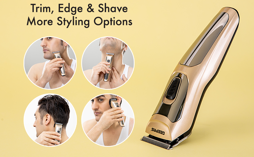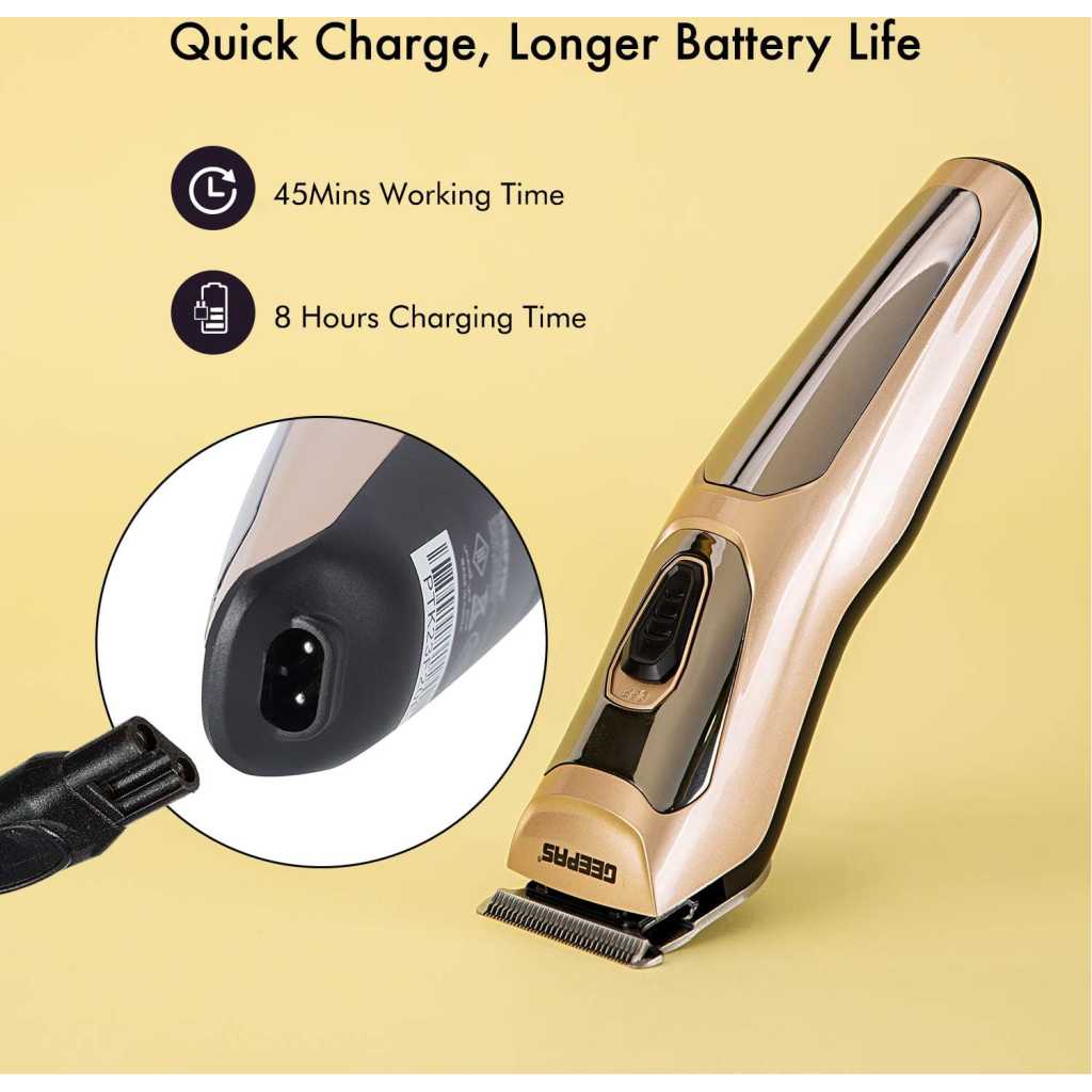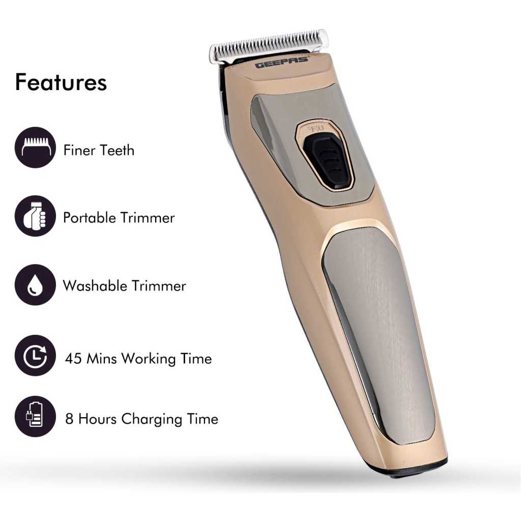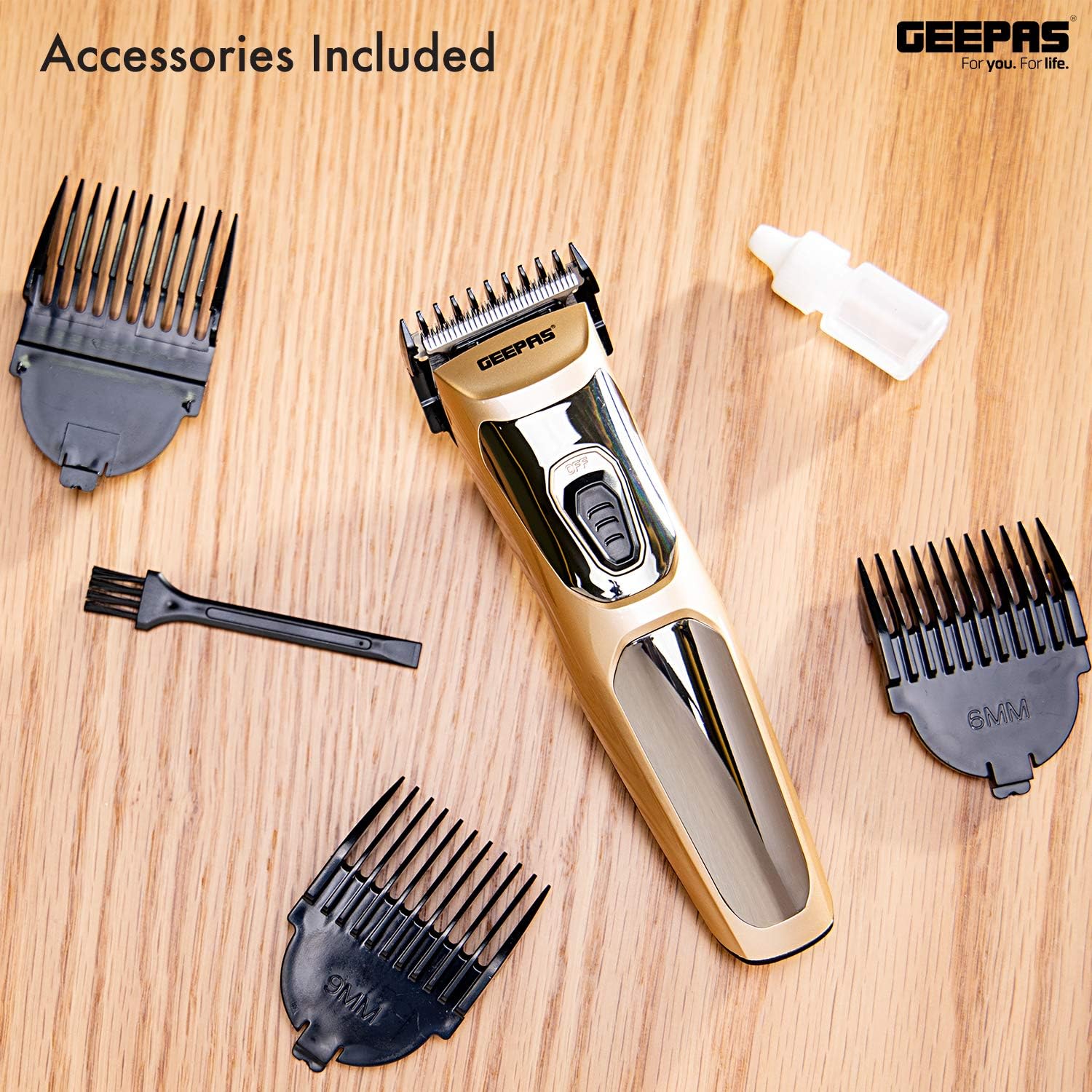 Geepas GTR56023 Rechargeable Hair Clipper Precise Beard Styler With Fine Steel Head – Pack of 1, Small, Gold. Geepas Rechargeable Hair Clipper Battery 300 mAh – Precise Beard Styler with Fine Steel Head Indicator Lights, Cordless Trimmer, 45 Minutes Working in Single Charge. IDEAL FOR FACE AND BODY – The trimmer blade has rounded tips for smooth skin content ensuring maximum durability and excellent results. The blade is even and it reduces the risk of any injury to the face or body making it ideal for sensitive skin. Fully washable beard hair clipper head and trimming comb attachment.45 ACUTE ANGLE BLADE – This multifunctional trimmer uses sharp and precise blades bent at an angle of 45. Ideal for complete grooming, for beards, stubble, necklines and sideburns it gives you the freedom of cordless trimming, with soft touch elements. 20-LENGTH SETTINGS, ADJUSTABLE COMB – 20 precision length settings from 0.5mm to 10mm steps provide ultimate control and precision on all beard lengths. This trimmer uses the lock & cut mechanism. The comb easily trims the beard by locking the hair and trimming at the end giving a fine cut. Make different beard and hairstyles. RECHARGEABLE & UP TO 1 HOUR WORKING TIME – The trimmer uses Ion Lithium battery with 500mAh large capacity. The battery allows discharging and recharging. It charges up in 2 hours and has a working time of 1 Hour. ACCESSORIES. It includes Charging cable and Lubricating. Set Contains: GEEPAS GTR56023, Rechargeable Hair Clipper For Men. Set Contains: GEEPAS GTR56023 Rechargeable Hair Clipper Precise Beard Styler with Fine Steel Head – Pack of 1 Key Features: Geepas GTR56023 Rechargeable Hair Clipper Precise Beard Styler With Fine Steel Head – Pack of 1, Small, Gold. DURABLE STEEL BLADES – Comes durable steel blades reduce the risk of any skin injury making it ideal for sensitive skin 45 MINUTES LONG WORKING TIME – Highly powerful 300mAh rechargeable battery has a great working time of up to 45 minutes in a single charge Has a washable head. Brand: Geepas