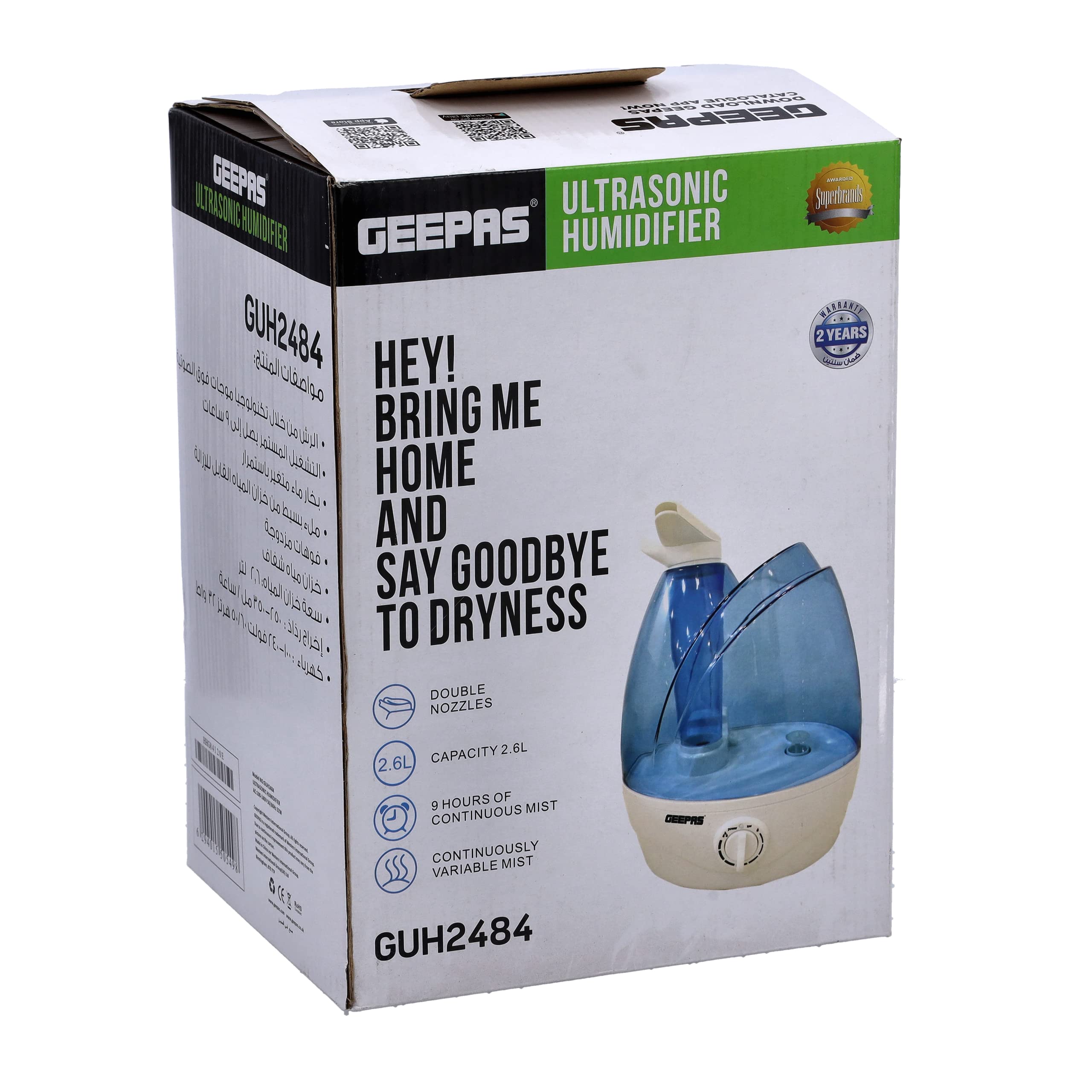 Key Features: Brand : GEEPAS Type : Humidifiers MODEL NO GUH2484 RATED VOLTAGE 100 V-240 V RATED POWER : 43 WATTS WATER TANK CAPACITY : 2.6 LITER VOLUME OF WETTING 250 ML/H