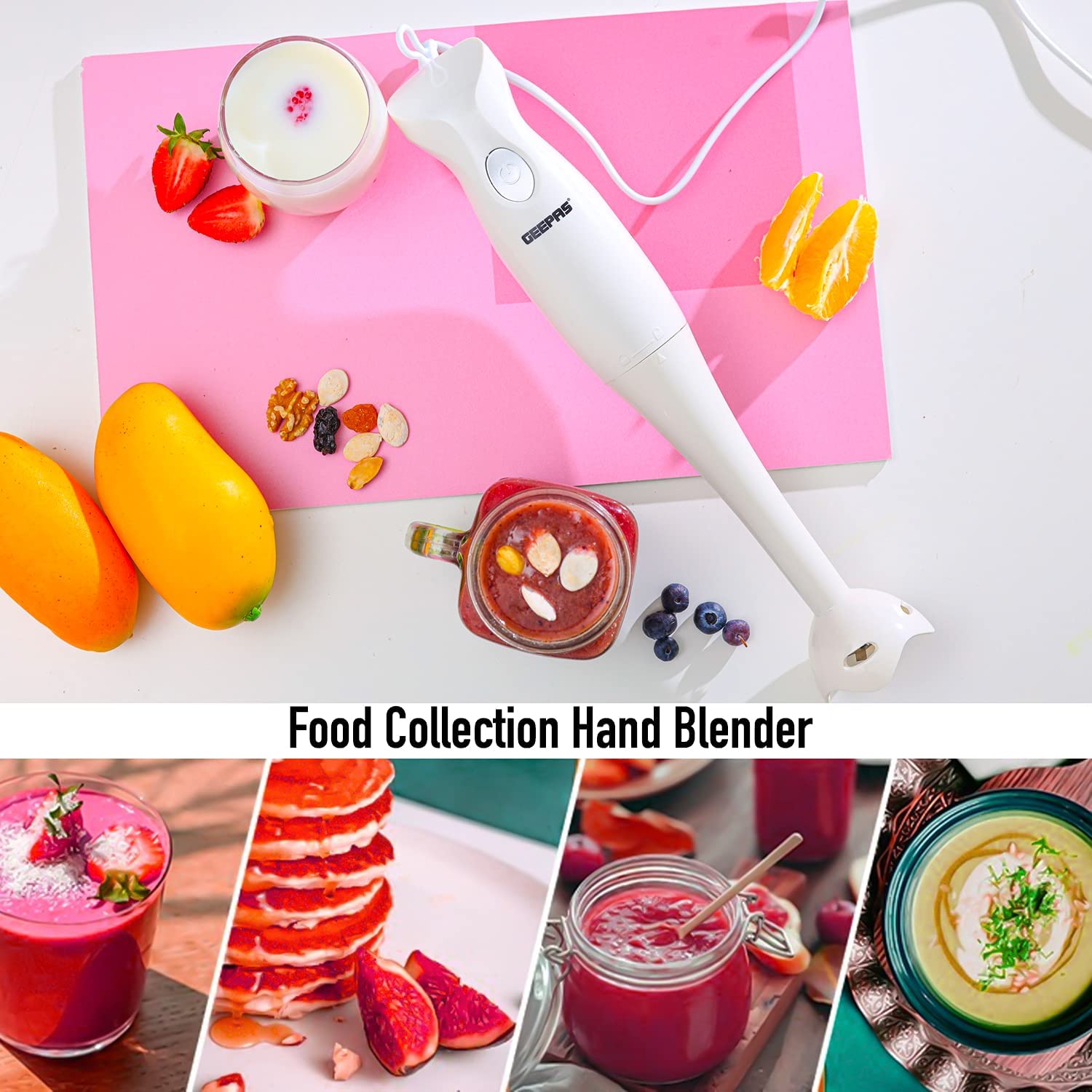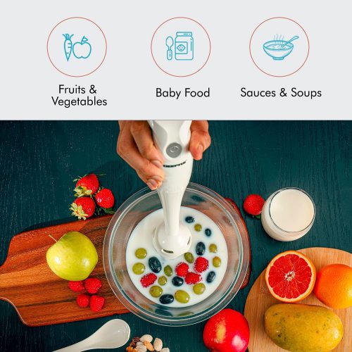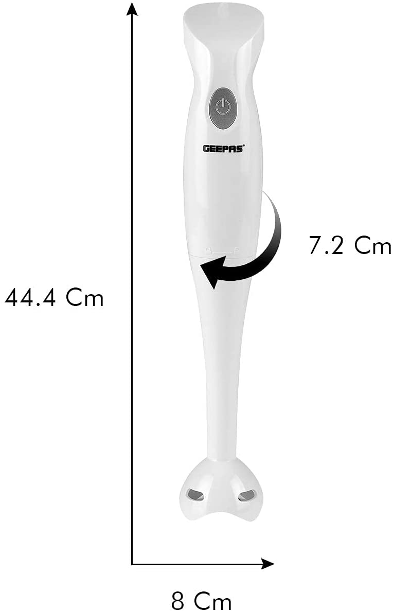 1. INJECTION SHELL AND BEAUTIFUL DESIGN – The hand blender blade is covered with a white injection shell. It prevents the contents from flying off while blending. The body is made of white plastic. It has a purple-colored button and an adornment circle in the middle. It gives your tool a lovely look. 2. BEAUTIFUL DESIGN – The body of the hand blender is made from plastic. It is white in color. The On/Off button is purple in color, and the middle also has an adornment circle. It has an elegant look and adds to the beauty of your kitchen. 3. TWO SPEED SETTINGS – The Geepas Hand Blender says goodbye to complicated displays and endless buttons and instead gives you two simple speed settings to choose from. With a slower speed perfect for making chunky dips like salsa and guacamole and a faster speed for making silky and creamy smoothies after a hard workout at the gym, there’s a speed for your every need. 4. DETACHABLE PLASTIC STICK – With detachable parts perfect for easy cleaning, you can now sit back, relax, and enjoy a feast of flavorsome food whilst the attachments soak in the sink. t clears all the hygiene issues and reduces the effort. And the best part is afterward the detachable parts can be neatly stored away into a spare cupboard or draw for a clutter-free kitchen. 5. COMFORTABLE GRIP – The handle is a significant part of this blender since you’ll be holding it the entire time while using it. Therefore, the grip has been kept very comfortable, and it fits your palm perfectly. It has an anti-slip design; therefore, you can relax while using it.
