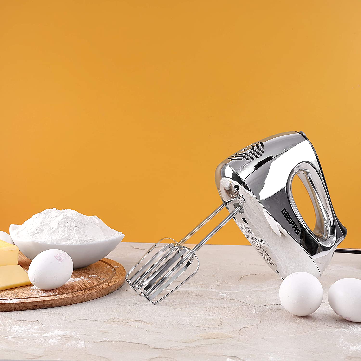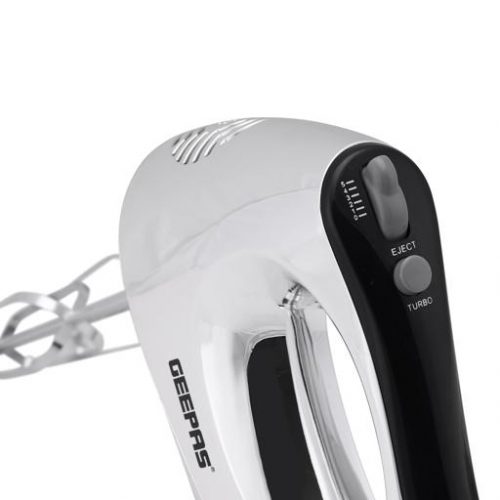 Key Features: 5 SPEED WITH TURBO FUNCTION – Powerful 200W motor with 5-speed settings carry out processes of whipping and mixing for an extra boost of power. Indispensable for cooking dough. Due to the increased speed, the dough turns out to be homogeneous. Turn this function periodically because the mixer motor overheats when the load is high. 200 W POWER – This power is sufficient for whipping and for kneading thick dough. The Geepas Hand Mixer is the perfect kitchen companion. It’s lightweight, easy to use, and powerful enough for most kitchen tasks. The design mixes cream plastic and stainless steel that is easy to wipe clean. BEATERS AND DOUGH HOOKS – Beaters will help to beat eggs, cream, mix cookie or cake batter recipe, and hooks help to knead the short or thick dough for bread. In the mandatory mixer, set includes 2 types of attachments: for whipping and mixing. The ideal kitchen accessory for budding bakers, you are fully equipped to tackle any baking task. STAINLESS STEEL- Made of ultrahigh-strength stainless steel. Super-sleek durable and resistant to rust. Mixing flawlessly and easily from very lightest of souffle through to the toughest of dough mixtures. The ergonomic and lightweight handle makes the mixer easy to hold and maneuver and avoids fatigue. EJECT FUNCTION – The nozzle reset button allows you to quickly remove and replace them. All removable parts are dishwasher safe, lightweight for Convenience of use. Stylish and sleek in a robust silver and black design. Thumb-operated speed control. It uses up an AC voltage of 220 – 240V & has a frequency of 50/60Hz.