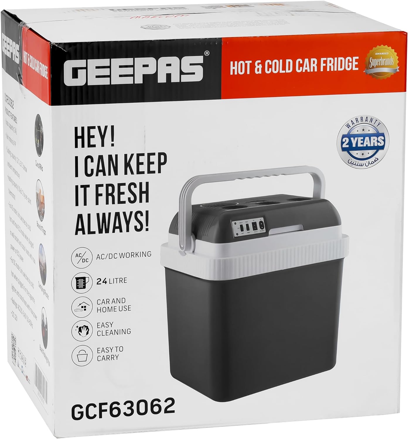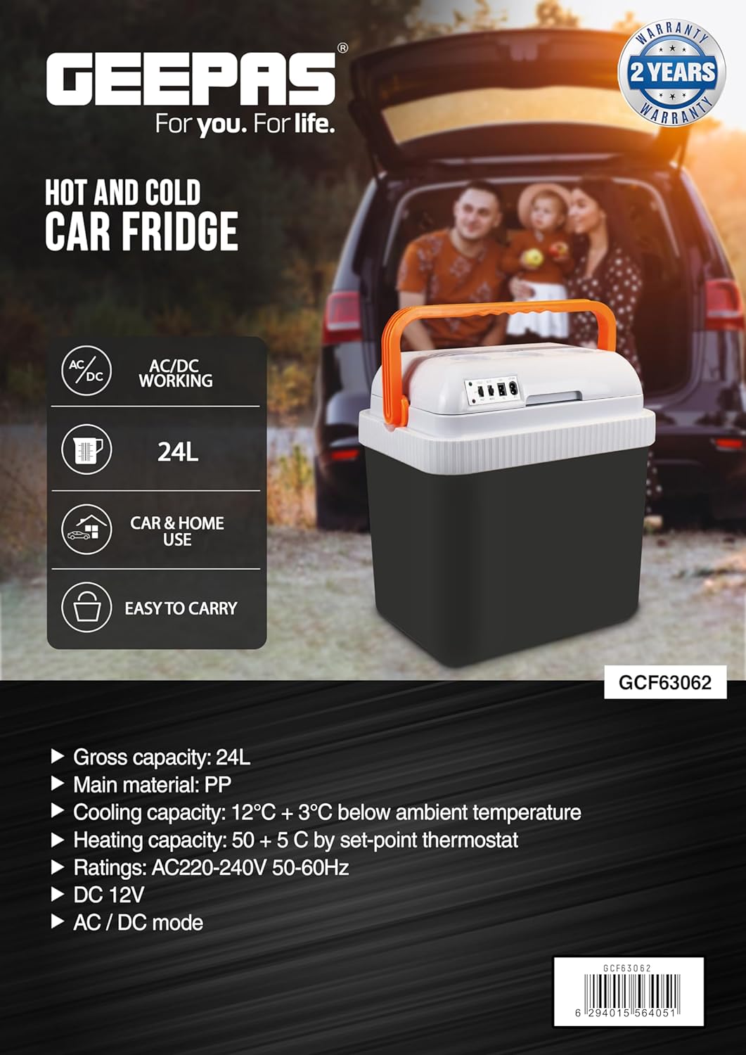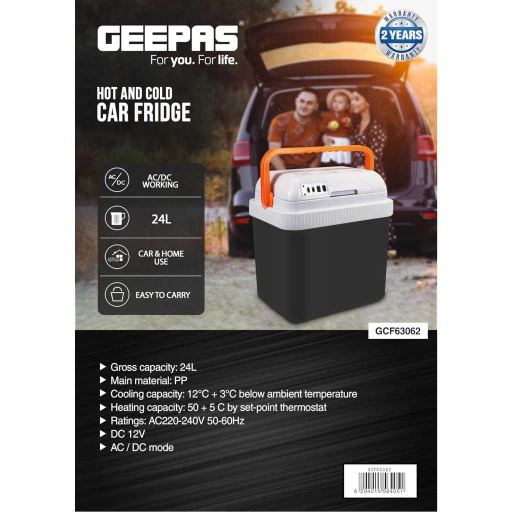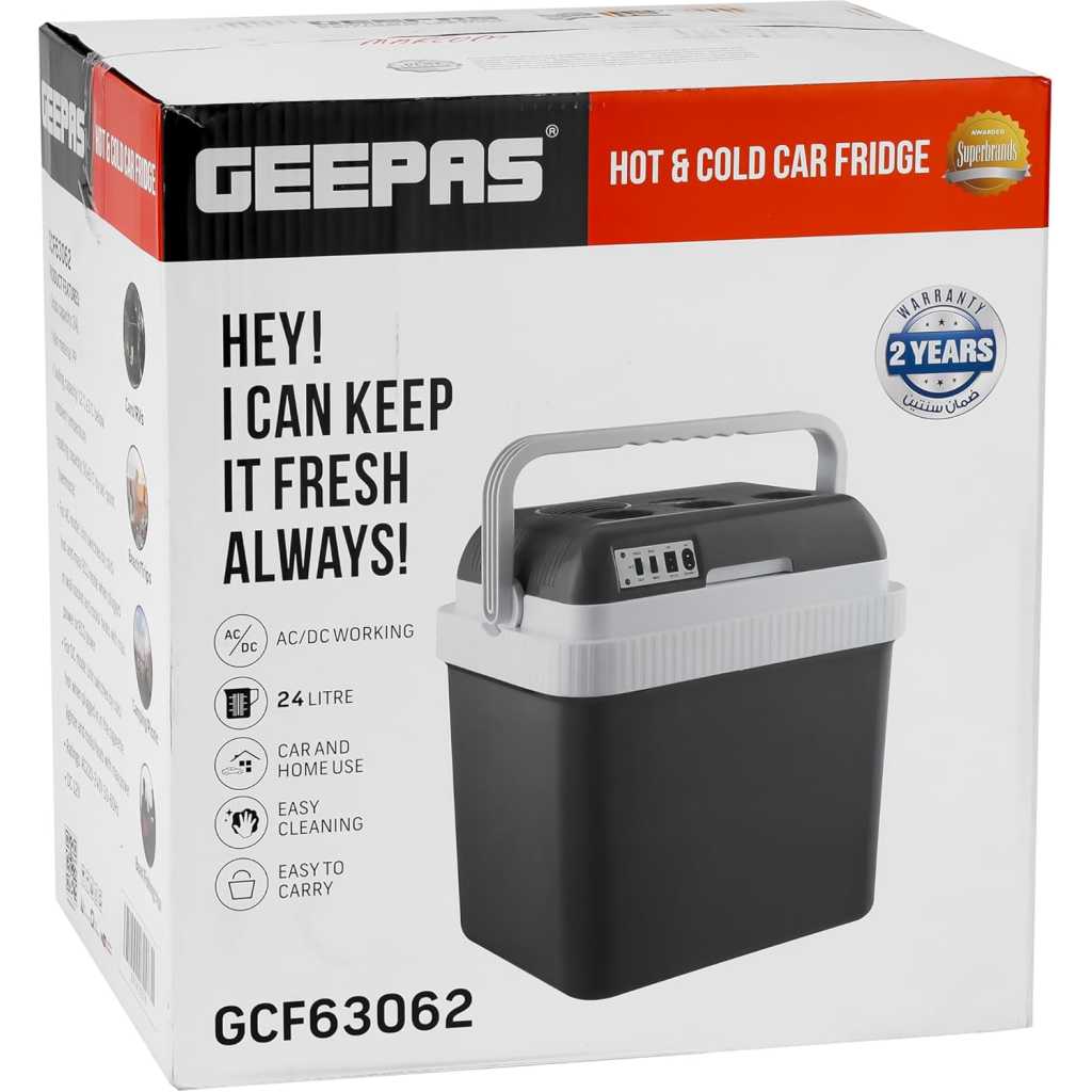 Geepas Hot & Cold Car Fridge | 24L Easy to carry, Portable Mini Cooler & Warmer for Drinks | For Bedroom, Home, Caravan, Car | GCF63062. Embrace the heat and keep chilling outdoors this summer with the Geepas hot and cold car fridge. This car fridge is made from the highest quality materials and is the perfect companion for your summer outdoor camping with your friends and family. The car fridge has a cooling capacity of 12C + 3C below ambient temperature and a heating capacity of 50 + 5C by set-point thermostat. The car fridge has a large capacity of 24.0 L and can easily accommodate multiple bottles at the same time, making it a smart choice for group camping and suitable for home and car use. The safe and hygienic food-grade PP material provides a safe and healthy option to carry food, cold drinks, etc. The hot and cold car fridge has an attached handle and is perfect to carry for camping, barbecues, picnics, and so on. The fridge is specially engineered to preserve the freshness and flavor of the contents inside for long hours and keep the contents chilled for a longer period of time. Its quality construction, vibrant black color, and utility features make it an appealing option. The hot and cold car fridge includes a 2-year manufacturer’s warranty.