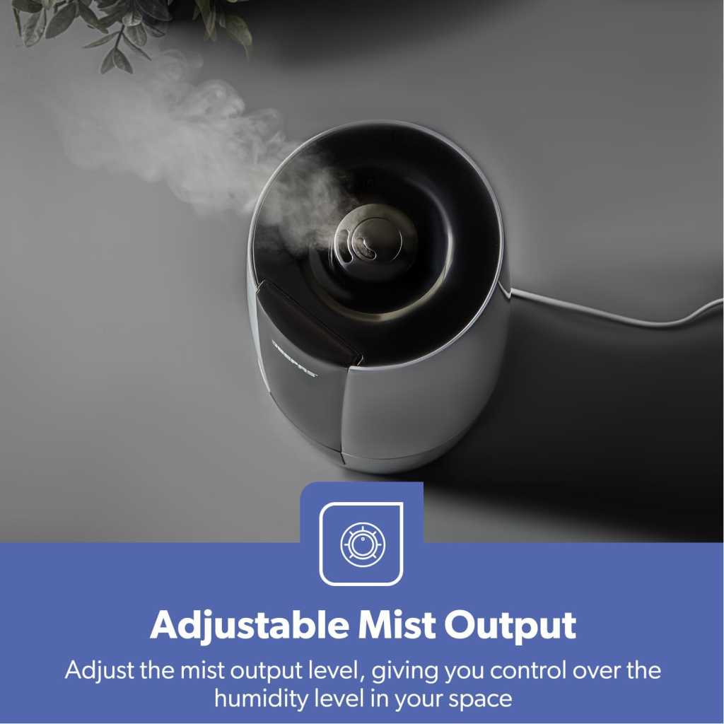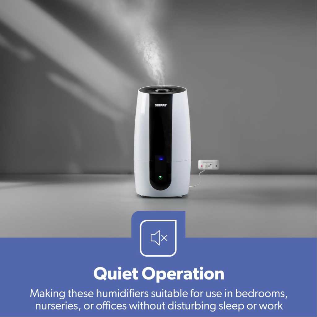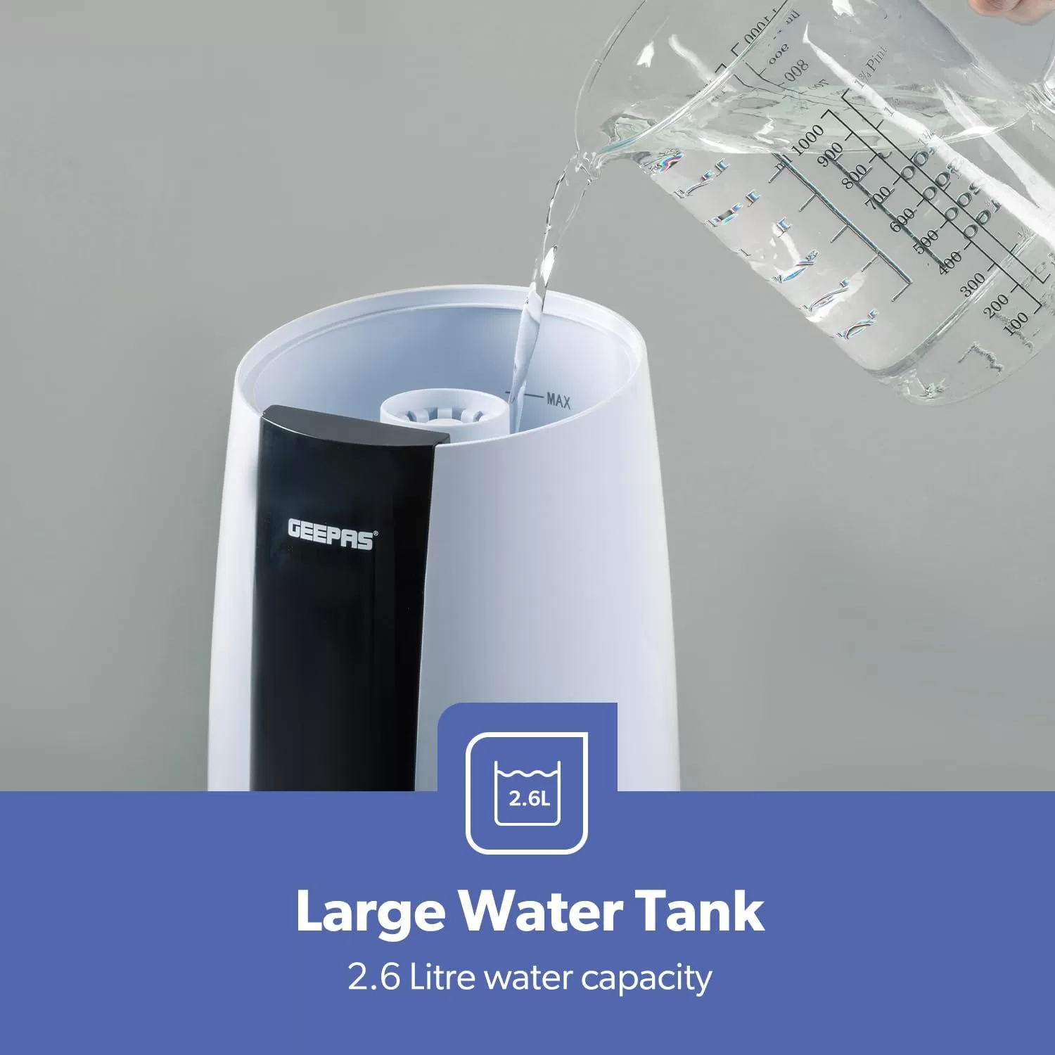 Key Features: ✅ 2.6 LITER CAPACITY WITH 360-DEGREE ROTATABLE NOZZLE – With a generous 2.6-liter water tank capacity, the GEEPAS Ultrasonic Humidifier ensures uninterrupted operation, eliminating the hassle of frequent refills. Maximum evaporation rate at 200 ml per hour. Its 360-degree rotatable nozzle allows for customizable mist dispersion, ensuring every corner of your room receives the perfect amount of moisture. ✅ NIGHT LIGHT, TWO-SPEED WITH TOUCH PANEL – Experience personalized comfort with the two-speed mist output adjustment feature, effortlessly controlled via the intuitive touch panel. Whether you prefer a gentle mist or a more robust output, this humidifier caters to your needs with precision. It comes with night light which can be switched off to have a peaceful sleep. ✅ AUTO STOP, BASE TRAY FOR AROMATIC OILS – Rest assured with the auto-stop function, which automatically shuts off the humidifier when the water tank is empty, enhancing safety and conserving energy. And for added ambiance, utilize the base tray to infuse your space with your favourite aromatic oils, creating a personalized oasis of relaxation. ✅ LARGE COVERAGE, ADVANCED PP AND CERAMIC FILTERS – Designed for spaces up to 10 square meters, this humidifier is perfect for bedrooms, offices, nurseries, and more. And with its advanced PP and ceramic filters, it purifies and softens water before dispersing it into the air, ensuring clean and hygienic mist for you and your family. ✅ 35db NOISE LEVEL, 2 YEARS WARRANTY – Say goodbye to dry air discomfort with the cool mist operation, providing refreshing moisture without altering room temperature. Plus, with a maximum noise level of just 35dB, enjoy whisper-quiet operation day and night.