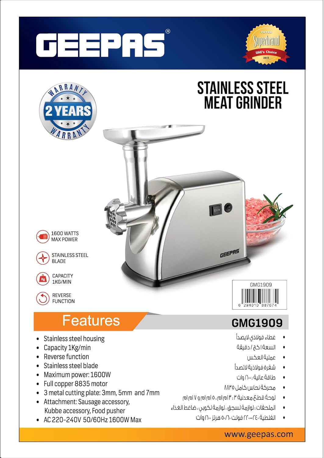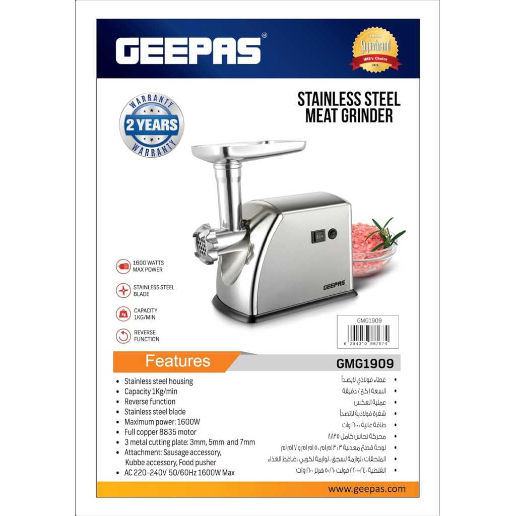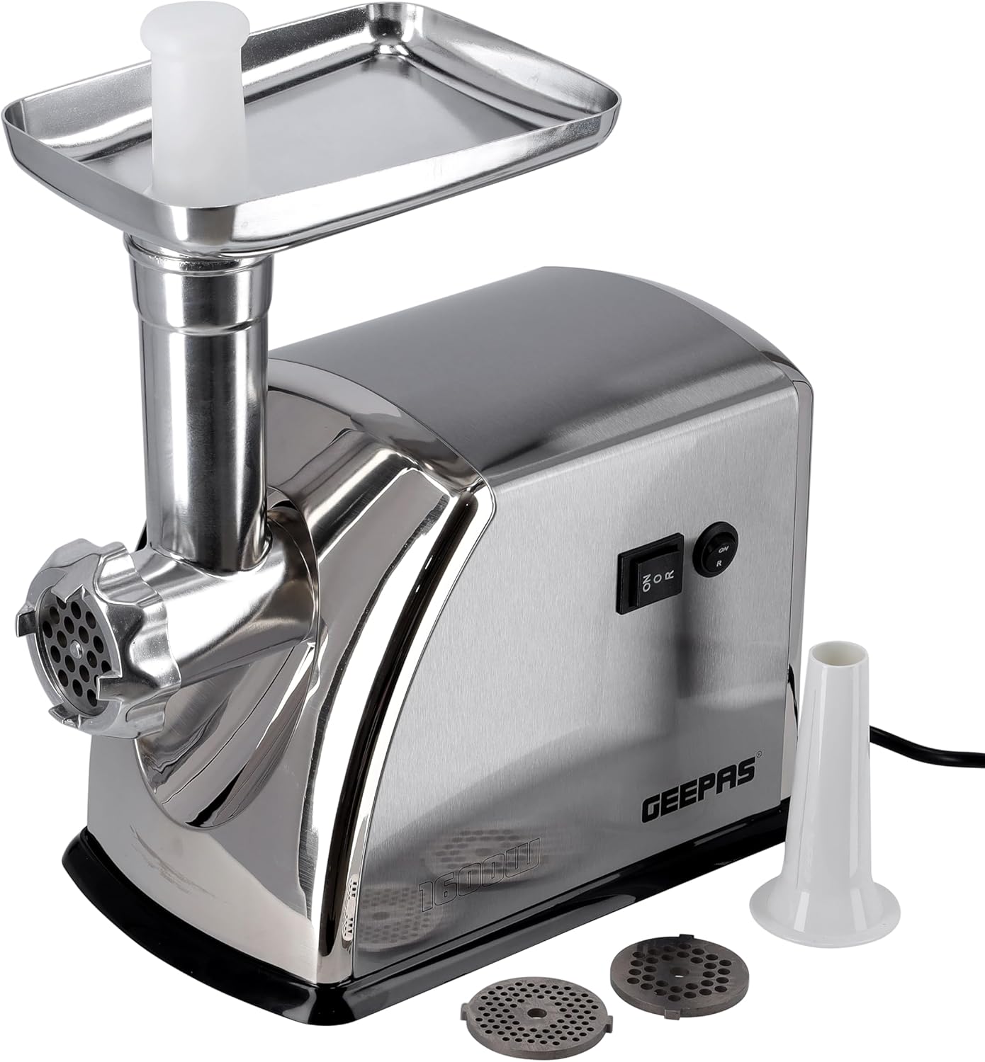No family feast can pass without meat dishes. It can be baked chicken, various meat pies or meatballs. For the preparation of such wonderful dishes, it requires mince. Making stuffing on your own for a long time and energy-consuming, and buying ready-made is sometimes more expensive than doing. Also, the ingredients of purchased lamb mince or any other are not always known and may be harmful to health. Geepas electric mincer can help with the preparation of nutritious meat dishes. This amazing helper will simplify the process of grinding lamb, veal or beef meat or other similar products. With this, you can chop peppers or mushrooms and use them to make sausages. This food mincer can translate into life any of your culinary ideas, which will not waste your efforts and time. 1. SAUSAGE MAKER – The special nozzle of the mincer machine for sausage is also included in the kit. You can diversify your diet with delicious homemade sausage, which will accommodate the ingredients you want for you. It will take little time and will be much cheaper than buying sausage every time in the store. Now your every day can begin with a piece of delicious meat dish. 2. 3 METAL CUTTING PLATES – Cooking minced meat is even easier and cheaper now. You do not have to buy additional accessories or blades for this food maker. The set includes 3 cutting blades in different sizes, namely 3 mm, 5 mm and 7 mm. This will allow you to choose between coarse, medium and fine grinding of mince beef or veal. 3. PROPER NUTRITION – Your homemade sausage can be tasty and healthy with the meat grinder. When cooking, you can add your own ingredients and control the level of fat in the dish. This will allow you to prepare healthy and nutritious sandwiches and burgers. Thanks to this food mill, you can cook dishes according to your family recipes and please your whole family. 4. PACKAGE INCLUDES – Sausage Accessory, Kubbe Accessory, and Food Pusher.