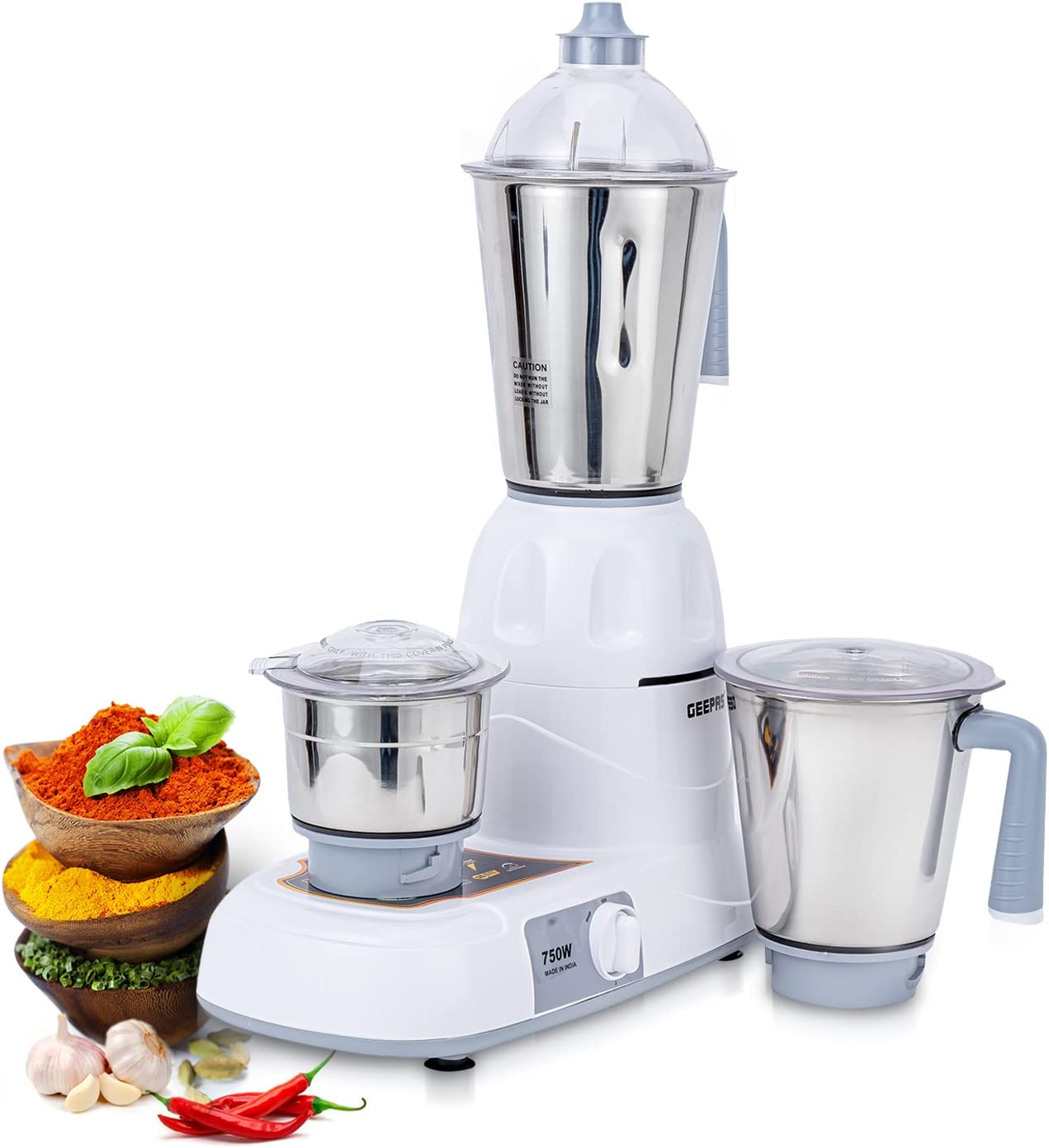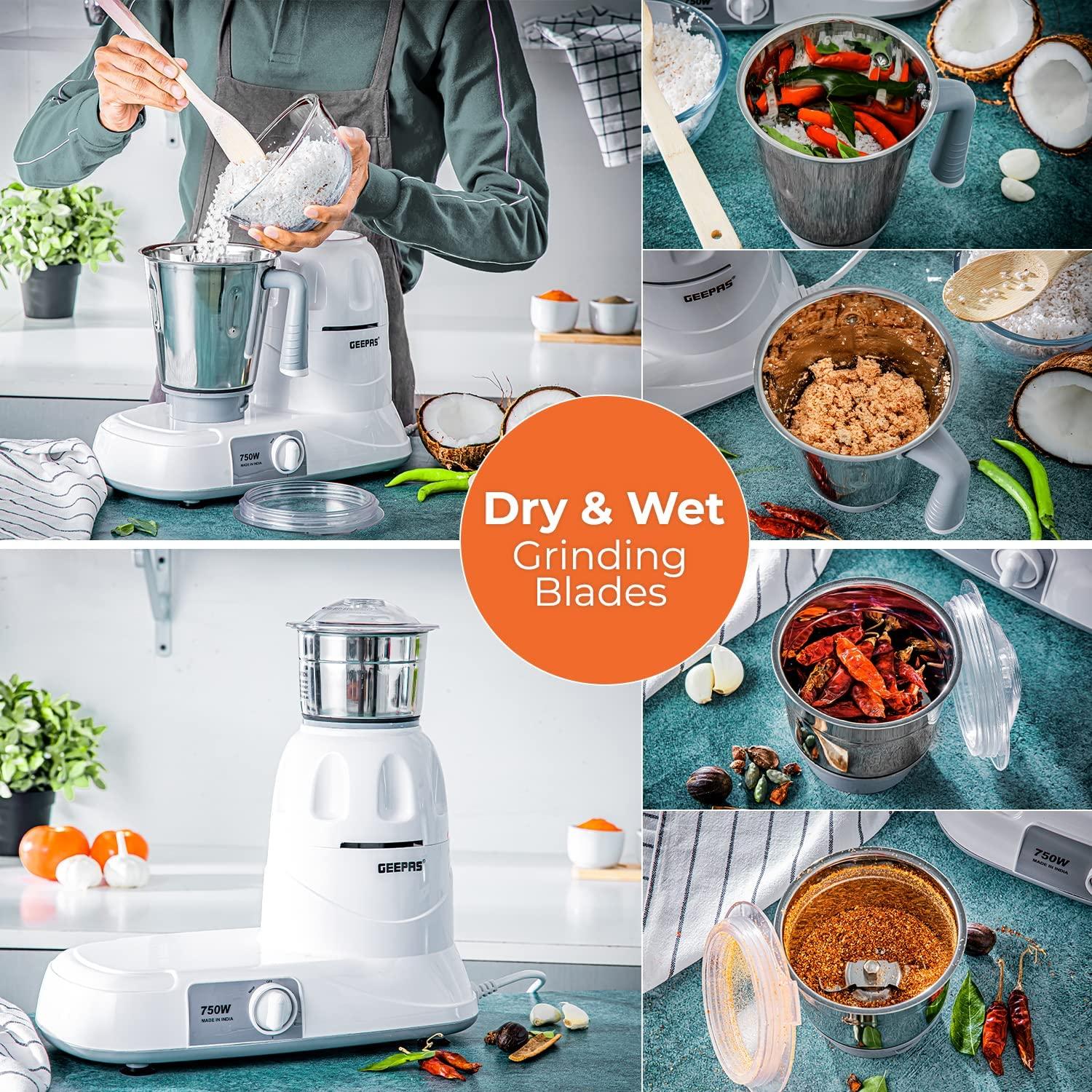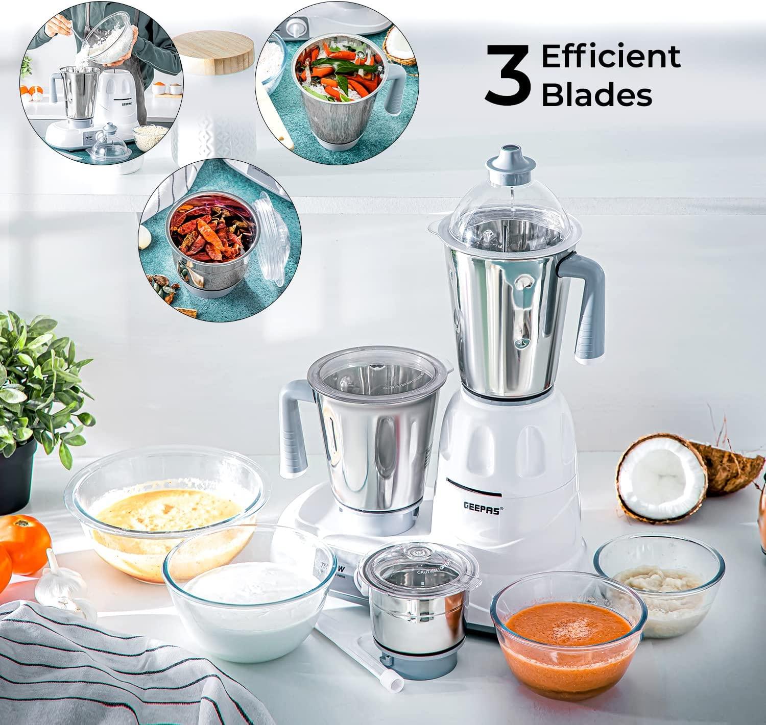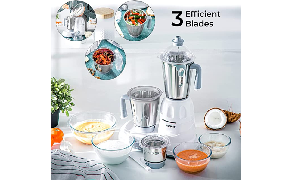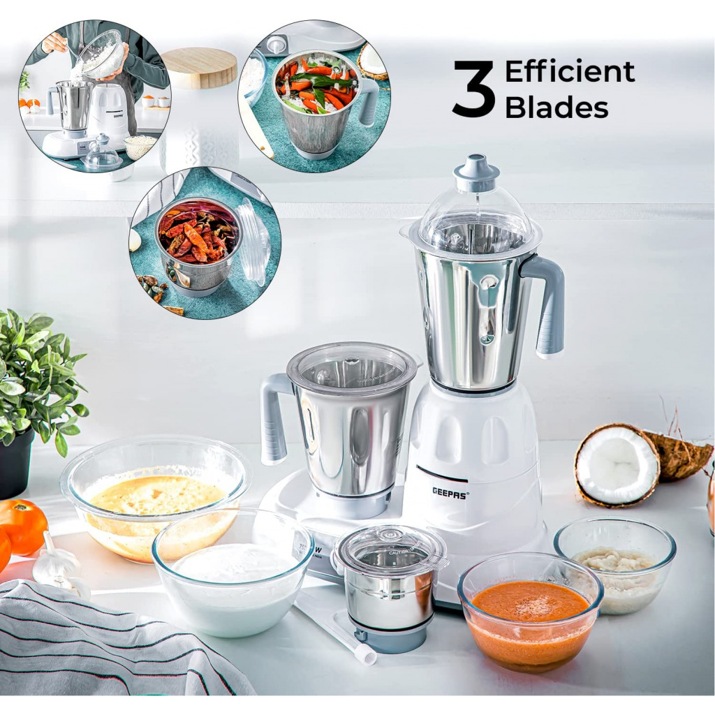 Geepas Mixer Grinder With 3 Jars, Multi Color – GSB5081, Plastic Material Making Grinding fast and simple with Geepas Mixer Grinder The grinder comes with 3 stainless steel jars with stainless steel blades for fast and fine grinding and blending, ideal for dry grinding, wet grinding and batter making. All jars come with unbreakable see through polycarbonate jar lids to prevent any leaks while operating. With its twist lock jar and motor unit with nylon couplings this grinder is really durable and sturdy. Use this appliance to prepare smooth gravies, chutneys, fine spice powders and a lot more. A stay cool base motor unit with vacuum rubber feet make it safe while operating and allow vibration free grinding. High Gloss Abs Body Made up of durable material yet light weight with glossy attractive look which is even easy to clean. It is well known for its sturdiness. 3 Speed Dial Switch the dial as you need the blending with the powerful motor gives you a fine grinding of the hard ingredients in just few minutes and saves time while your cooking. Note – Ensure all components are properly locked before switching on the machine. Key Features: Geepas Mixer Grinder With 3 Jars, Multi Color – GSB5081, Plastic Material The Geepas Mixer enables you to prepare your meals with ease and comfort. You just need to load the necessary ingredients into the convenient jars & adjust the appropriate speed. With 750W motor it effortlessly blends species, garlic, onion, salsa, sauces and the toughest ingredients for your easy cooking It has 3 convenient stainless steel grinder jugs with fixed blades for different applications. Made with a twist lock jar for safe use and durability. And the jar comes with unbreakable lids made up of polycarbonate, to create air tight seal for keeping your cooking place clean This Grinder mixer comes with Wet & Dry grinding stainless steel blades for fine grinding and mixing; making it easy to make smoothies, batters & purees. Keep control over your grinding and mixing blending creations with the three-speed functions This mixer grinder gives an efficient mixture of ingredients in the right consistency and with Sturdy handles the jugs are very comfortable to hold. Rubber feet make the mixer more stable & guarantee complete safety for your health Colors may vary. Item may come in white or red 2 Year manufacturer warranty