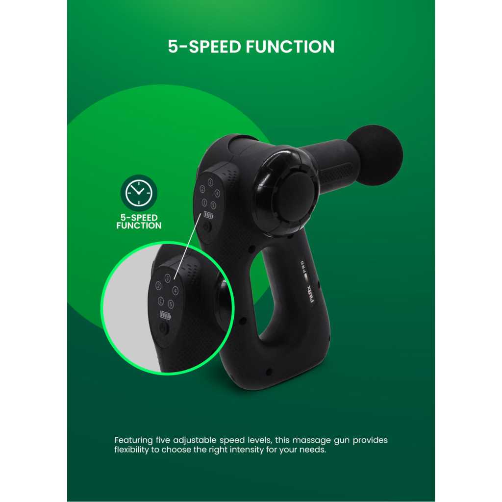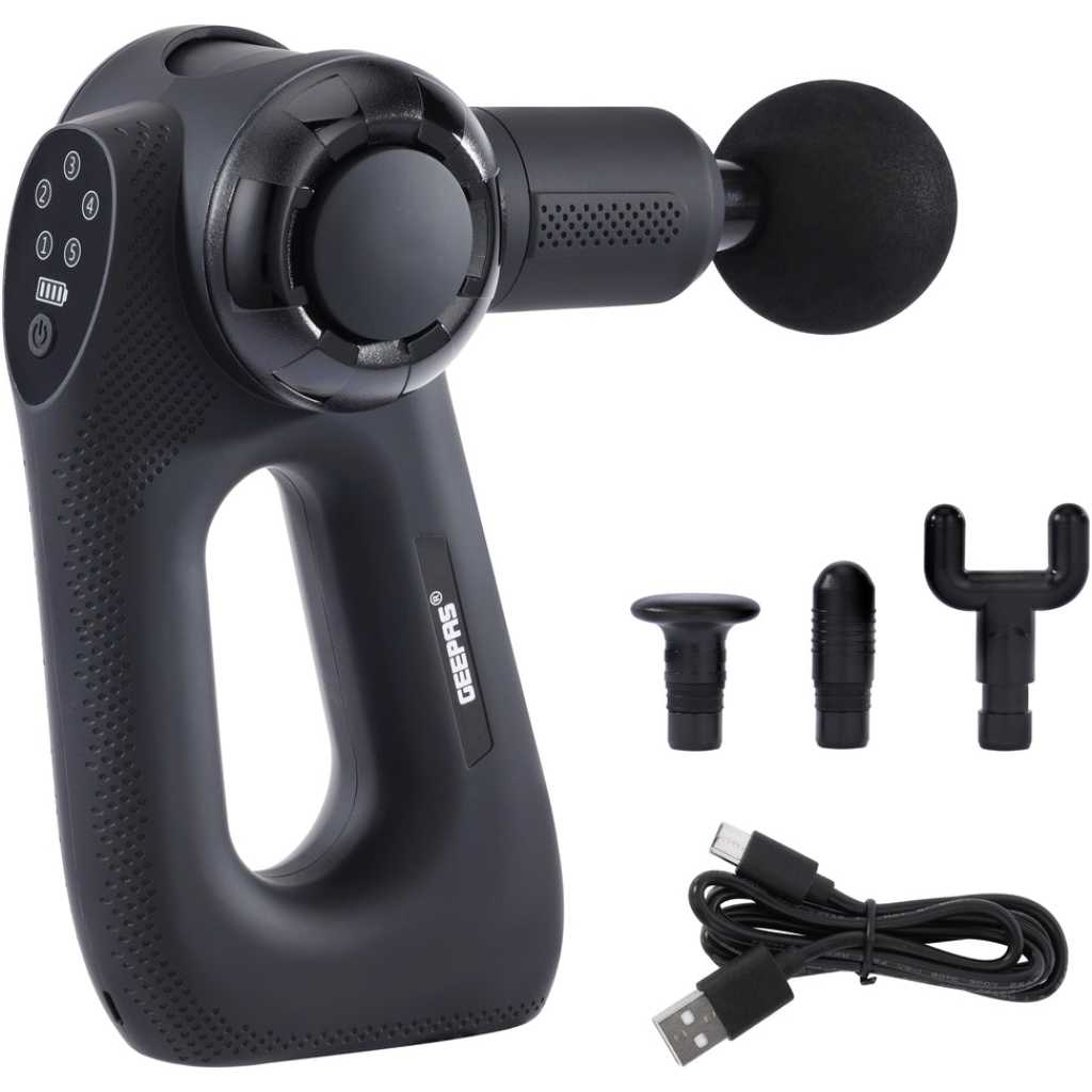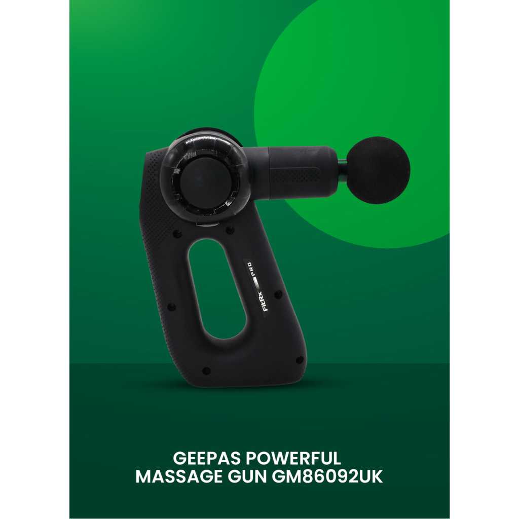 Geepas Powerful Massage Gun- GM86092UK/ 5-Speed Function, LED Indicator, Folding Design with 3 Adjustable AnglesBlack, 2 Years Warranty 5 SPEED FUNCTION: Featuring five adjustable speed levels, this Geepas massage gun provides flexibility to choose the right intensity for your needs. LED INDICATORS: The built-in LED indicators keep you informed about the battery status, speed levels, and charging progress FOLDING FUNCTION: Designed for convenience and portability, the massage gun features a folding function with three adjustable angles, allowing for customized comfort while massaging hard-to-reach areas. Plus, its compact foldable design makes it easy to store and carry. TECHNOLOGY: With its advanced quiet technology, this massage gun operates smoothly with minimal noise, making it suitable for use at home, the gym, or even at the office without disturbing others. POWERFUL BRUSHLESS HIGH TORQUE: Engineered with a high-torque brushless motor, this massage gun delivers consistent and powerful performance while maintaining durability for long-term use. PRODUCT COLOR: BLACK Targeted massage, custom comfort. The Geepas powerful massage gun will ensure deep penetration into your tissues and muscles and relieve stiffness, soreness, and spasms. It also reduces stress and boosts your overall well-being. With 4 interchangeable heads; round, flat, precision, and dualthe massage gun can be used anywhere in your body to treat stiffness, soreness, and tightness in muscles and tissues and regulate blood circulation. The massage gun works to improve your muscle mobility and your energy. Also, it increases your blood circulation and reduces stress, thus releasing endorphins. With five adjustable speed levels, you can customize the intensity, whether for a gentle massage or deep tissue relief. The LED indicators display battery status, speed levels, and charging progress, ensuring seamless operation. Its folding function with three adjustable angles provides customized comfort while making it easy to store and carry. Powered by a high-torque brushless motor, the massage gun delivers consistent and powerful performance for effective muscle relaxation. The Classic Quiet Smooth Technology ensures a low-noise operation, making it ideal for use at home, the gym, or the office. A built-in battery energy indicator helps monitor power levels, ensuring you’re always ready for your next massage session. The product is very user-friendly, as it comes with a non-slip handle for better grip. The modern massager aids in the activation of slowed-down muscle groups such as the thighs, hips, back, and other areas of the body, thereby accelerating recovery. The Geepas massage gun comes with a 2-year manufacturer’s warranty.