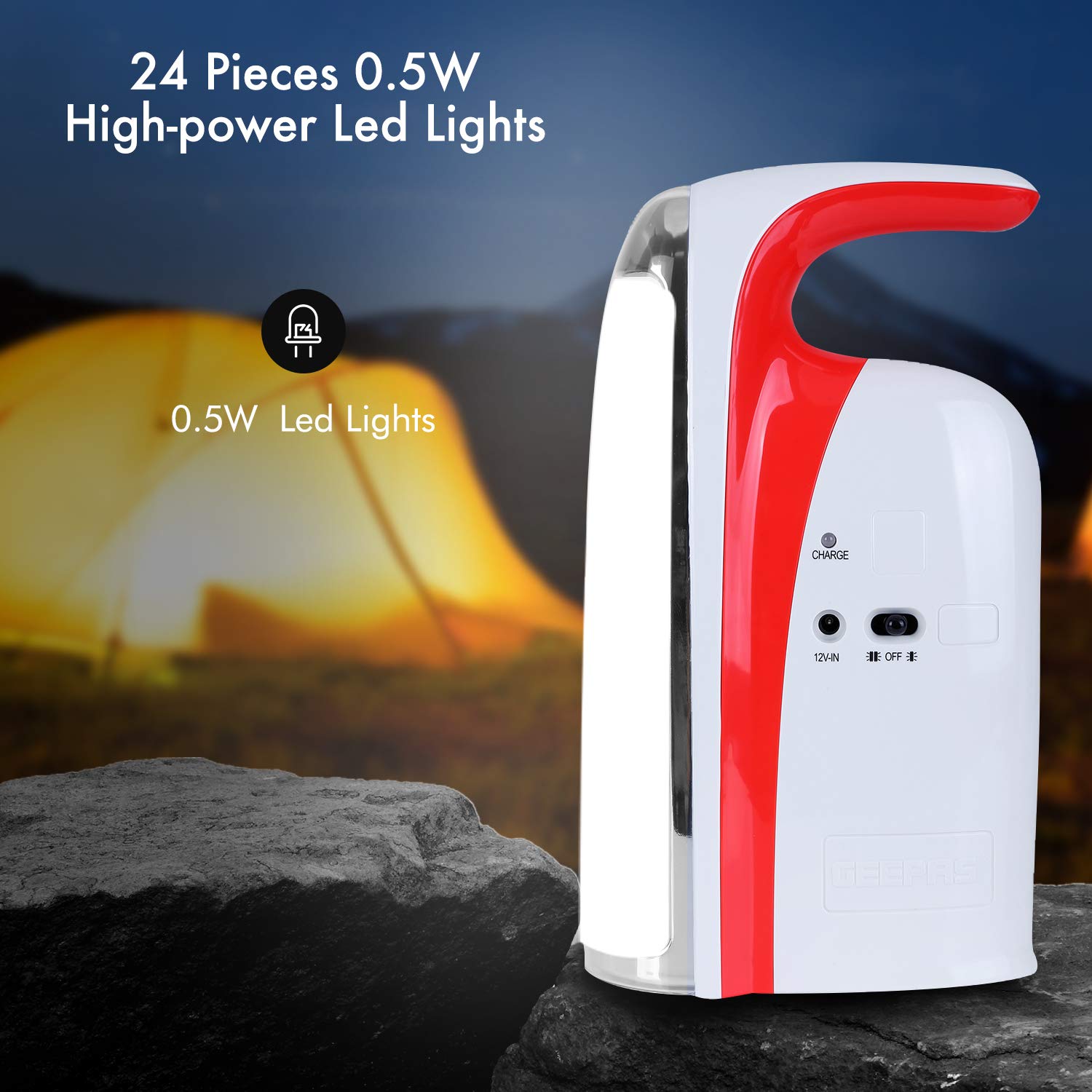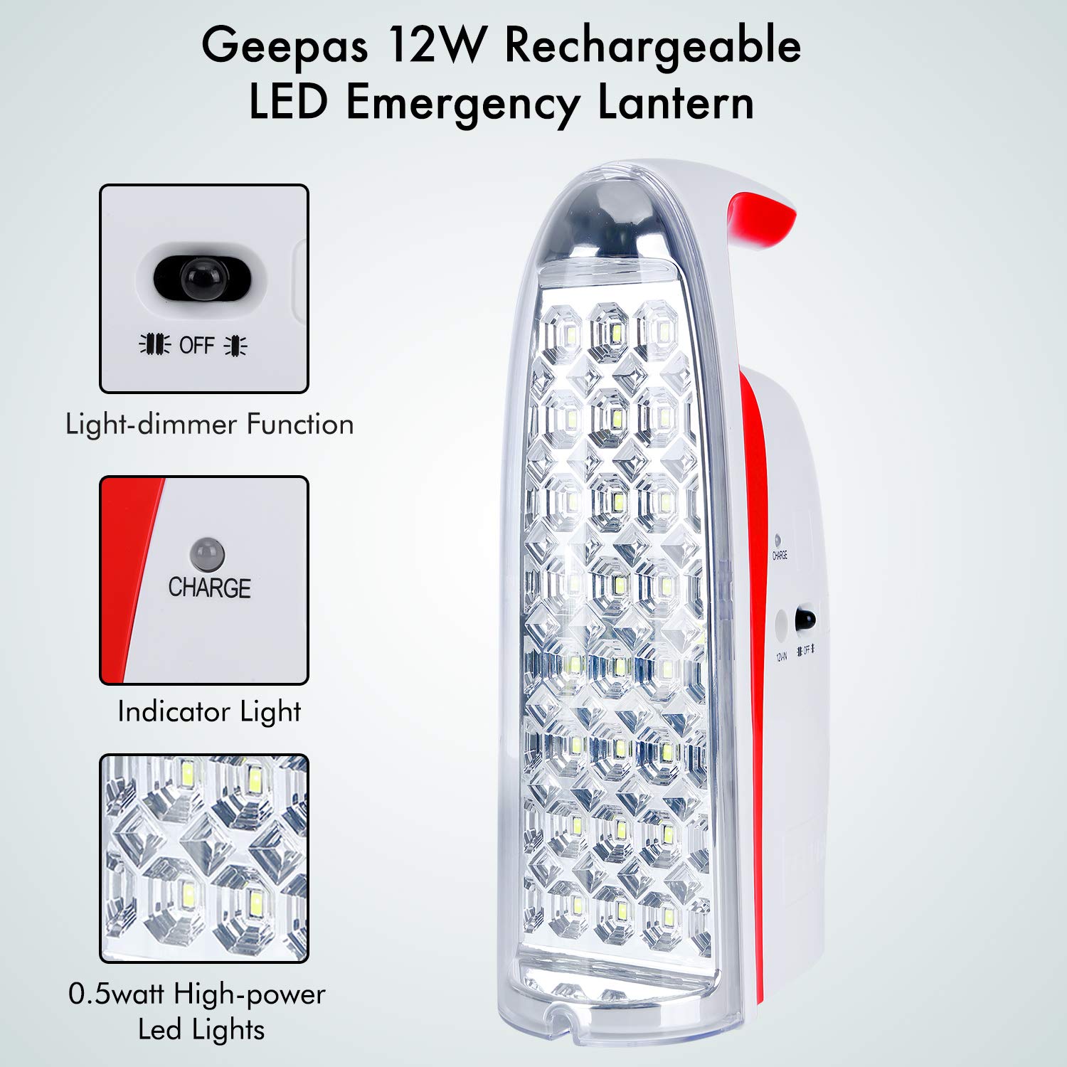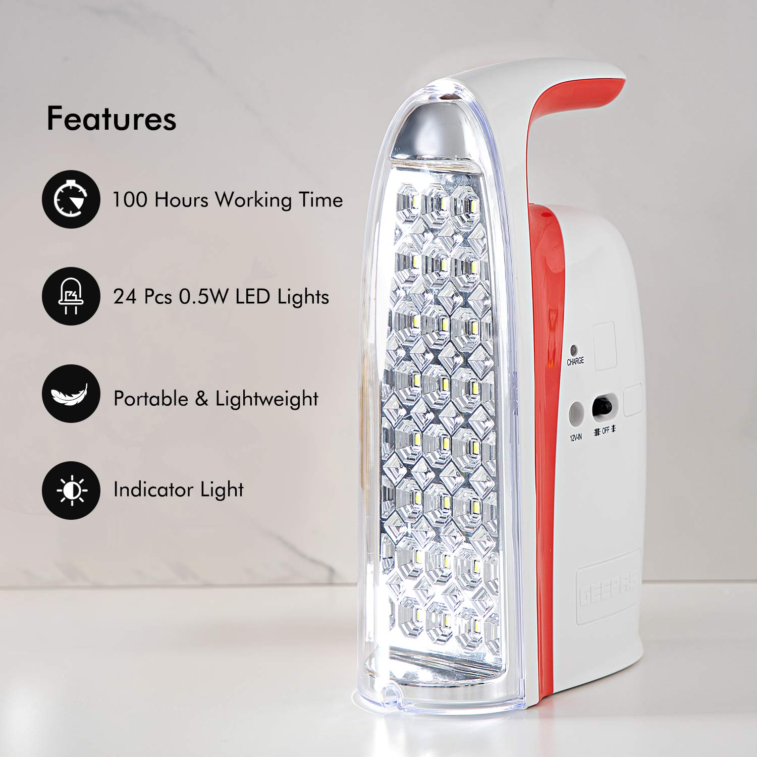 Geepas Rechargeable Led Lantern is ideal for indoor or outdoor use. Its features LEDs run cool, energy-efficient and stylish. Automatic emergency lighting during power failure. A graceful addition to your home or office. 4V3Ah sealed lead-acid rechargeable battery. Charge time:12-15 hours. 150 hours / Low light(24Pcs LED). 300hours / Low light(8Pcs LED). DC 12V input socket. Duration: 2 hours / Strong light(24Pcs LED). 3 hours/Strong light(8Pcs LED). Touch dimmer function. AC 220-240V 50/60Hz 12W. Key Features: Brand: Geepas Model Number: GE5571 Light Type: Emergency Lights Color: Yellow Certification: ESMA Certified Rechargeable Battery: 4 V 3 Ah LED Bulb: Yes LED Light: 24 LED Bulbs Charging time: 12-15 hours Rated Voltage: AC 220-240 V Operating Time: 3-150 hours Product Height: 30 cm Product Length: 17 cm Product Width: 9 cm