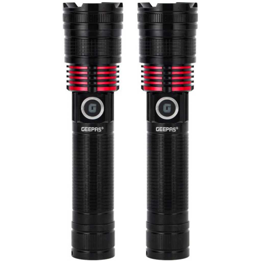 Geepas Rechargeable LED Flashlight- GFL4667/ Pack of 2, 15W, Perfect for Indoor and Outdoor Use, 5 Hours Continuous Working/ with Aluminum Housing, Lithium Battery/ Black
