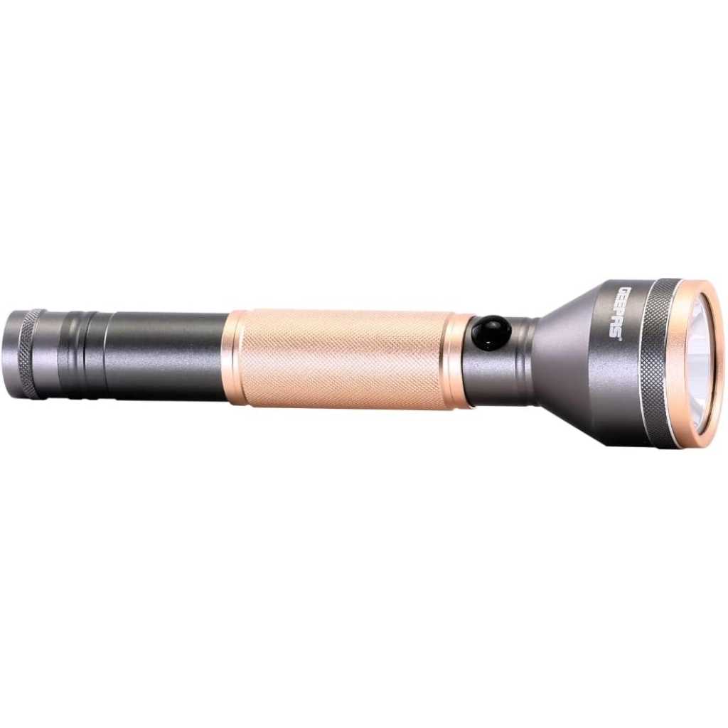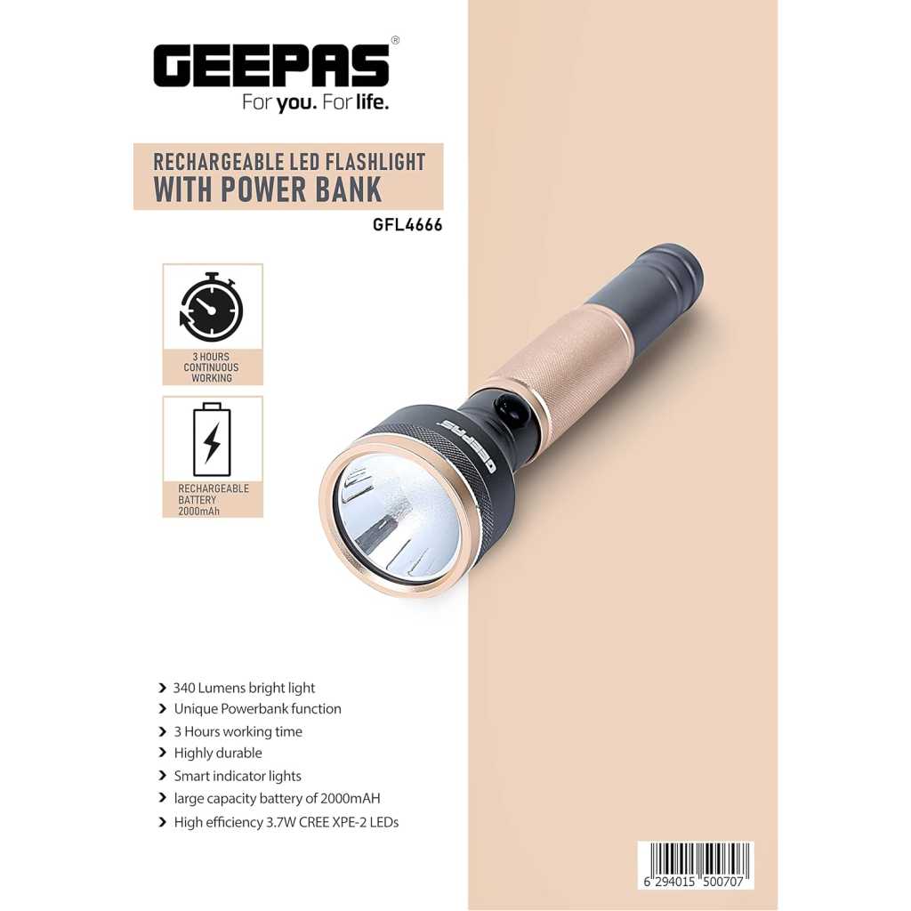 Key Features: 340 LUMENS BRIGHT LIGHT – Different from other torch lights, Geepas light is designed to enjoy a safe night riding, campaigning, power cut off, patrolling, and more with super bright lights, a nice companion at night. UNIQUE POWER BANK FUNCTION – Built-in rechargeable battery with USB port, serves as a convenient power bank portable charger output for fast charging your phone and other devices. The battery capacity of 2000 mAH has enough spare power to escort you when you are outdoors. 3 HOURS WORKING TIME – This torch has a huge battery of 2000mAh and it gets fully charged in 6 hours. It has 3 hours of continuous working time HIGHLY DURABLE – Made up of highly resistant aviation aluminum alloy, making them extra durable wherever you may be. Superior design and construction allow our lights to be super lightweight and compact. SMART INDICATOR LIGHTS -This torch has a charge indicator light to easily understand battery status. It will show red light while charging and turns to green when it’s fully charged.